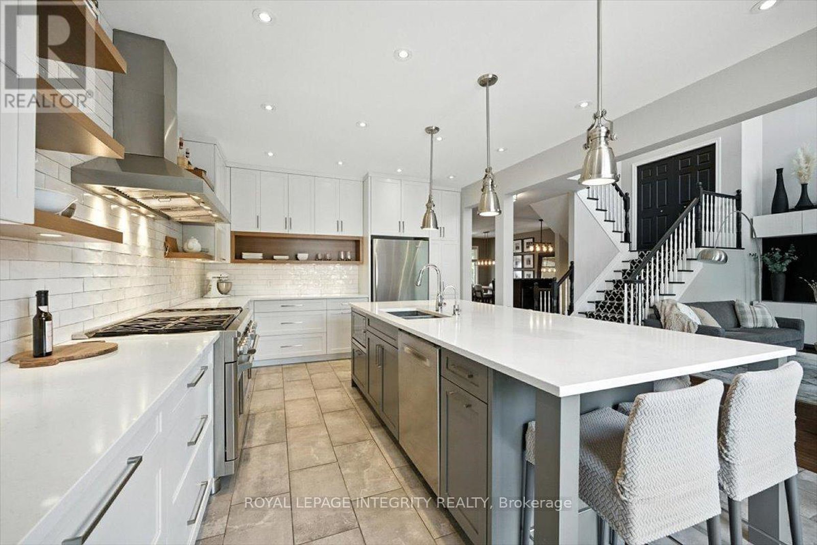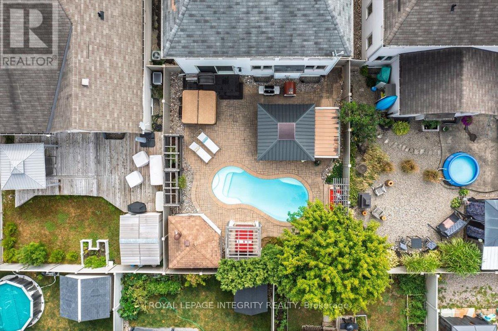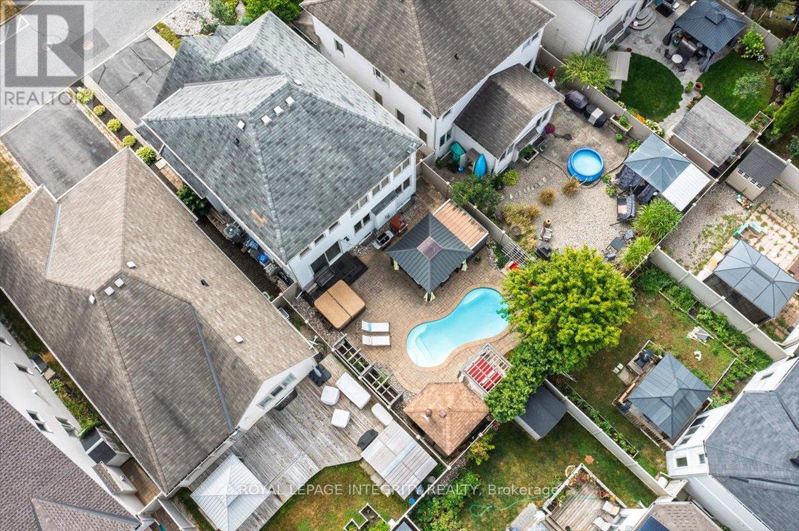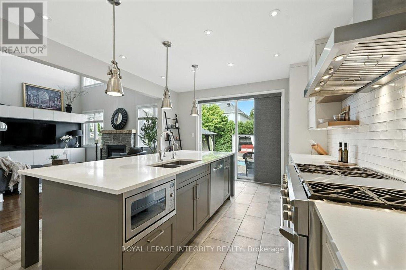 Stunning 4-bedroom, 3-bathroom renovated home with a backyard oasis! The extended interlock driveway and charming front porch create gorgeous curb appeal before stepping inside to an inviting foyer and a bright, functional layout. Gleaming hardwood floors enrich the formal living and dining areas, with a stylish bar accenting the space. Pass by the convenient mudroom/laundry with garage access adding practicality before making your way to the heart of the home. Located at the back of the home, discover a breathtaking redesigned kitchen with white cabinetry, open wood shelving, subway tile backsplash, quartz counters, and an impressive 114" island comfortably seating six, all overlooking the grand family room with fireplace and soaring ceilings open to the second floor. Upstairs, hardwood continues into the spacious primary suite with custom built ins maximizing storage while keeping a sleek, streamlined look to the primary bedroom, along with a walk-in closet and an updated ensuite featuring a glass shower and dual vanity. Three additional bedrooms and a full bathroom complete the level. The finished basement includes a versatile family room with barn-door closets, a bonus gym (or potential 5th bedroom), and generous storage. Step outside to your private retreat with a fully landscaped yard, in-ground pool, gazebo with bar, fridge and TV, garden beds, and a storage shed - perfect for entertaining or relaxing with family. Tucked away on a quiet street and ideally located near schools, parks, shopping, and all amenities, this home is sure to impress and is ready for its new family to enjoy!