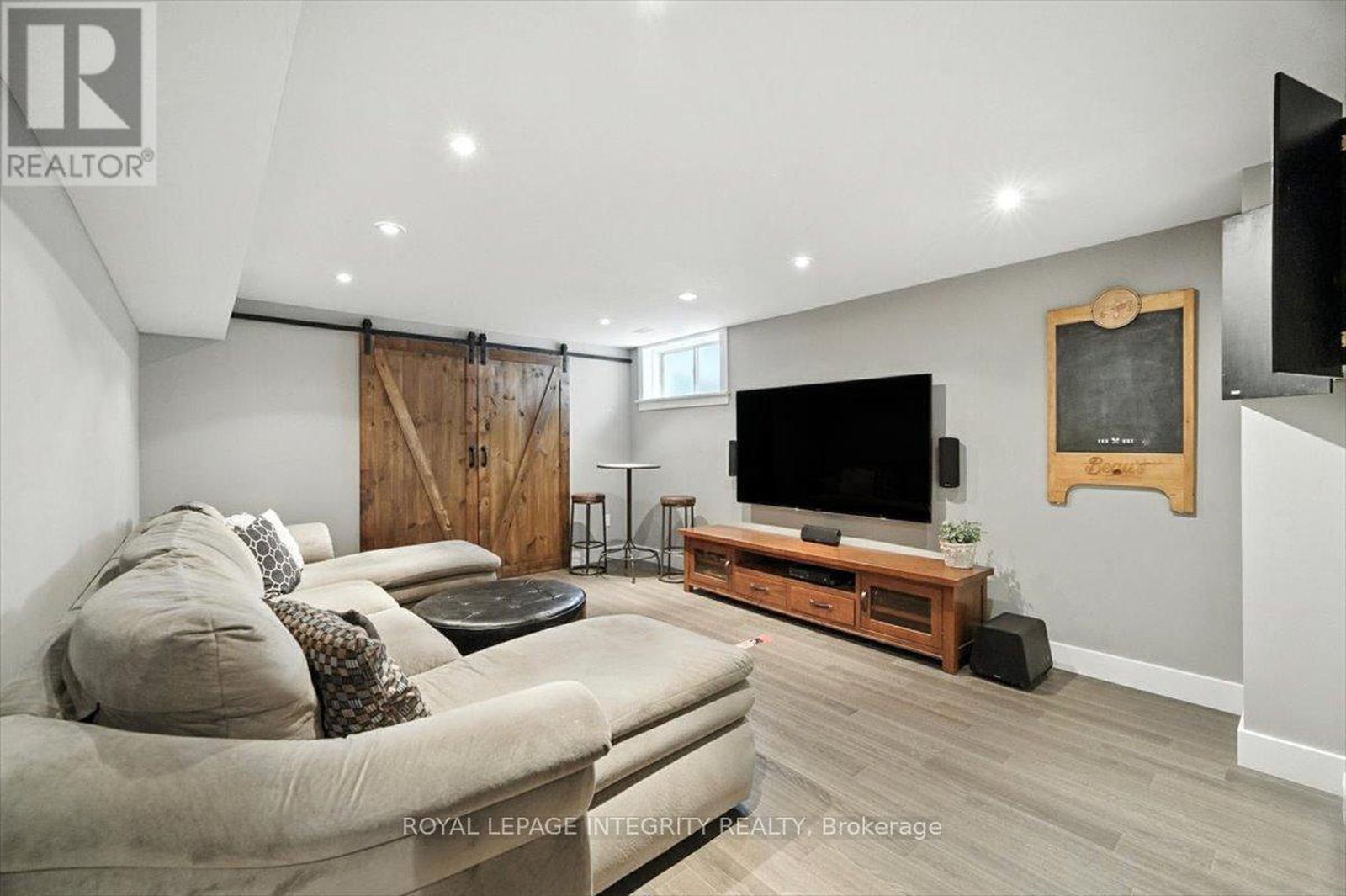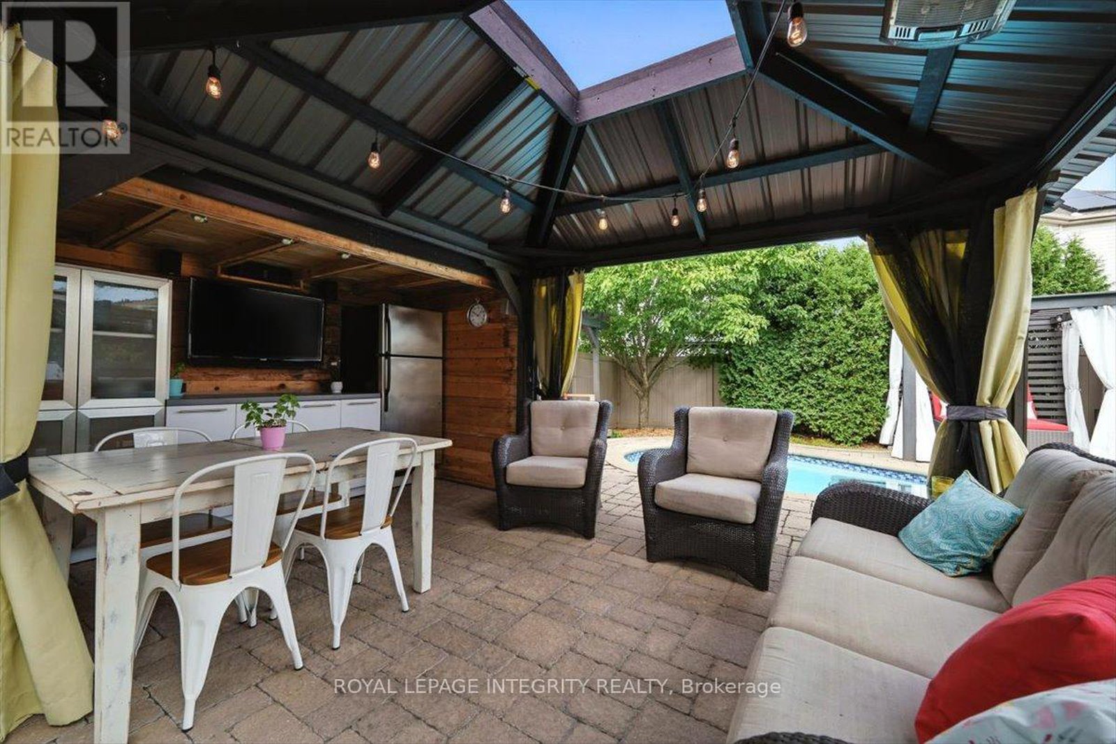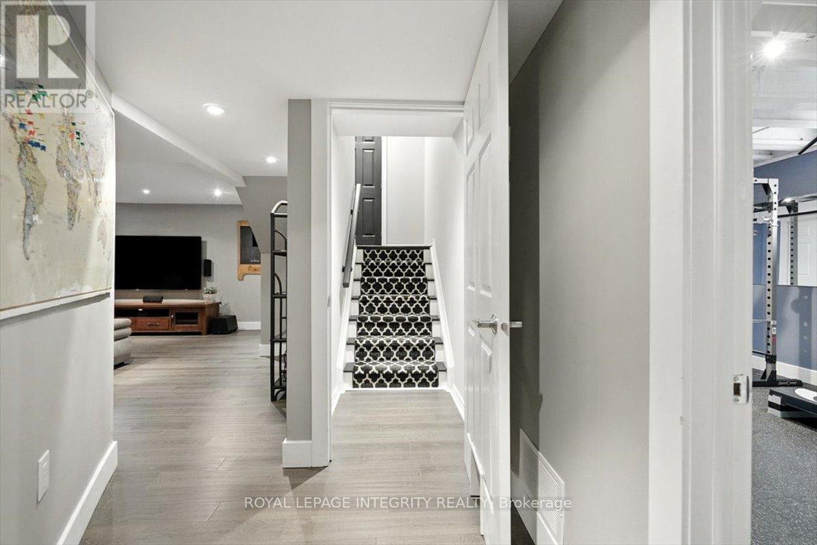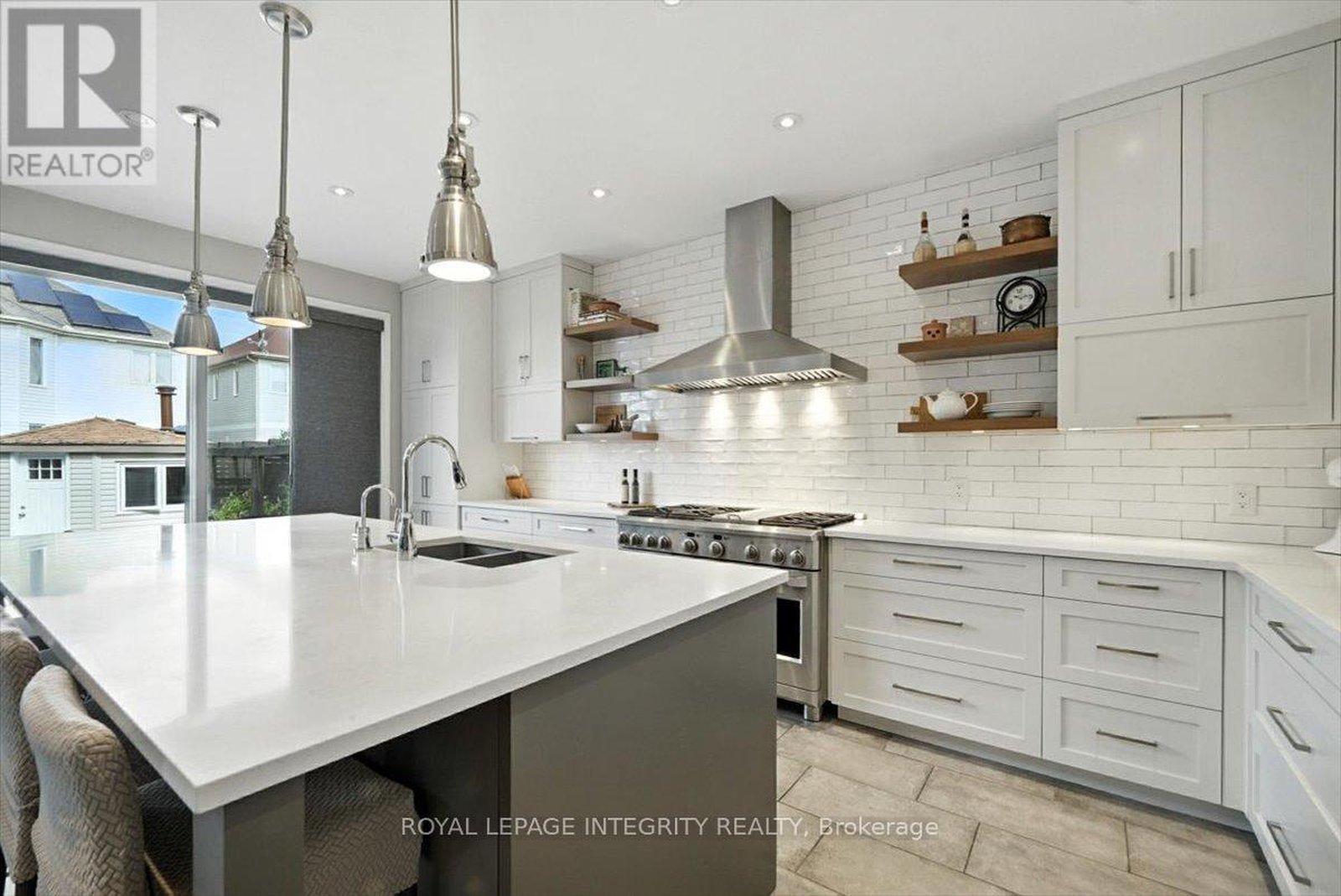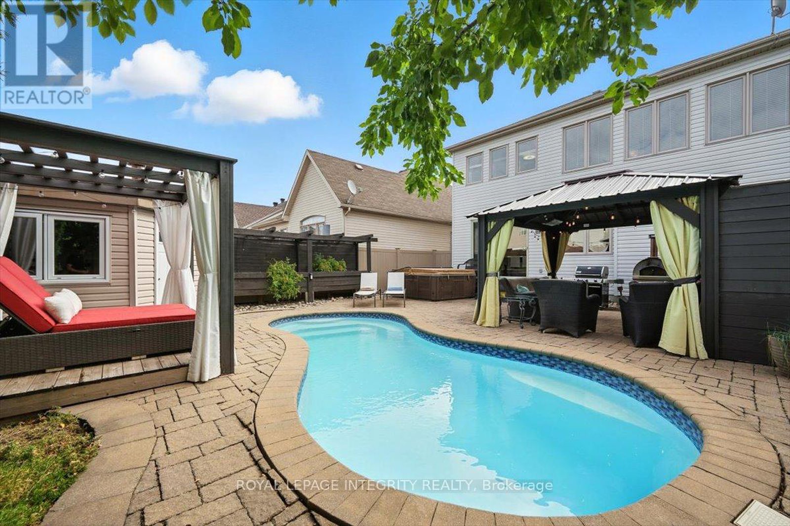 Stunning 4-bedroom, 3-bathroom renovated home with a backyard oasis! The extended interlock driveway and charming front porch create gorgeous curb appeal before stepping inside to an inviting foyer and a bright, functional layout. Gleaming hardwood floors enrich the formal living and dining areas, with a stylish bar accenting the space. Pass by the convenient mudroom/laundry with garage access adding practicality before making your way to the heart of the home. Located at the back of the home, discover a breathtaking redesigned kitchen with white cabinetry, open wood shelving, subway tile backsplash, quartz counters, and an impressive 114" island comfortably seating six, all overlooking the grand family room with fireplace and soaring ceilings open to the second floor. Upstairs, hardwood continues into the spacious primary suite with custom built ins maximizing storage while keeping a sleek, streamlined look to the primary bedroom, along with a walk-in closet and an updated ensuite featuring a glass shower and dual vanity. Three additional bedrooms and a full bathroom complete the level. The finished basement includes a versatile family room with barn-door closets, a bonus gym (or potential 5th bedroom), and generous storage. Step outside to your private retreat with a fully landscaped yard, in-ground pool, gazebo with bar, fridge and TV, garden beds, and a storage shed - perfect for entertaining or relaxing with family. Tucked away on a quiet street and ideally located near schools, parks, shopping, and all amenities, this home is sure to impress and is ready for its new family to enjoy!