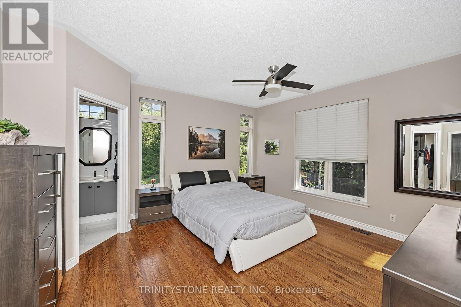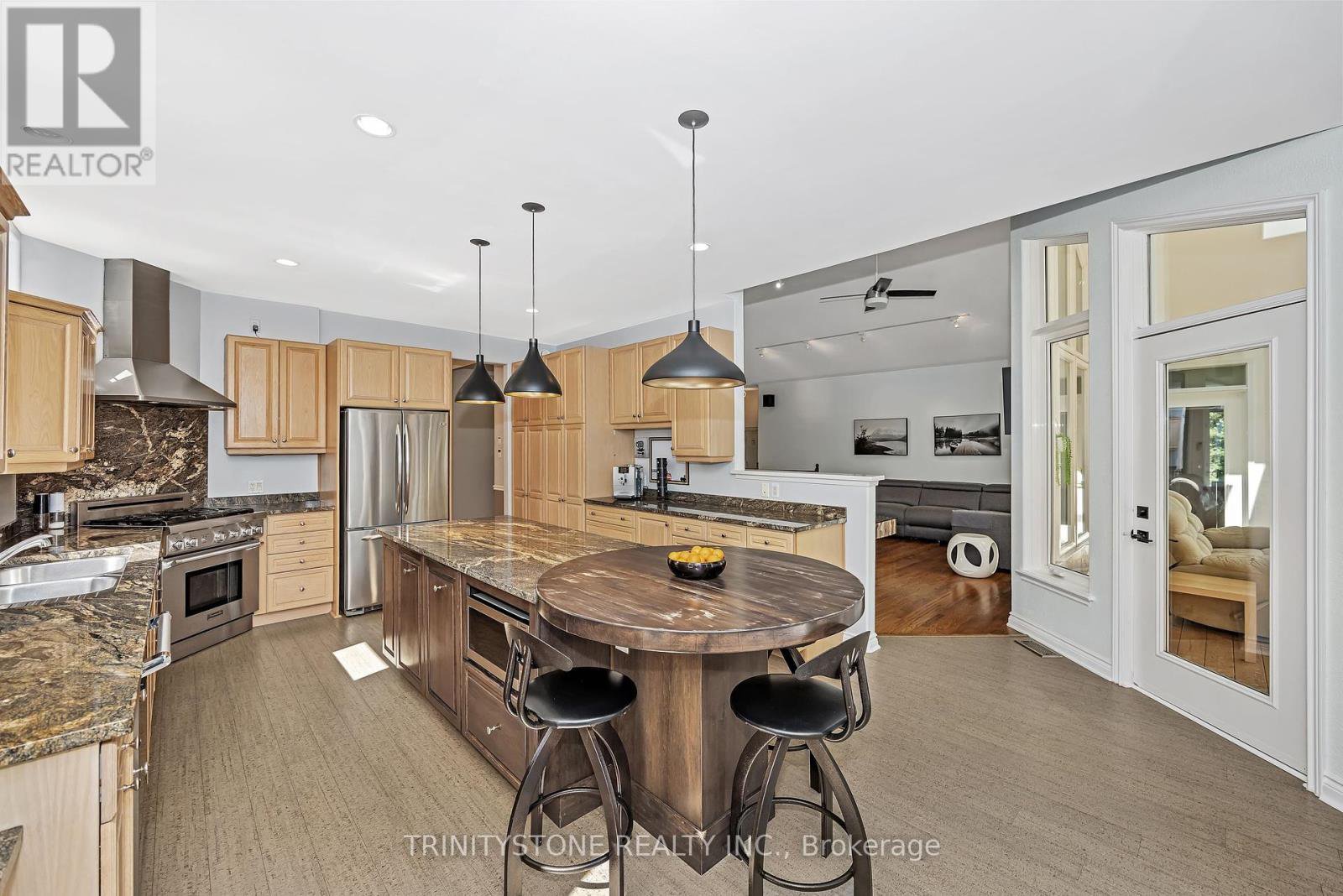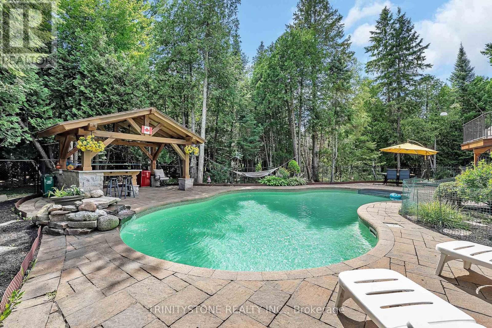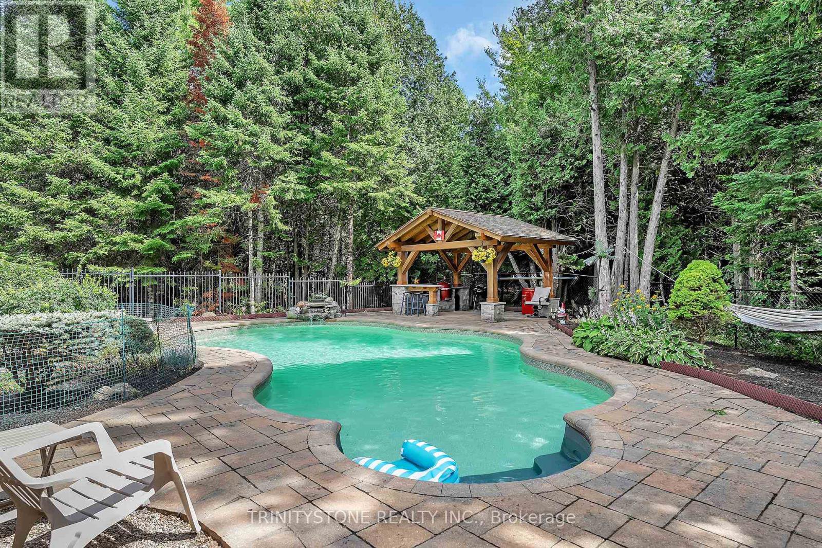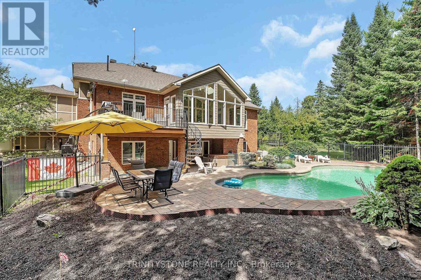 Welcome to this exceptional custom-built bungalow, perfectly nestled on a 2.3 Acre treed lot in a sought-after golf club community! A long, private driveway surrounded by lush landscaping offers ample parking and sets the tone for this inviting property. Step inside to a spacious foyer that opens to a bright and expansive living room, complete with a cozy fireplace and an abundance of natural light. The gourmet kitchen features stainless steel appliances, a breakfast bar, and generous cabinetry, seamlessly blending style and functionality. Adjacent to the kitchen, a sun-filled four-season sunroom with large windows invites you to take in the picturesque views of the backyard. The primary suite offers a walk-in closet and a luxurious 4-piece ensuite with dual sinks and a sleek glass shower. A potential fifth bedroom (or home office), an additional spacious bedroom, and a beautifully designed full bathroom with a freestanding tub and glass shower complete the main floor. A dedicated laundry room adds to the convenience of this level. The fully finished lower level feels like an extension of the main floor, with large windows providing plenty of natural light. Here, you'll find two additional bedrooms, a fitness room, a full 4-piece bathroom, and a walkout to the backyard. The backyard is a true private oasis, designed for relaxation and entertaining. Enjoy the upper-level deck perfect for gatherings, or retreat to the shaded walkout patio below. The stunning inground pool, complete with a waterfall feature, stone patio, and a large gazebo, offers a spa-like experience right at home. Schedule your exclusive showing today and see all this home has to offer!
