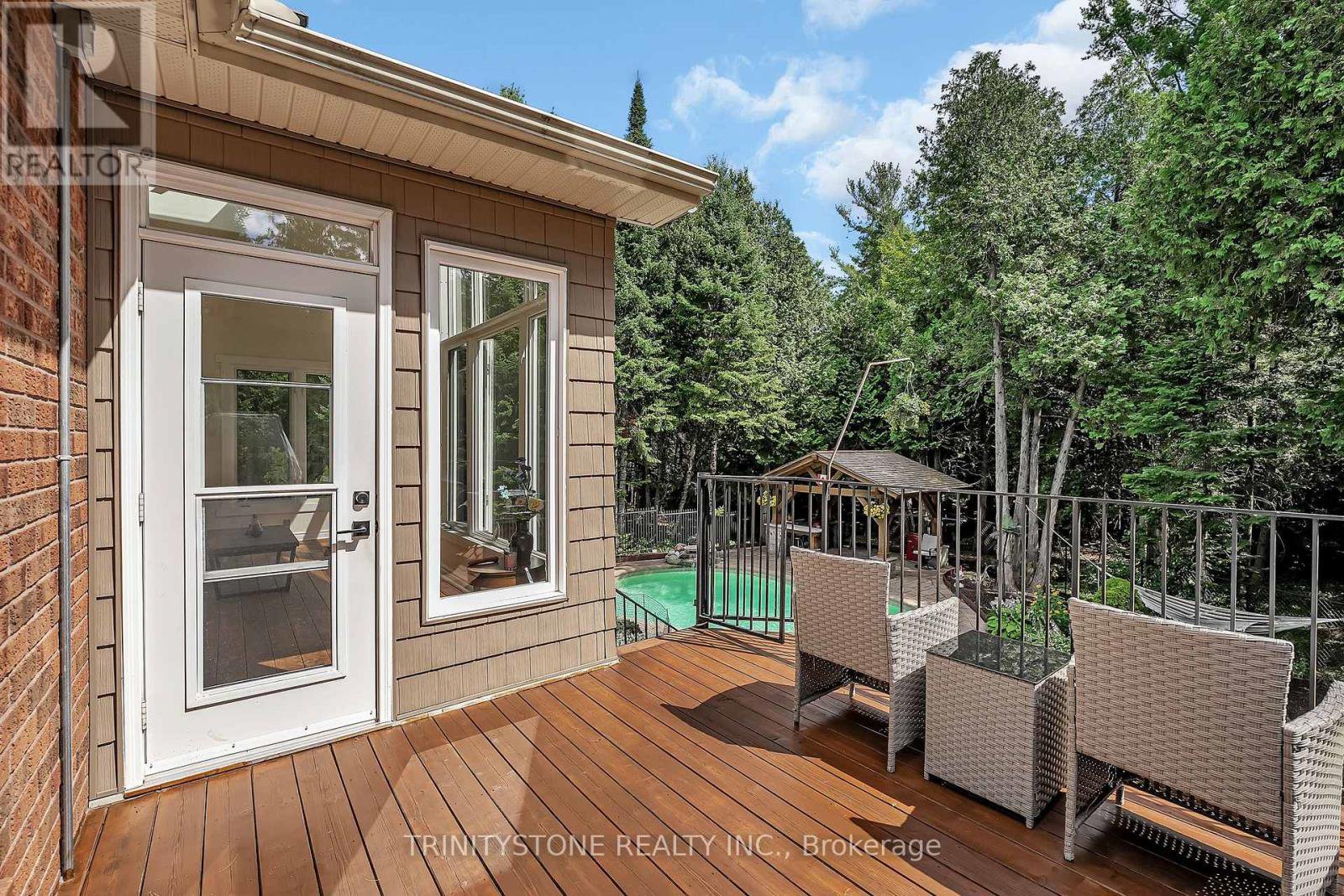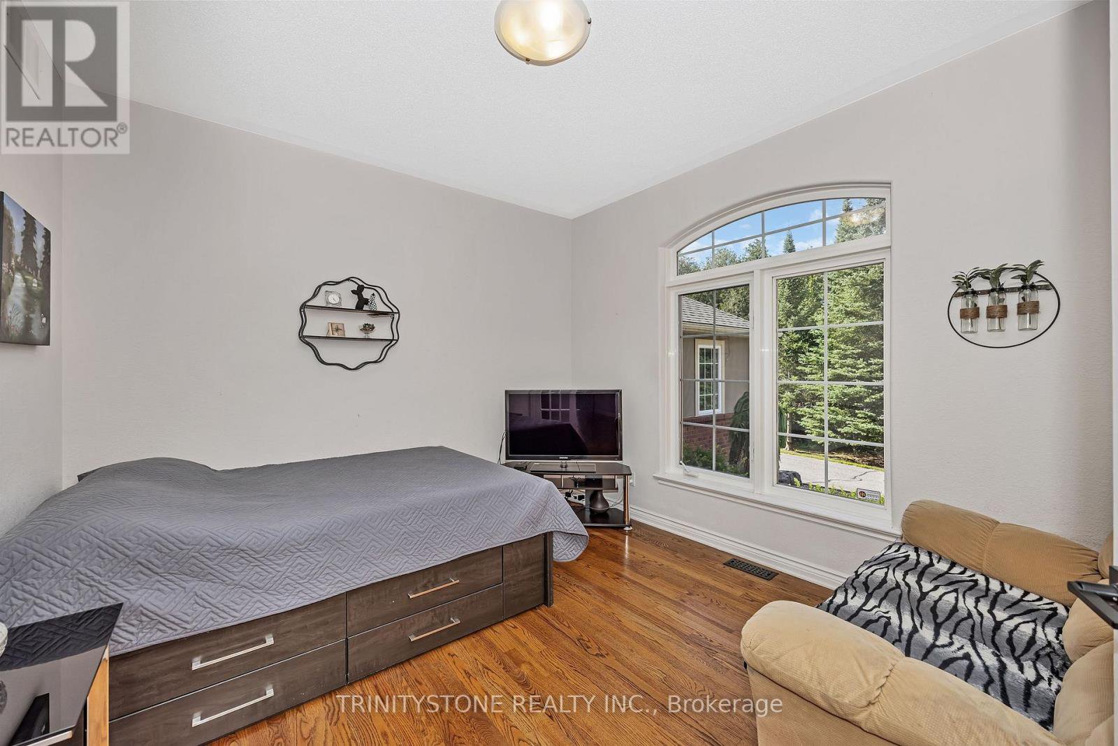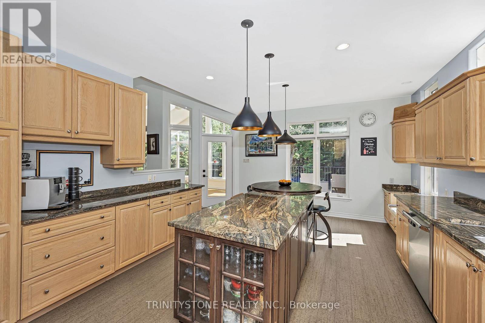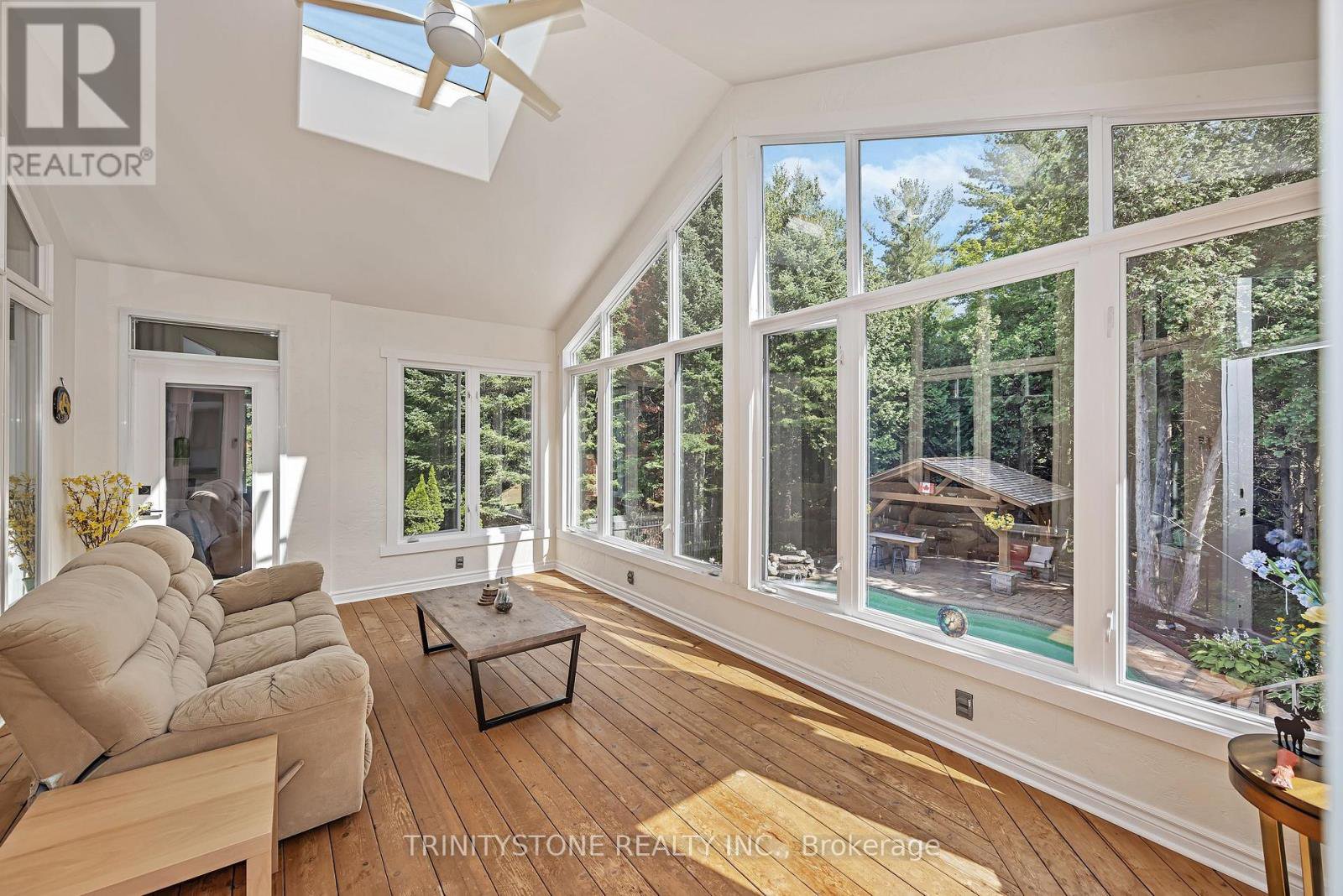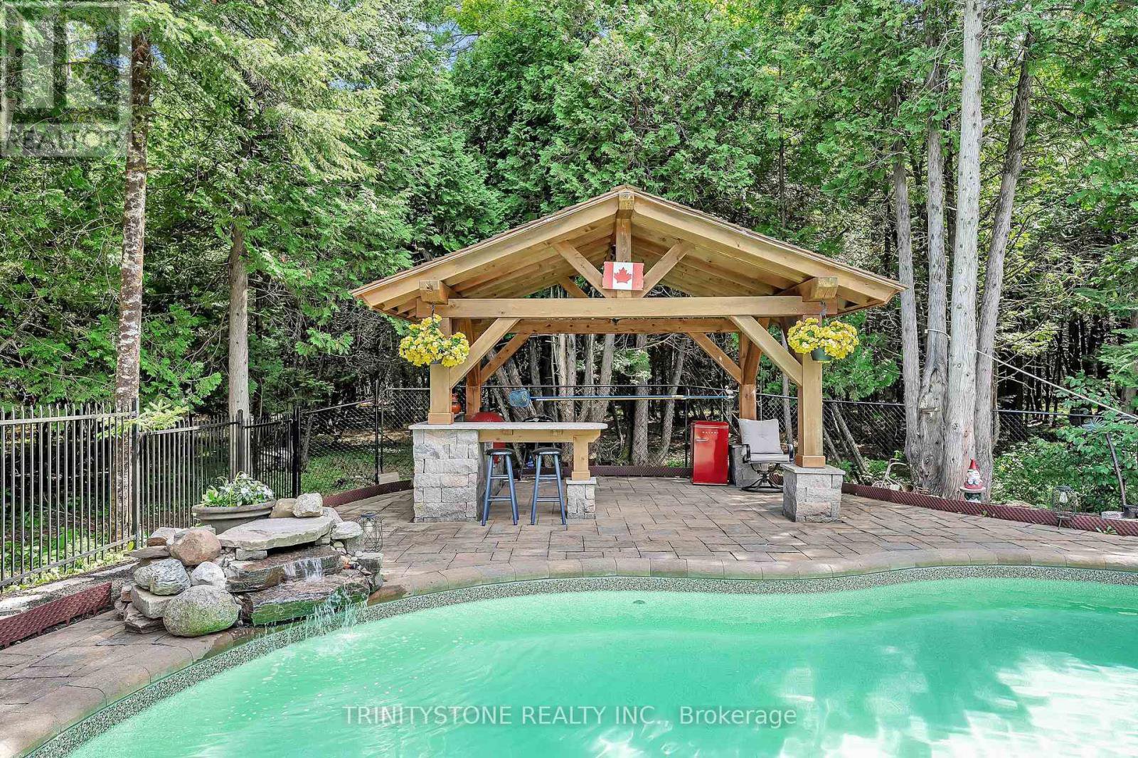 Welcome to this exceptional custom-built bungalow, perfectly nestled on a 2.3 Acre treed lot in a sought-after golf club community! A long, private driveway surrounded by lush landscaping offers ample parking and sets the tone for this inviting property. Step inside to a spacious foyer that opens to a bright and expansive living room, complete with a cozy fireplace and an abundance of natural light. The gourmet kitchen features stainless steel appliances, a breakfast bar, and generous cabinetry, seamlessly blending style and functionality. Adjacent to the kitchen, a sun-filled four-season sunroom with large windows invites you to take in the picturesque views of the backyard. The primary suite offers a walk-in closet and a luxurious 4-piece ensuite with dual sinks and a sleek glass shower. A potential fifth bedroom (or home office), an additional spacious bedroom, and a beautifully designed full bathroom with a freestanding tub and glass shower complete the main floor. A dedicated laundry room adds to the convenience of this level. The fully finished lower level feels like an extension of the main floor, with large windows providing plenty of natural light. Here, you'll find two additional bedrooms, a fitness room, a full 4-piece bathroom, and a walkout to the backyard. The backyard is a true private oasis, designed for relaxation and entertaining. Enjoy the upper-level deck perfect for gatherings, or retreat to the shaded walkout patio below. The stunning inground pool, complete with a waterfall feature, stone patio, and a large gazebo, offers a spa-like experience right at home. Schedule your exclusive showing today and see all this home has to offer!