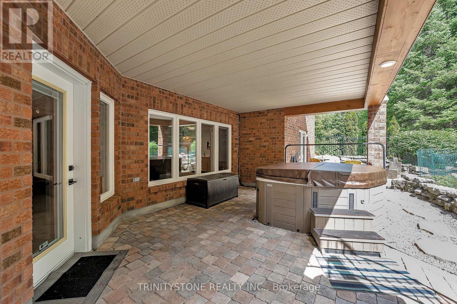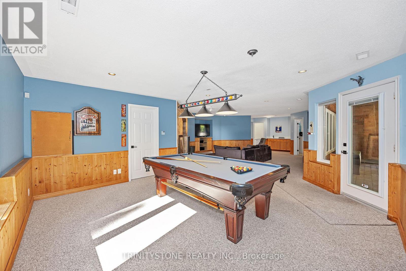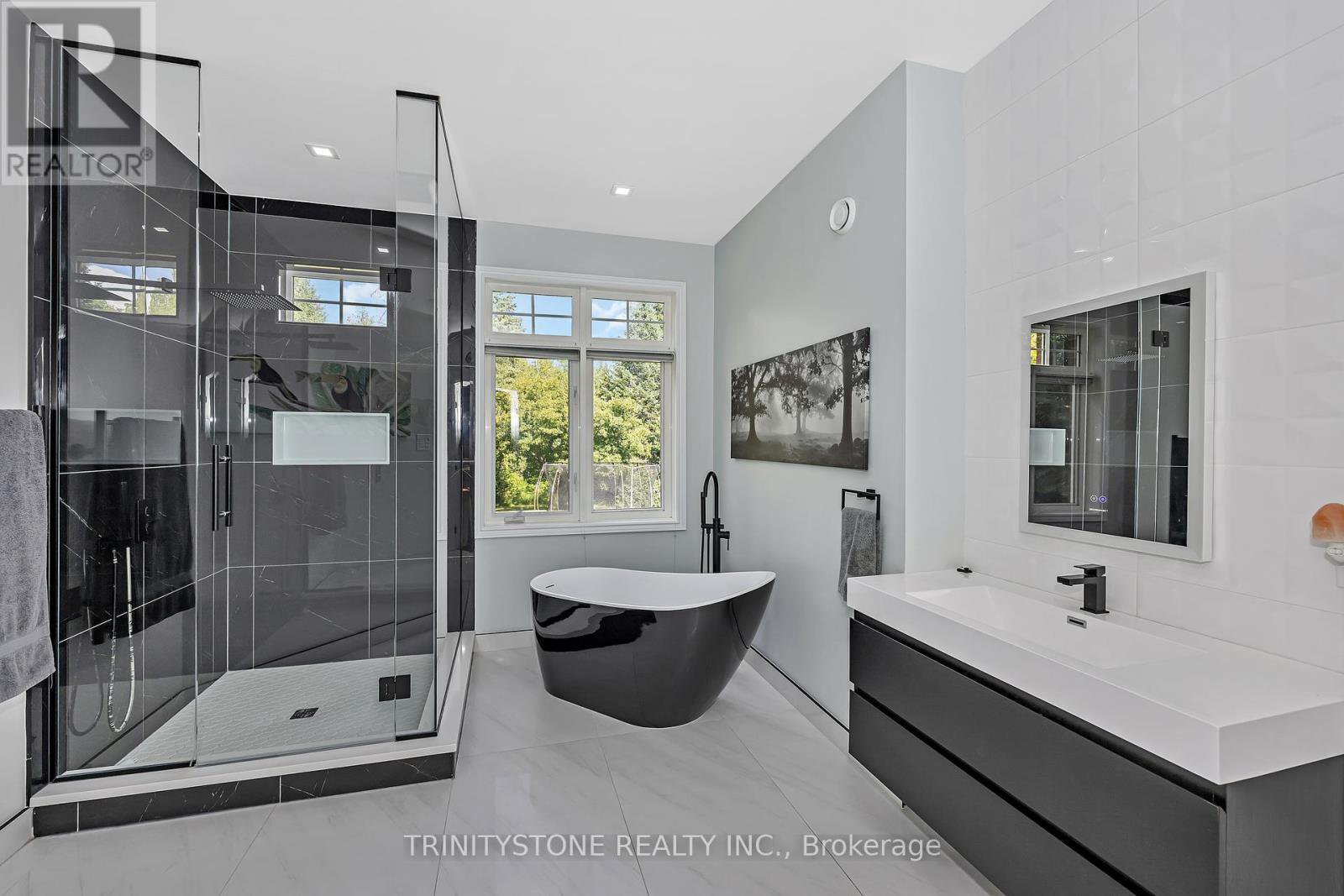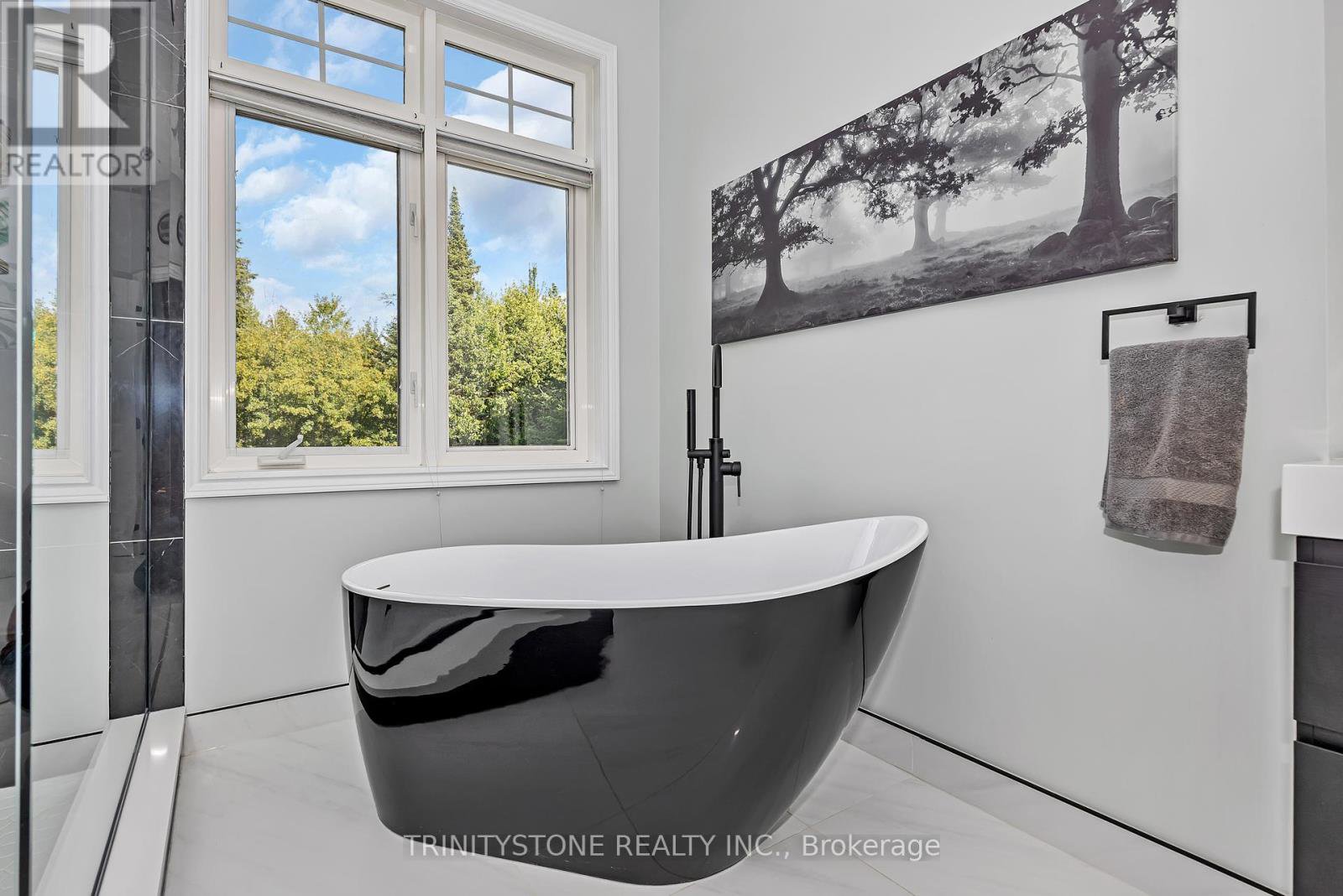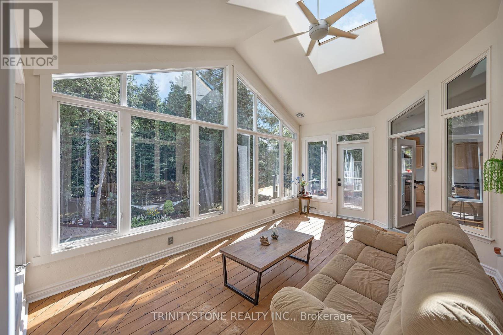 Welcome to this exceptional custom-built bungalow, perfectly nestled on a 2.3 Acre treed lot in a sought-after golf club community! A long, private driveway surrounded by lush landscaping offers ample parking and sets the tone for this inviting property. Step inside to a spacious foyer that opens to a bright and expansive living room, complete with a cozy fireplace and an abundance of natural light. The gourmet kitchen features stainless steel appliances, a breakfast bar, and generous cabinetry, seamlessly blending style and functionality. Adjacent to the kitchen, a sun-filled four-season sunroom with large windows invites you to take in the picturesque views of the backyard. The primary suite offers a walk-in closet and a luxurious 4-piece ensuite with dual sinks and a sleek glass shower. A potential fifth bedroom (or home office), an additional spacious bedroom, and a beautifully designed full bathroom with a freestanding tub and glass shower complete the main floor. A dedicated laundry room adds to the convenience of this level. The fully finished lower level feels like an extension of the main floor, with large windows providing plenty of natural light. Here, you'll find two additional bedrooms, a fitness room, a full 4-piece bathroom, and a walkout to the backyard. The backyard is a true private oasis, designed for relaxation and entertaining. Enjoy the upper-level deck perfect for gatherings, or retreat to the shaded walkout patio below. The stunning inground pool, complete with a waterfall feature, stone patio, and a large gazebo, offers a spa-like experience right at home. Schedule your exclusive showing today and see all this home has to offer!