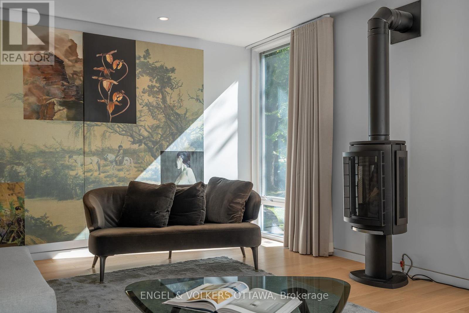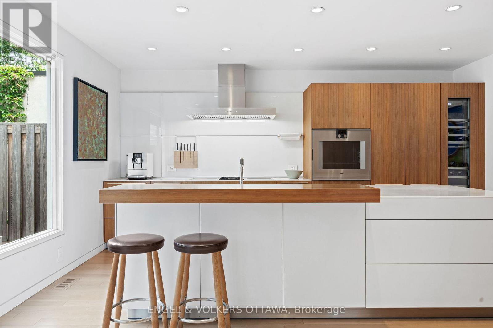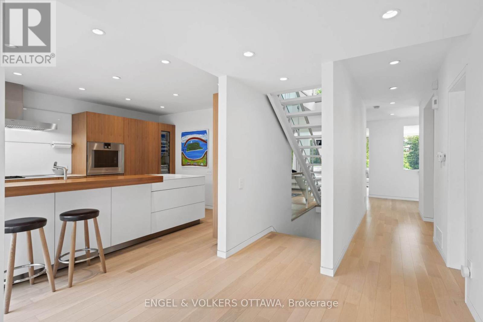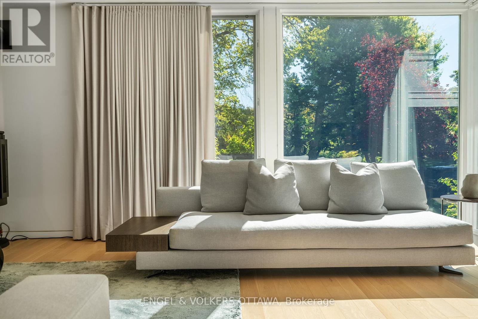 The Modern House on Patterson Creek. This architecturally refined residence is one of only a handful of homes gracing the tranquil waters of Patterson Creek. Designed by John Donkin, the home is a study in modernist restraint. clean lines, light-filled interiors, and a seamless relationship between structure and setting. The current owners collaborated with Astro Design Centre and Bulthaup Toronto to reimagine the interiors, enhancing the original architecture with an uncompromising approach to craftsmanship and material quality. Every surface and junction was considered, walnut veneers, polished quartz, brushed stainless steel, and softly textured marble contribute to an atmosphere of quiet sophistication. The open-concept main level is anchored by a sculptural steel staircase that filters light through all three floors. Expansive glass walls frame park and water vistas, bringing nature into daily view. The living room centres on a minimalist Jøtul gas fireplace, while the Bulthaup kitchen sleek walnut cabinetry, chef-grade appliances, and a generous island defines contemporary elegance. The main floor office or guest suite provides a perfect private space to work from. .Upstairs, the principal suite provides a tranquil retreat with a bespoke walk-in closet and a spa-like ensuite appointed with marble and refined European fixtures. A secondary bedroom, guest bath, and flexible sitting area continue the home's cohesive aesthetic of calm and clarity. The lower level, with 9-foot ceilings, offers a versatile family or media room, gym or guest space, and full bath. A private south-facing garden extends the living space outdoors, designed for intimate entertaining and quiet reflection. Patterson Creek offers a rare balance of serenity and urban convenience steps from the Rideau Canal, and Lansdowne Park. This exceptional property embodies architectural integrity, thoughtful design, and the timeless elegance of modern living. Exceptional Value and Lifestyle!