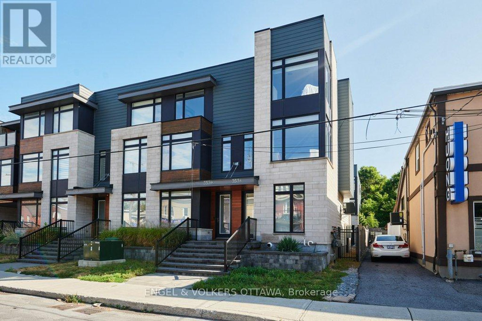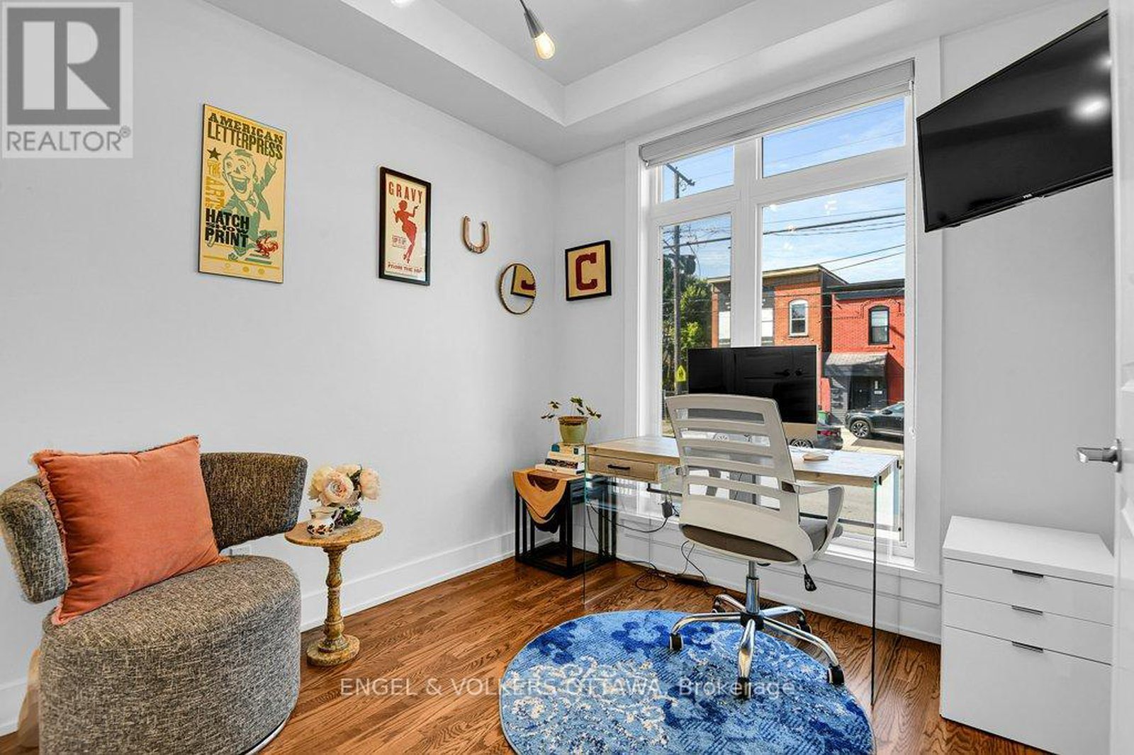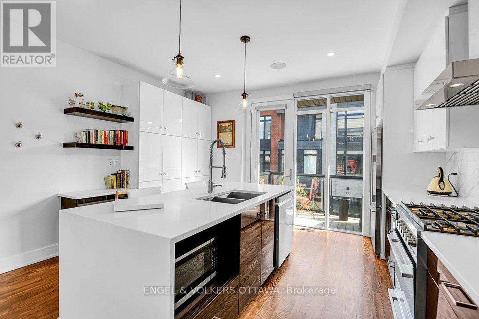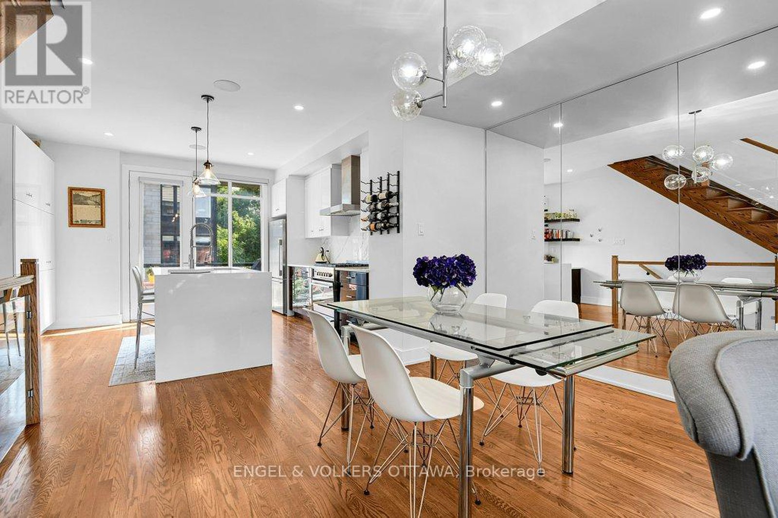 Welcome to 353E Booth Street, an elegant three-level end-unit townhome offering a refined, bespoke living experience in the heart of Ottawa. Built in 2016 and maintained to perfection, this home feels practically brand new while providing thoughtful design and sophisticated details throughout. The main level features a bright office with hardwood floors and oversized windows and is easily adaptable as a third bedroom, along with a powder room and convenient inside access to the garage, plus additional storage below. Upstairs, the open-concept second floor is designed for both style and function. A generous kitchen with ample cabinetry, built-in storage, and a workspace opens to a private balcony, perfect for morning coffee or evening drinks. The dining area is enhanced by a striking mirror feature wall, while the airy living room benefits from windows on two sides and a charming nook under the bay windows. Integrated speakers on both the second and third floors add to the ambiance. The top level is dedicated to rest and comfort, with a primary suite featuring his-and-hers closets and a private ensuite, plus a guest bedroom and second full bathroom. Laundry is thoughtfully located on this floor, with hardwood carried throughout. Perfectly positioned just steps from Pimisi LRT, Lebreton Flats, and some of Ottawa's best restaurants, with quick access to Dows Lake and scenic trails, this residence is an ideal pied-a-terre or full-time city home.