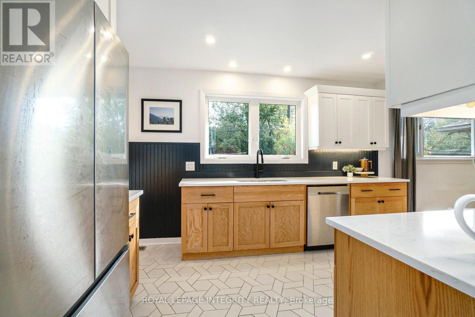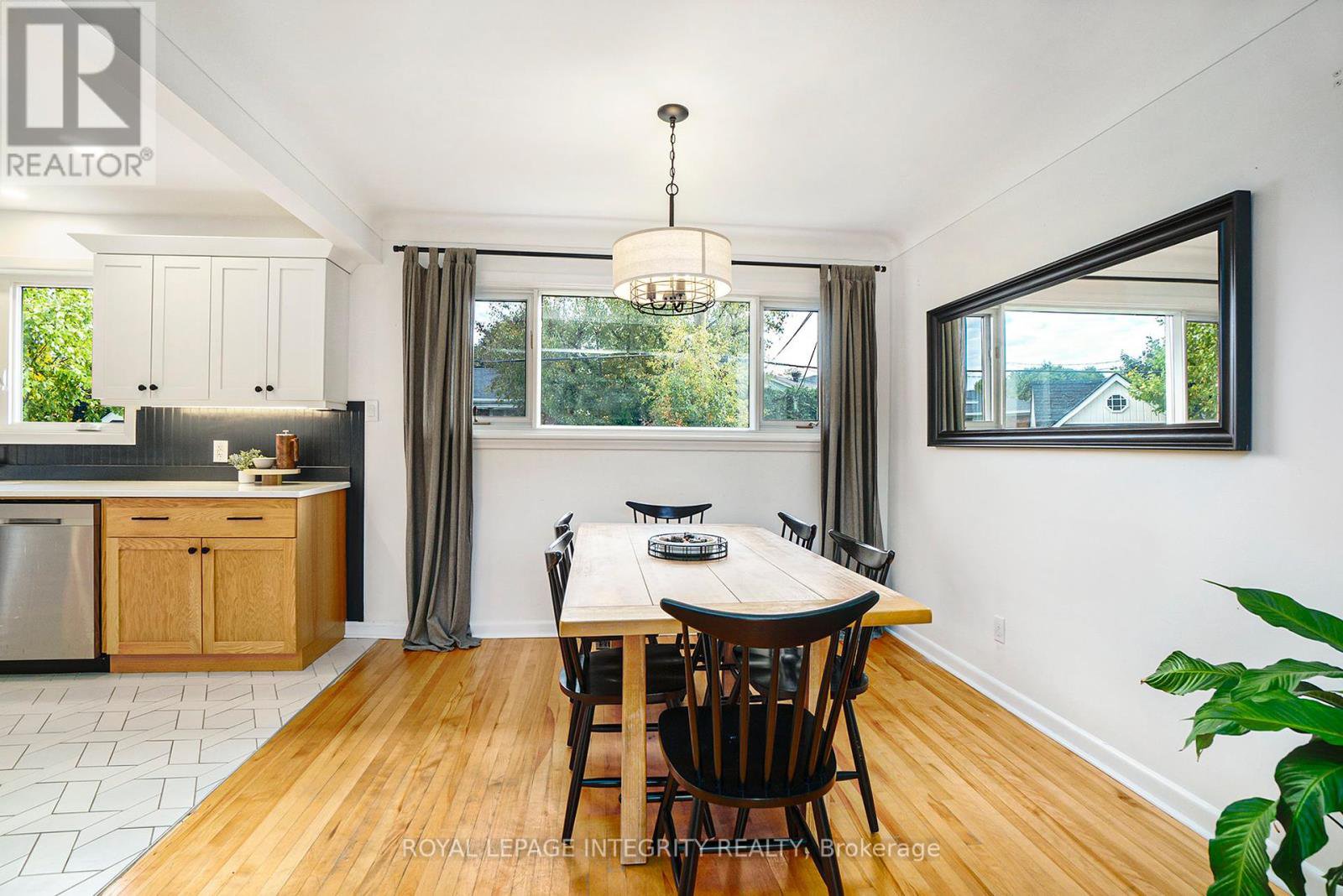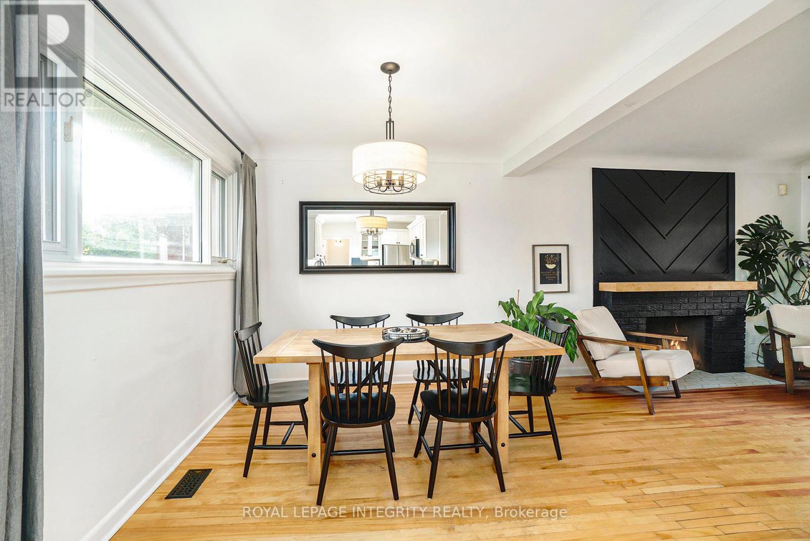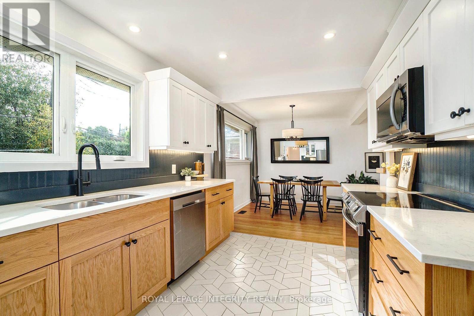 Located on a wonderful street just steps from Agincourt Public School, this all-brick Campeau-built bungalow combines solid craftsmanship with stylish modern updates. Step into a beautifully tiled entry with custom wainscoting and a bright, open-concept layout. The spacious living room is filled with natural light, a perfect spot for your plants to thrive and features a beautifully designed fireplace that makes a striking focal point. The dining area flows into a stunning renovated kitchen with modern flair and traditional finishes. You will love the updated stainless steel appliances and ample storage here. Three well-sized bedrooms and a gorgeous renovated bathroom with a glass-enclosed walk-in shower complete the main level. Downstairs, you'll find a large unfinished basement offering endless potential - with rough-ins ready for a future bathroom, its a perfect blank slate for your dream basement project. Outside, enjoy low-maintenance perennial gardens, a cozy patio and a handy shed for extra storage. Centrally located in sought-after Copeland Park, you'll love the unbeatable convenience - quick access to Highway 417, public transit and shopping all with ease. Families just love the walkability to nearby parks and the friendly, tight-knit community surrounded by mature trees and timeless charm. Important updates to note include roof 2018, AC & furnace 2020, some windows 2015 and kitchen and bathroom 2021. We know you will just fall for Ferguson! Please allow 24 hrs irrev. on all offers.