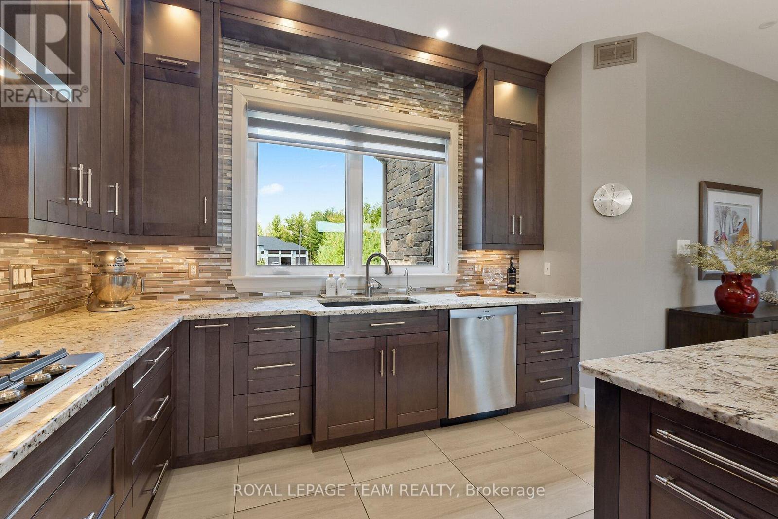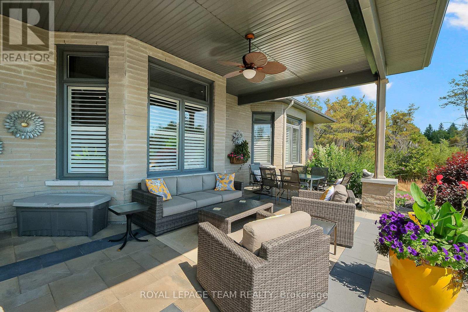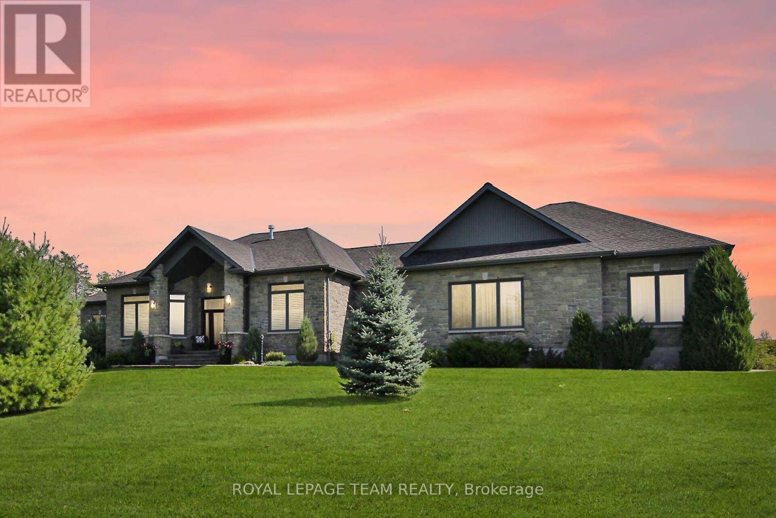 Welcome to this executive-style bungalow offering refined luxury and timeless design on a beautifully landscaped 2+ acre country lot. Impeccably built with a stately stone and brick exterior; this home exudes sophistication with warmth from the moment you arrive. The covered front porch and elegant glass entry open to soaring tall ceilings, rich hand-scraped hardwood floors, and expansive transom windows that flood the home with natural light. The open-concept living space centers around a striking double-sided fireplace and flows seamlessly into the designer Deslaurier kitchen, a true showpiece featuring full-height custom cabinetry, granite countertops, built-in stainless steel appliances, and a grand island with seating for four; perfectly designed for entertaining or for everyday living. The spacious primary suite offers a tranquil retreat with large windows, a walk-in closet, and a spa-inspired ensuite showcasing dual vanities and contemporary finishes. Additional bedrooms and a main-floor office and cozy den provide flexibility for family or remote work. Enjoy the relaxed country air outside under a covered 16 x 36 back patio with discreet power sunscreen, while looking out onto manicured lawns, lush gardens, and a completely private backdrop, ideal for gatherings or peaceful evenings as the sun sets. An attached oversized 4 car garage with extra tall insulated doors, direct basement access, a fully paved driveway with decorative lit stone pillars, and impeccable attention to detail complete this exceptional rural property. Experience the perfect blend of luxury, comfort, and craftsmanship in this remarkable bungalow. Truly a home to fall in love with! Welcome Home!