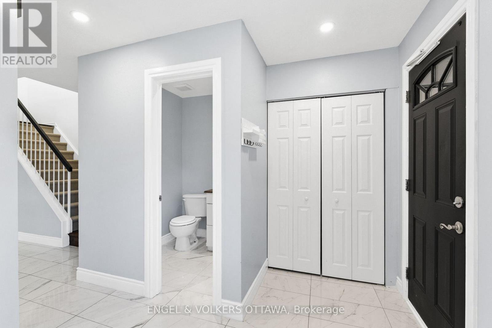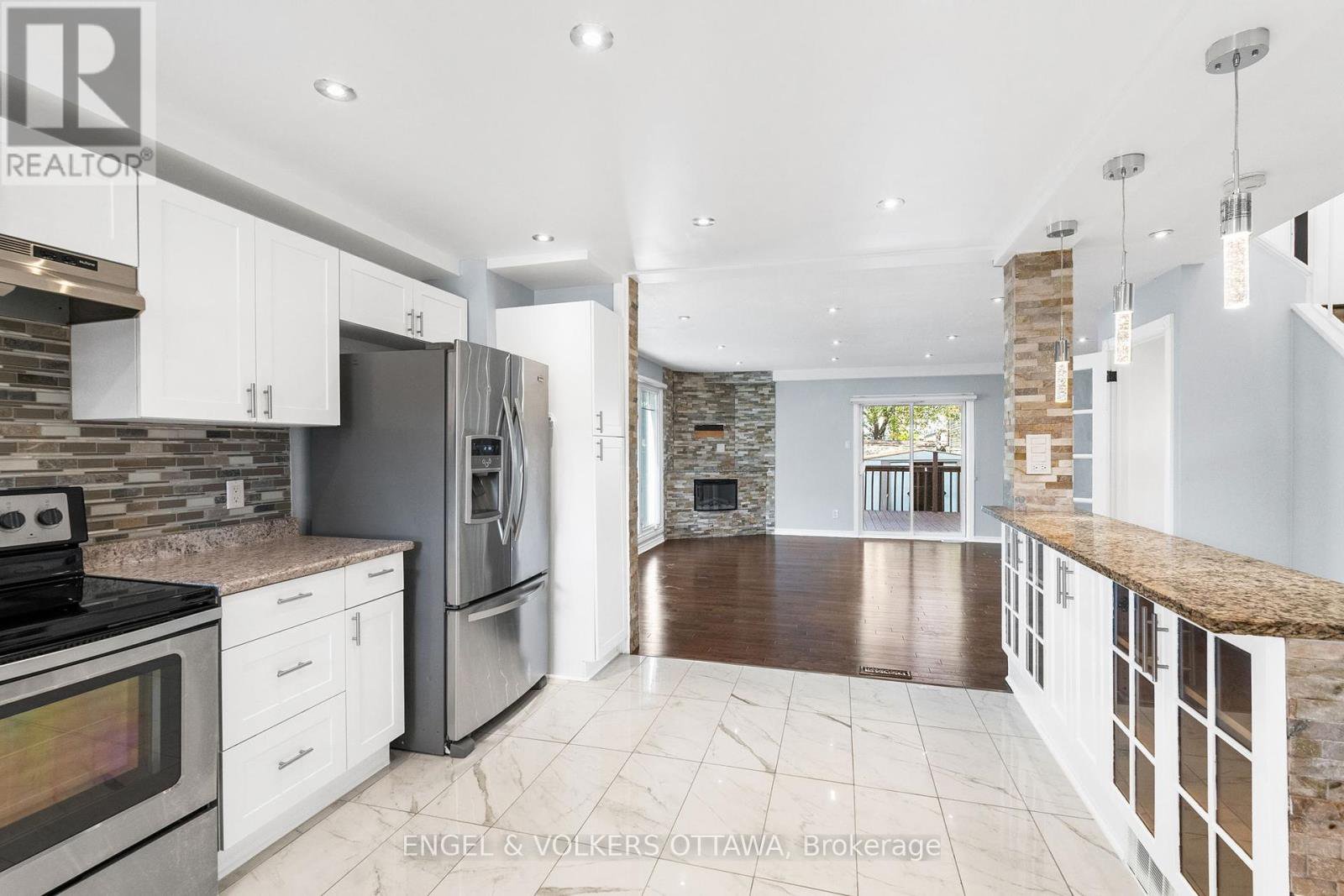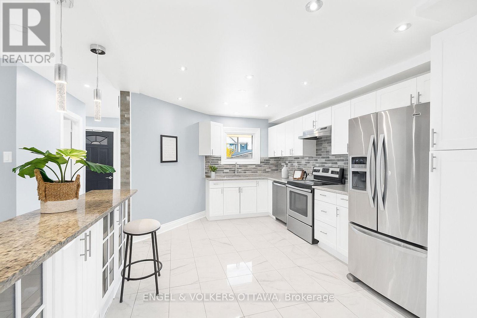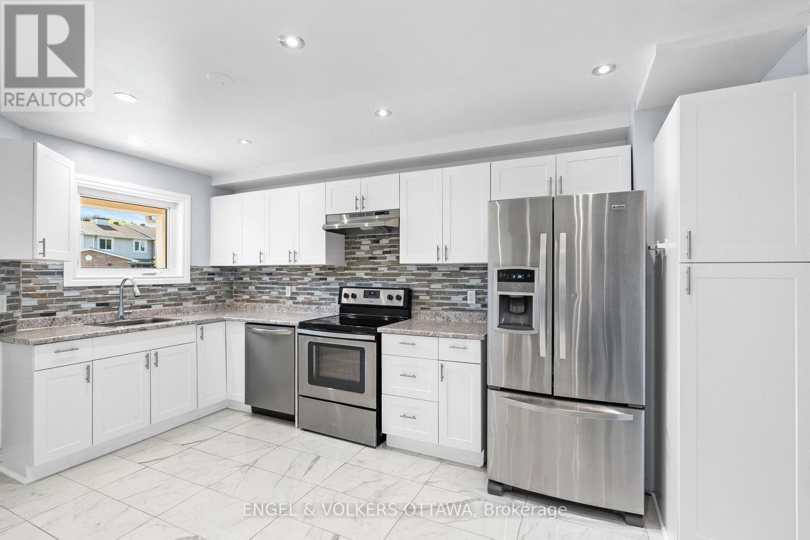 This family-friendly end-unit townhome in South Keys offers practical open-concept living in an extremely well-connected area of the city. The tiled entryway has double closets and a convenient powder room, while the kitchen boasts granite countertops, white shaker cabinetry, a full-height tile backsplash, and stainless steel appliances. A large peninsula with pendant lighting provides both functionality and space for casual dining. Adjacent, the dining area features hardwood flooring and recessed lighting, which run seamlessly into the bright living room, where a stacked-stone feature wall with a built-in fireplace creates a welcoming focal point. Sliding glass doors open to the backyard deck, making it easy to transition from indoor to outdoor living during the summer. Upstairs, the primary bedroom has two double-door closets and a 4-piece ensuite. Two additional bedrooms, which share a bathroom with a glass-enclosed walk-in shower with tile and a modern vanity, make for the perfect children's bedrooms. The finished basement has a spacious recreation room and a fourth bedroom, while an additional room with tiled flooring and direct access to a half bathroom makes for a quiet work or hobby space. Outside, a raised deck and fully fenced yard offer a private, low-maintenance retreat perfect for entertaining or relaxing. Mature trees add natural beauty and shade, while a garden shed provides practical storage. This home is close to parks and walking trails, making it ideal for those that enjoy spending quality time outdoors. Nearby amenities include South Keys Shopping Centre and its transit hub, shops and restaurants along Hunt Club Rd and Bank St, as well as quick access to the airport.