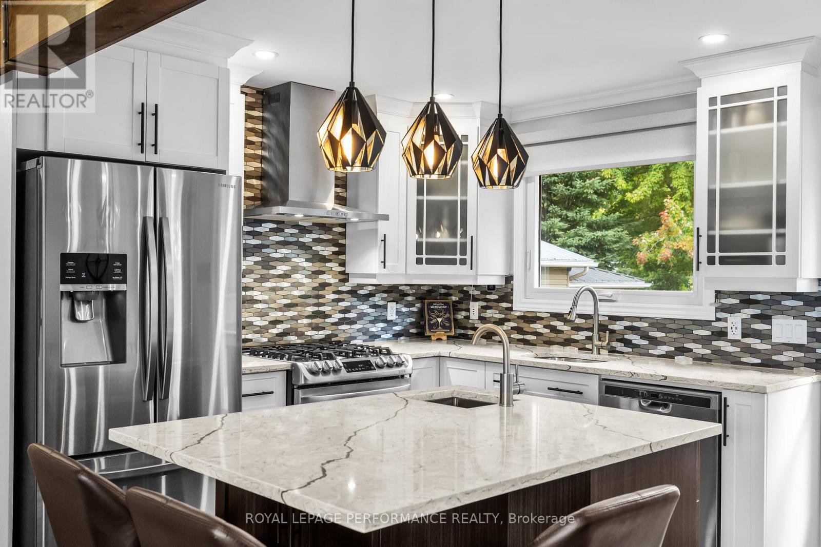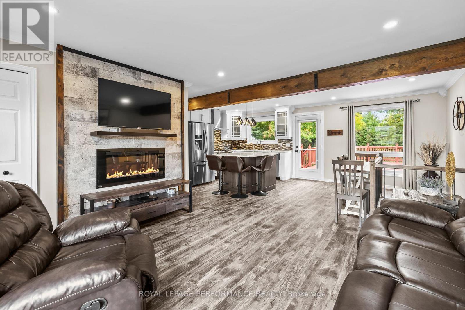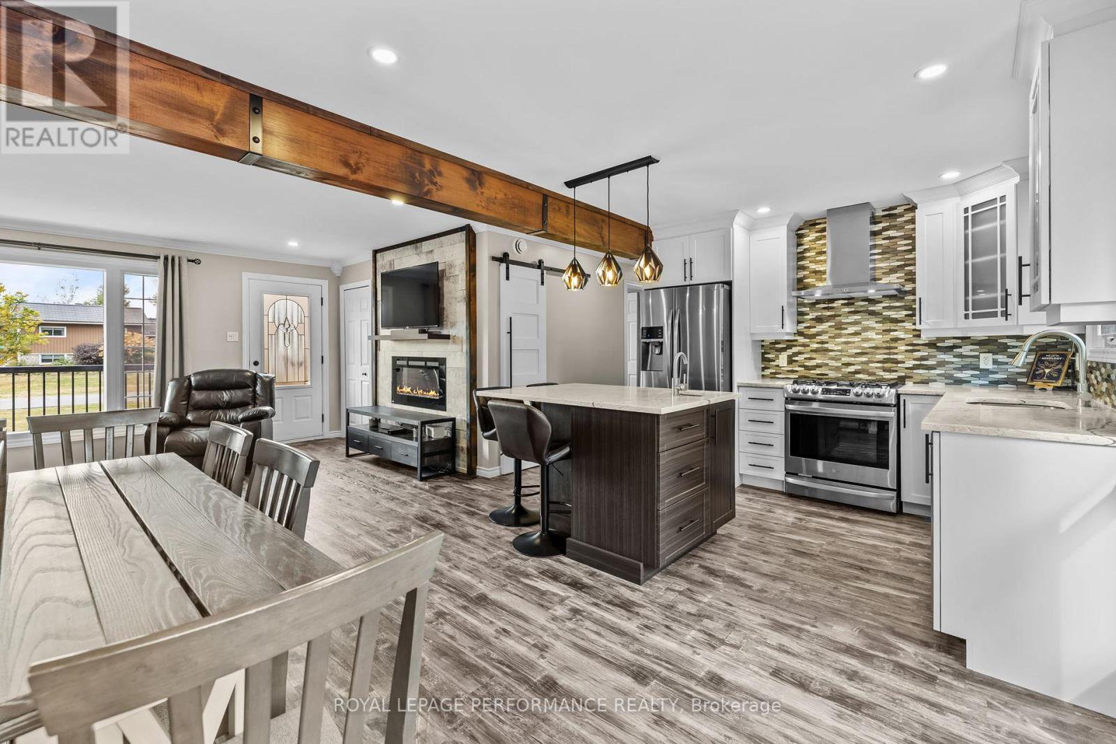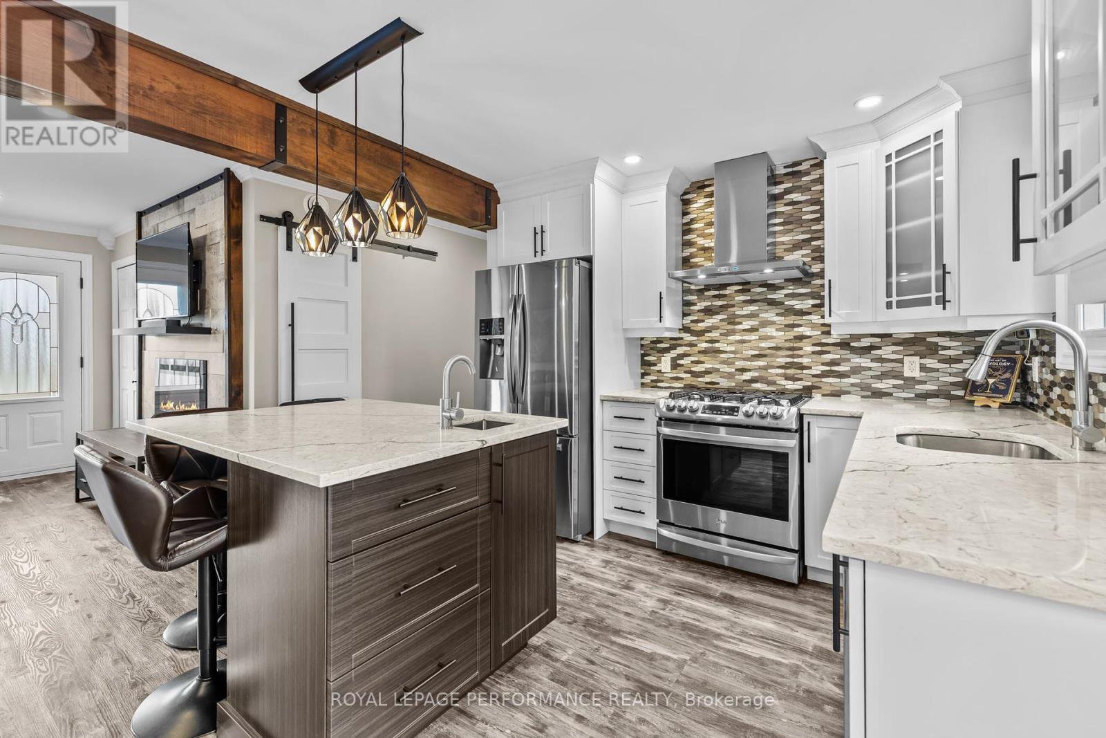 Welcome to 122 Maple Grove Street in the sought-after Forest Park community! Perfectly situated with easy access to Highway 417 and only 25 minutes from downtown Ottawa, this home is nestled on a quiet dead-end street and steps away from a reputable school currently under expansion. Offering both convenience and privacy, step inside to a beautifully renovated home featuring an open-concept main floor with exposed beam, barn-door accents, and high end luxury vinyl flooring. The inviting living room with an electric fireplace flows seamlessly into the dining area and modern kitchen, complete with quartz countertops and direct access to a spacious (16' x 32') rear deck perfect for entertaining. The main floor hosts 3 comfortable bedrooms and 1 full bath with granite countertops, while the fully finished basement extends your living space with 1 additional bedroom, a cozy family room with natural gas fireplace, a dry bar with granite countertops, built-in shelving, a 2nd full bathroom with granite countertops, plus dedicated laundry, storage areas, & features a dri-core flooring system throughout. Car enthusiasts and hobbyists alike will love the insulated heated (natural gas) detached double garage (20' x 34') equipped with a metal roof, internet, heating, and water. Outside, the private backyard is a true retreat with mature trees, full fencing, an additional shed ('10x'14), and an impressive 100ft paved driveway + 72ft on the side of the garage leading to the shed. With modern renovations and smart functionality throughout, this home combines the best of private living with the convenience of municipal utilities.