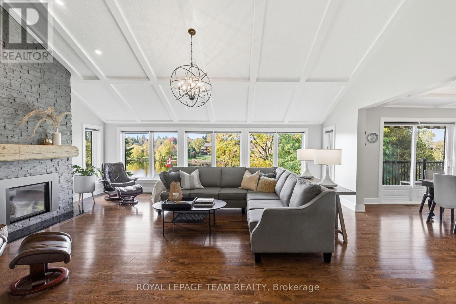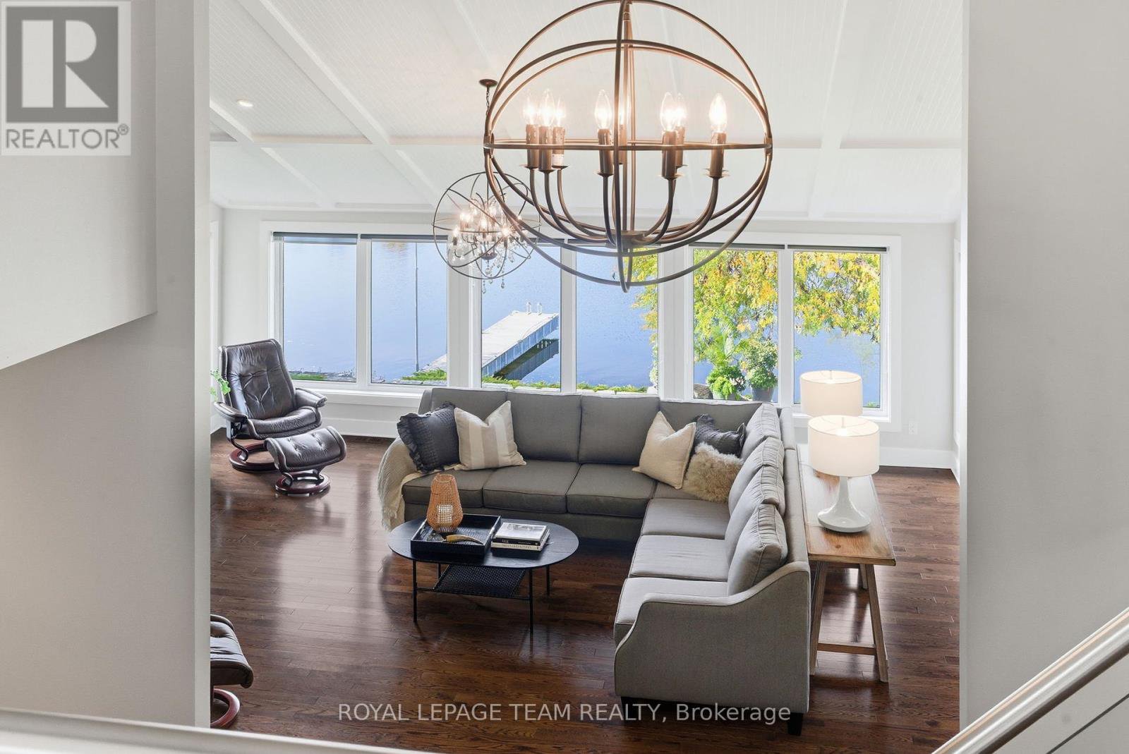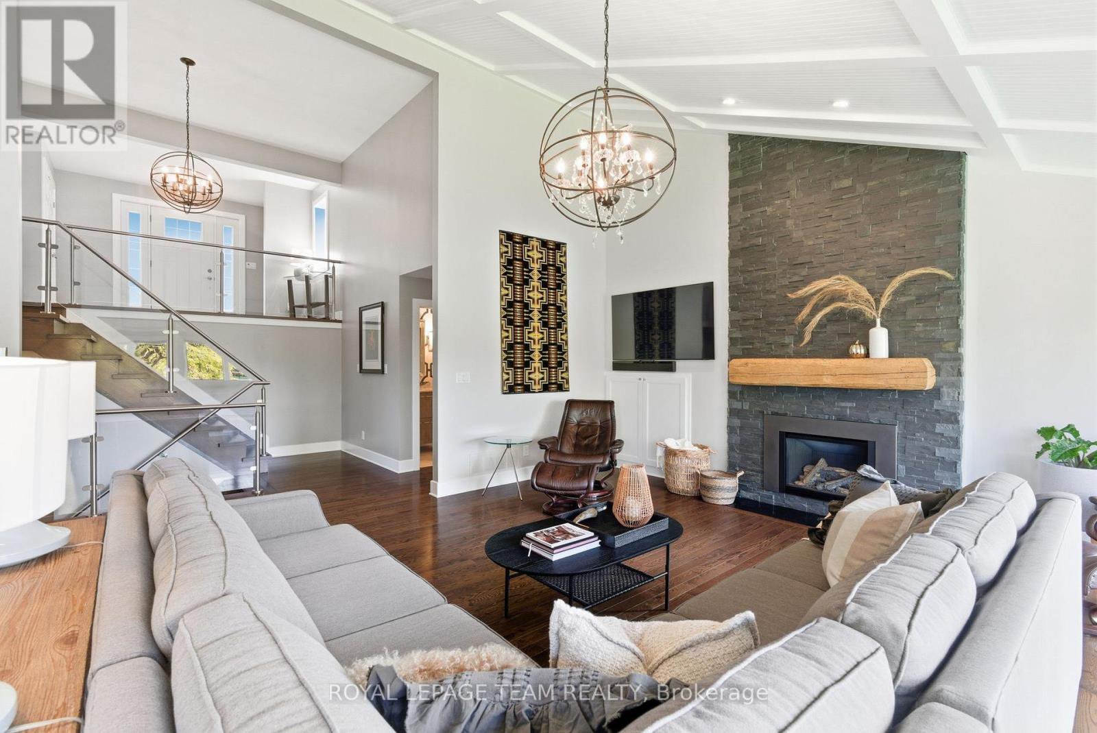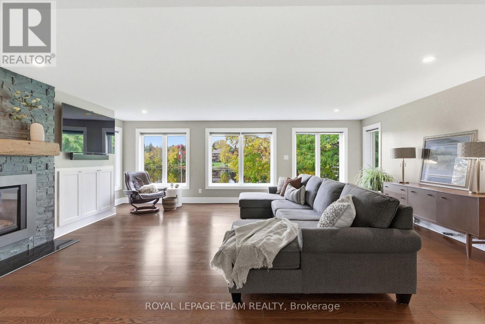 This Manotick waterfront home offers impressive features and breathtaking sunset river views from the moment you step inside. The fireplace plays a starring role in the great room, drawing attention to the vaulted ceiling and expansive full height windows. The luxurious but highly functional kitchen with breakfast bar and Cambria quartz counters is accompanied by a spacious eating area, making meal time a breeze; or opt to dine outside with direct access to the balcony with convenient staircase to the yard and waterfront. Main floor primary bedroom with spa-style ensuite and walk-in closet; and 3 additional bedrooms on the walkout level. Retreat to the walkout level family room enclosed by a wall of windows, offering further living space, a 2nd fireplace and a whole lot of fun. Head outdoors to the peaceful sunken seating area, graciously positioned under a mature lush Locust tree, providing natural privacy and shade. Surrounded by landscaping and armour stone with easy steps to the large dock for endless river adventure. A very special location on the Rideau River with thoughtfully balanced spaces inside and out. A bonus second lower garage with inside entry for additional car parking, lawn equipment, workshop tinkering and storage. Professionally renovated throughout with new septic system installed in Fall of 2025. 24 hr irrev.