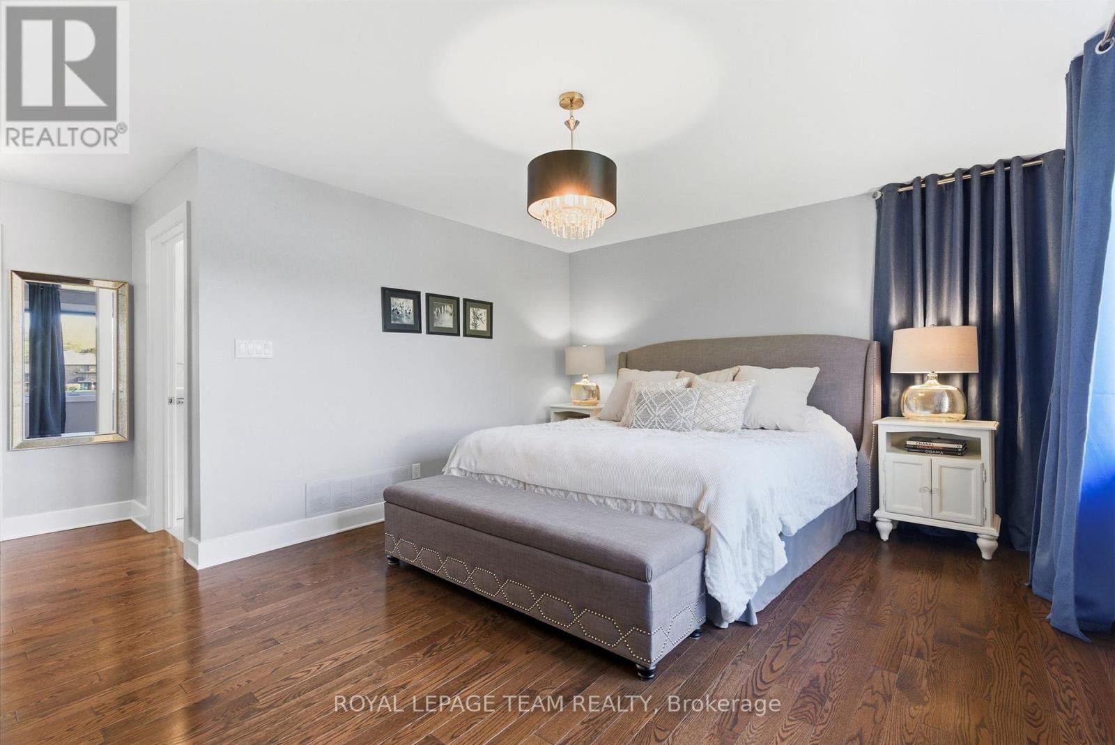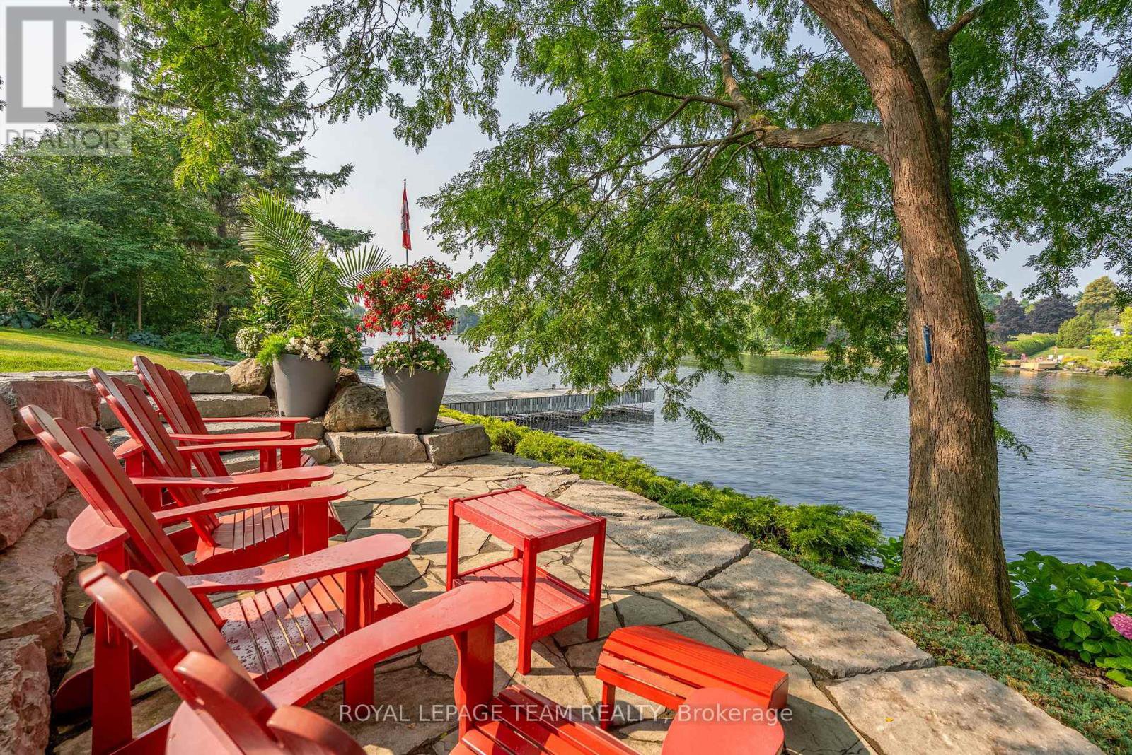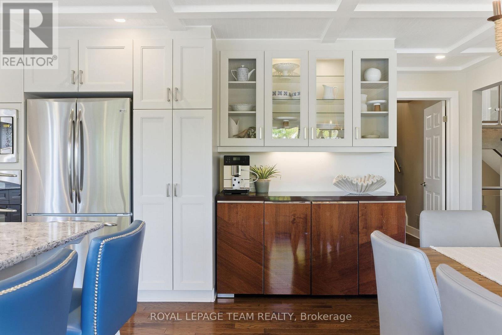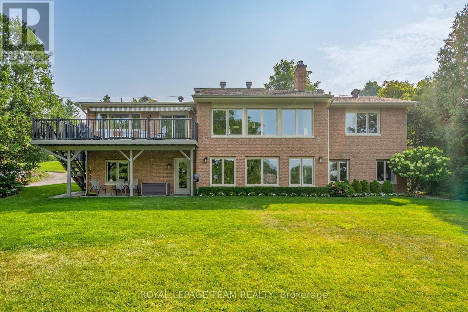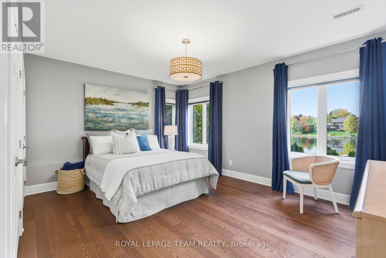 This Manotick waterfront home offers impressive features and breathtaking sunset river views from the moment you step inside. The fireplace plays a starring role in the great room, drawing attention to the vaulted ceiling and expansive full height windows. The luxurious but highly functional kitchen with breakfast bar and Cambria quartz counters is accompanied by a spacious eating area, making meal time a breeze; or opt to dine outside with direct access to the balcony with convenient staircase to the yard and waterfront. Main floor primary bedroom with spa-style ensuite and walk-in closet; and 3 additional bedrooms on the walkout level. Retreat to the walkout level family room enclosed by a wall of windows, offering further living space, a 2nd fireplace and a whole lot of fun. Head outdoors to the peaceful sunken seating area, graciously positioned under a mature lush Locust tree, providing natural privacy and shade. Surrounded by landscaping and armour stone with easy steps to the large dock for endless river adventure. A very special location on the Rideau River with thoughtfully balanced spaces inside and out. A bonus second lower garage with inside entry for additional car parking, lawn equipment, workshop tinkering and storage. Professionally renovated throughout with new septic system installed in Fall of 2025. 24 hr irrev.