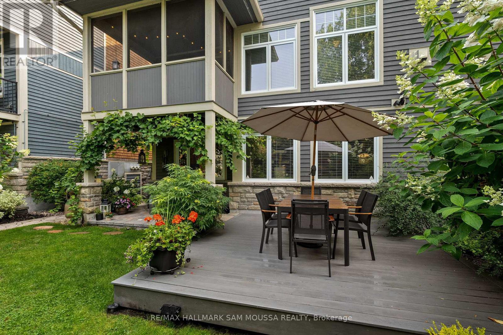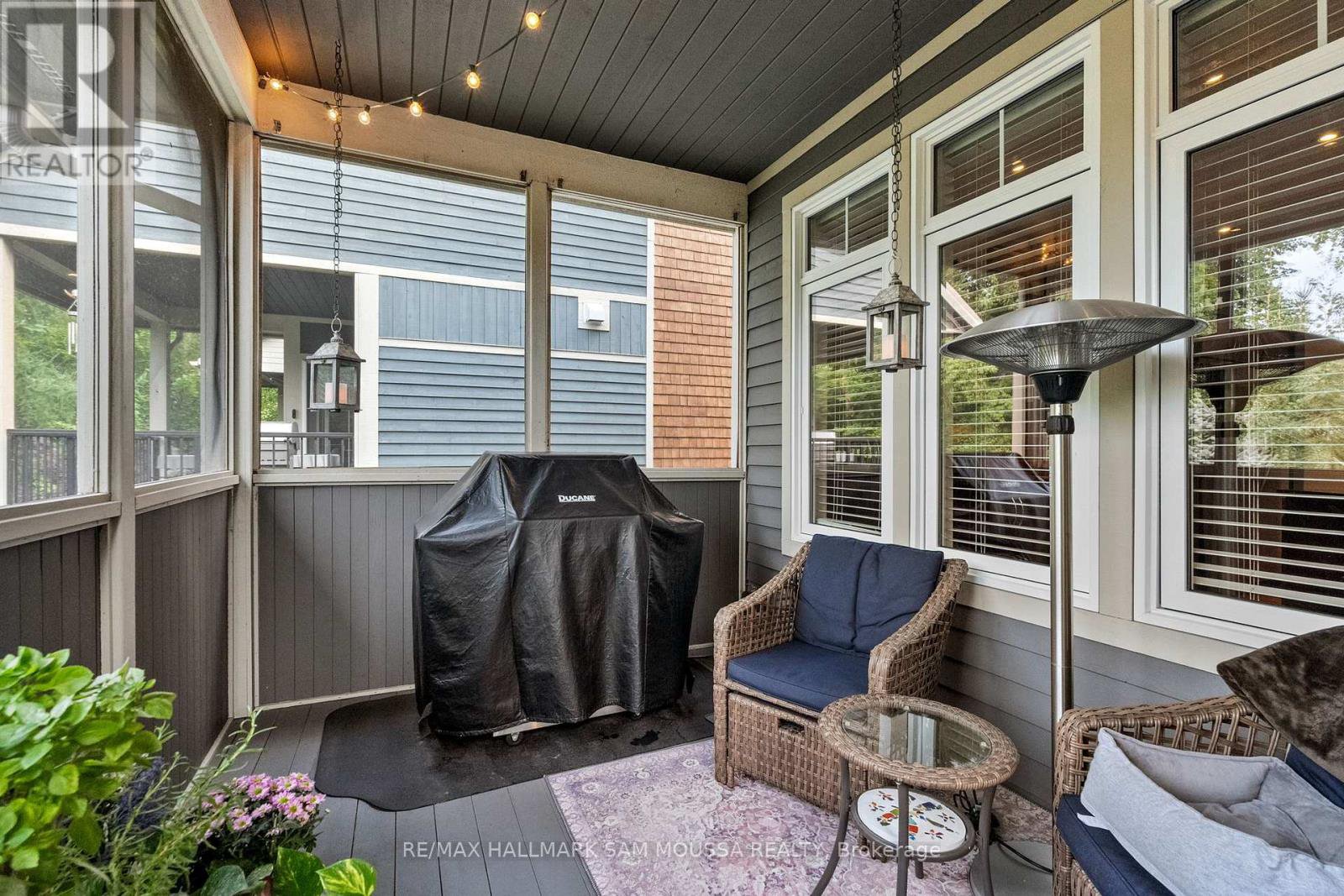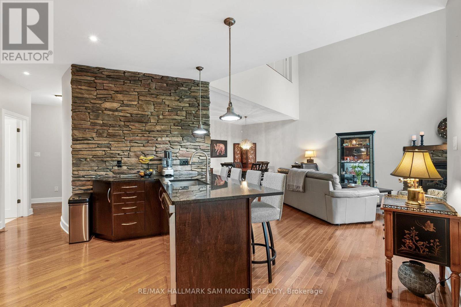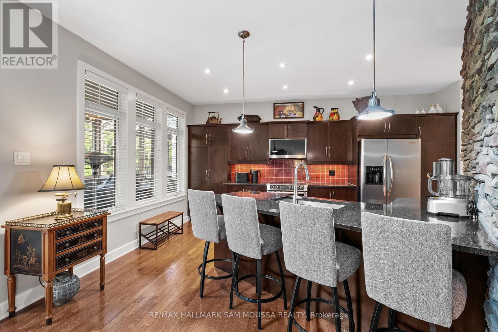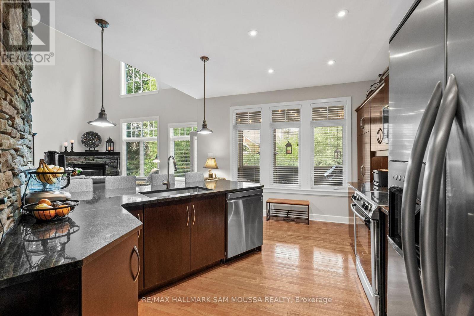 Tucked away in the sought-after enclave of Marshes Village, this beautifully upgraded end-unit townhome offers refined living. Thoughtfully maintained and tastefully enhanced. A foyer with Italian tile sets the tone, opening to open-concept living and dining spaces. Soaring ceilings, expansive windows, and a stone fireplace create a warm atmosphere. The kitchen is a standout, granite counters, stainless steel appliances, and generous cabinetry, all designed with beauty and practicality in mind. A dedicated office, renovated powder room, and laundry area enhance the main level. Off the main living area, a screened-in porch with a gas hookup for BBQ overlooks the back garden. The primary suite is a true retreat, with a large custom walk-in closet and a stunning spa-inspired ensuite. Upstairs, a versatile loft with two closets and a full bath provides flexible living space, ideal for a guest suite or reading nook. Oak hardwood flooring runs throughout, including all three staircases. The finished walk-out lower level offers even more flexibility with a second family room, a spacious bedroom overlooking the garden, a walk-through closet, and a beautifully renovated full bath. This level also features floating oak flooring, adding to the comfort throughout. Outside, professional landscaping enhances the front and rear gardens, a large cedar deck and elegant stone patio provide the perfect backdrop for outdoor entertaining. Recent upgrades include new roof tiles and new wooden front steps. Situated next to the prestigious Marshes Golf Course and just minutes from Kanata Norths high-tech hub, the Brookstreet Hotel, DND, the 417, local shops and restaurants, the Richcraft Rec Complex, and nearby pickleball courts, this home offers a luxurious lifestyle in one of the city's most exclusive communities. Marshes Village Homeowners Association fee is $196/month covers road snow removal, landscaping, general maintenance, audit and insurance with a reserve fund for future needs.