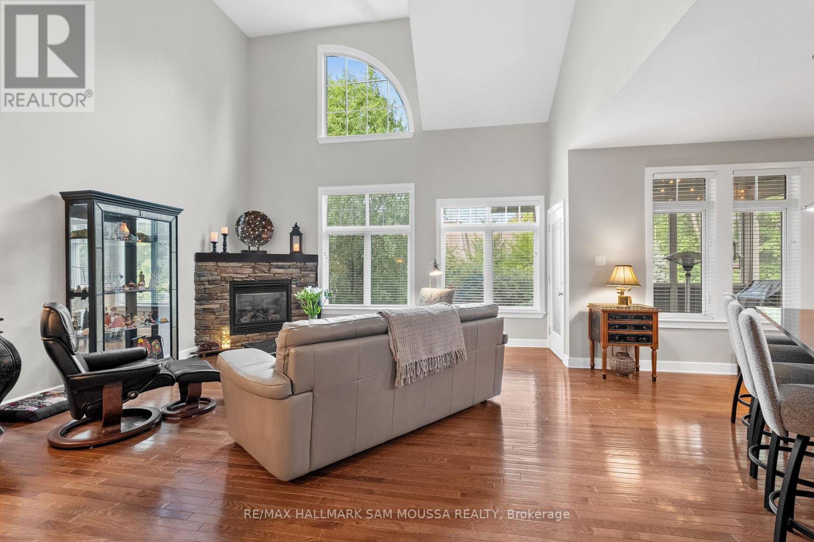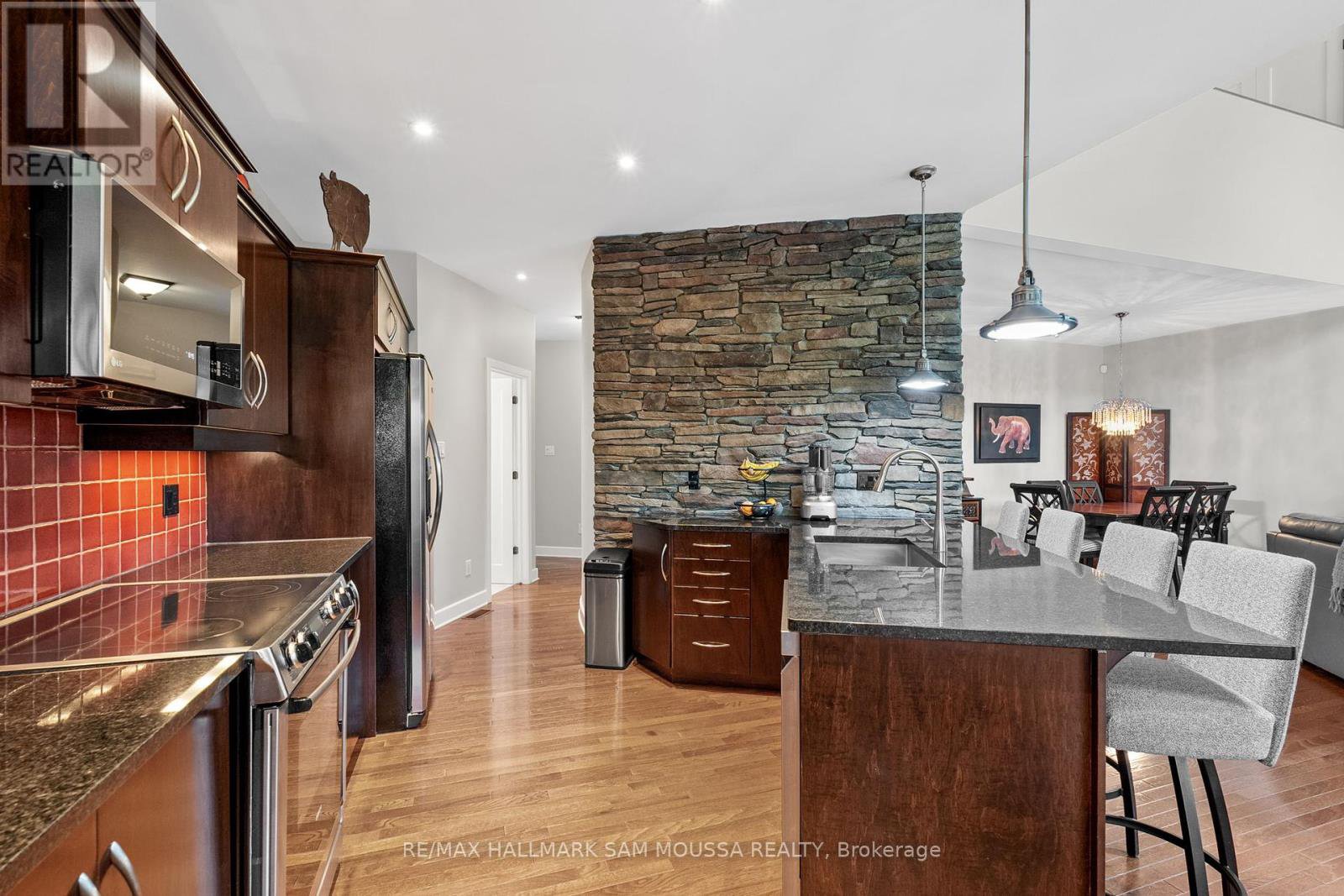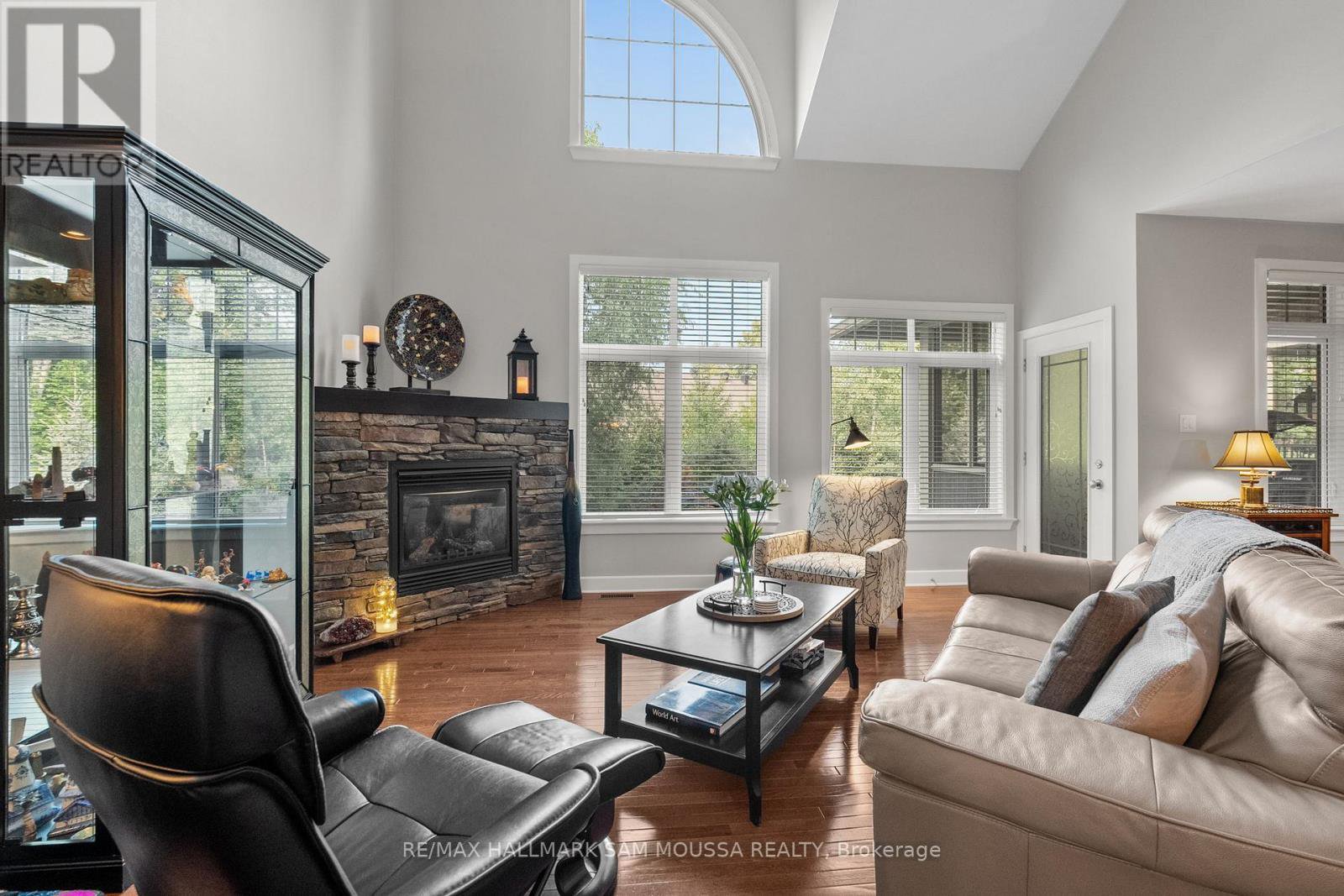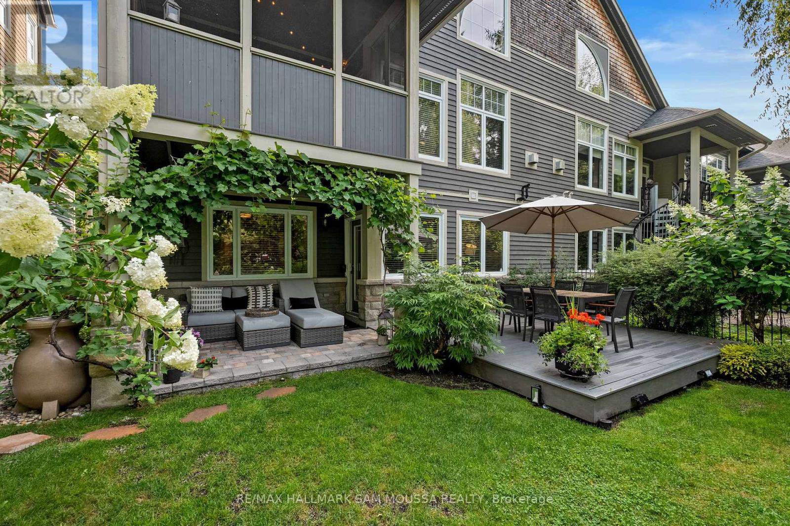 Tucked away in the sought-after enclave of Marshes Village, this beautifully upgraded end-unit townhome offers refined living. Thoughtfully maintained and tastefully enhanced. A foyer with Italian tile sets the tone, opening to open-concept living and dining spaces. Soaring ceilings, expansive windows, and a stone fireplace create a warm atmosphere. The kitchen is a standout, granite counters, stainless steel appliances, and generous cabinetry, all designed with beauty and practicality in mind. A dedicated office, renovated powder room, and laundry area enhance the main level. Off the main living area, a screened-in porch with a gas hookup for BBQ overlooks the back garden. The primary suite is a true retreat, with a large custom walk-in closet and a stunning spa-inspired ensuite. Upstairs, a versatile loft with two closets and a full bath provides flexible living space, ideal for a guest suite or reading nook. Oak hardwood flooring runs throughout, including all three staircases. The finished walk-out lower level offers even more flexibility with a second family room, a spacious bedroom overlooking the garden, a walk-through closet, and a beautifully renovated full bath. This level also features floating oak flooring, adding to the comfort throughout. Outside, professional landscaping enhances the front and rear gardens, a large cedar deck and elegant stone patio provide the perfect backdrop for outdoor entertaining. Recent upgrades include new roof tiles and new wooden front steps. Situated next to the prestigious Marshes Golf Course and just minutes from Kanata Norths high-tech hub, the Brookstreet Hotel, DND, the 417, local shops and restaurants, the Richcraft Rec Complex, and nearby pickleball courts, this home offers a luxurious lifestyle in one of the city's most exclusive communities. Marshes Village Homeowners Association fee is $196/month covers road snow removal, landscaping, general maintenance, audit and insurance with a reserve fund for future needs.