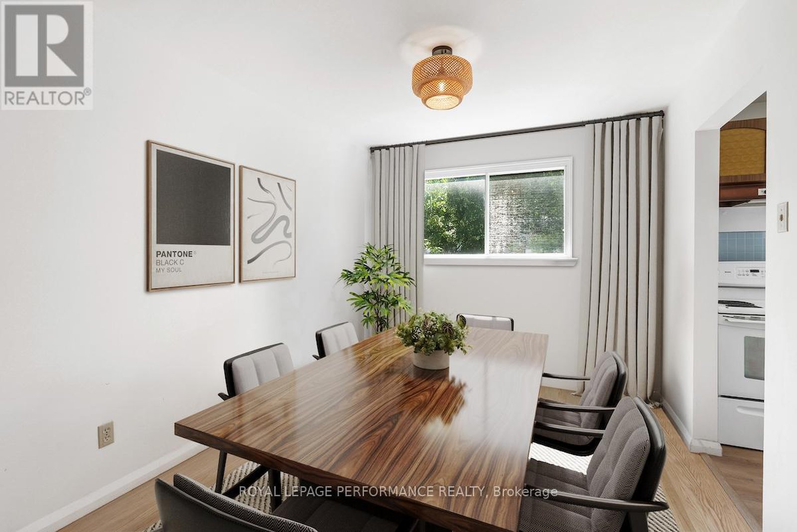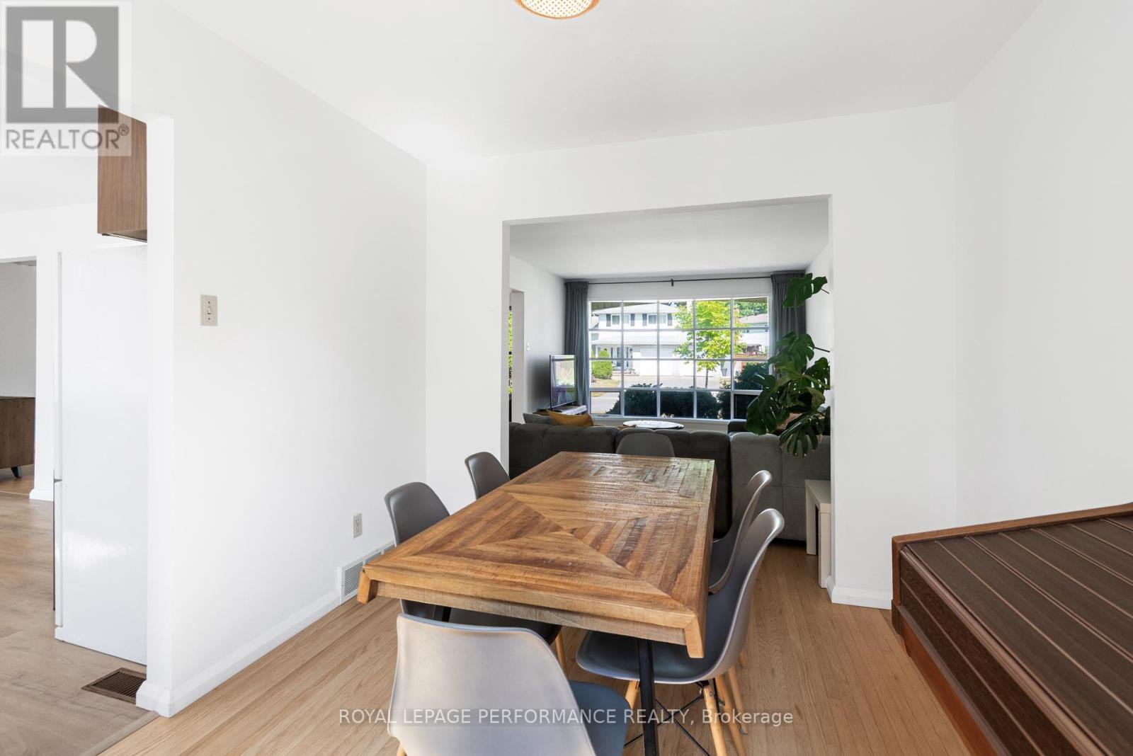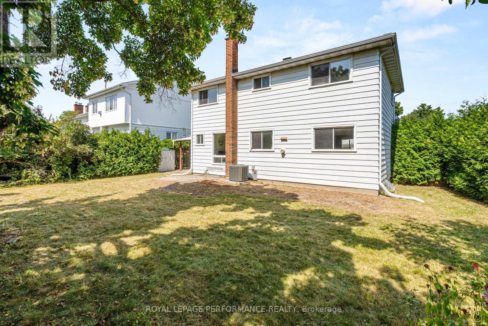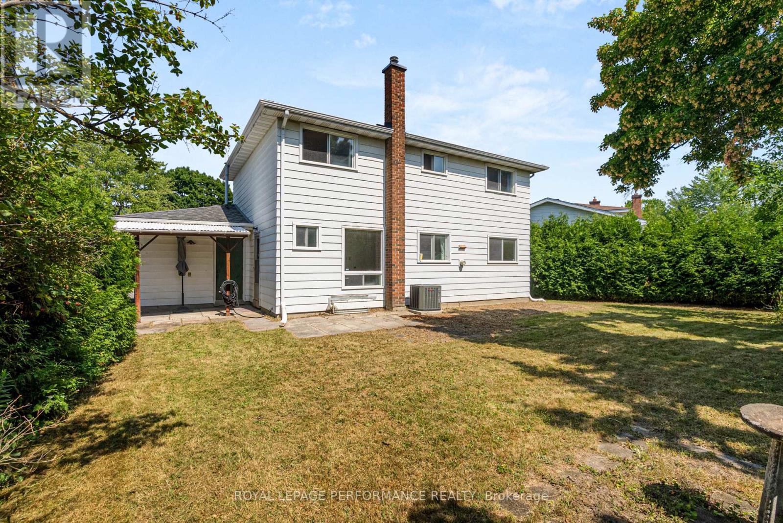 Welcome to this spacious 4-bedroom home ideally situated on a quiet, family-friendly crescent in the heart of Blackburn Hamlet. This two-storey property offers a functional and versatile layout perfect for growing families.The main floor features a bright and inviting family room, a dedicated dining area for hosting, and a cozy living room ideal for everyday relaxation. A convenient powder room and a side entrance to the private yard add practicality to the space. The kitchen area flows well into the backyard, where you'll find a serene, hedged oasis surrounded by mature trees and a covered patio area, perfect for outdoor dining, play, or quiet retreat. The lot is slightly pie shaped. Upstairs, you'll find four generously sized bedrooms, each with good closet space, and a full bathroom. The lower level offers a clean, unfinished basement ready for your customization, whether it be a rec room, home gym, or workshop. Located within walking distance to schools, parks, shopping, and major transit routes, this home offers the perfect blend of suburban peace and urban convenience | Rather than purchasing a home at a higher price point with upgrades that aren't your taste or quality, consider this opportunity to purchase a home that is currently move in ready, where you can update according to your own preferences & timeline | Recent updates & maintenance includes: hardwood floors sanded [2023], removal of the ceiling stipple on the main floor [2023], some light fixtures, removal of the wood panelling & old insulation in the basement [2023], paint [2022], thermostat updated, gas fireplace capped & removed from the living room (where large dining table is in the photos), duct cleaning, annual furnace & AC inspections/servicing, shower head replaced. *Some photos have been virtually staged.