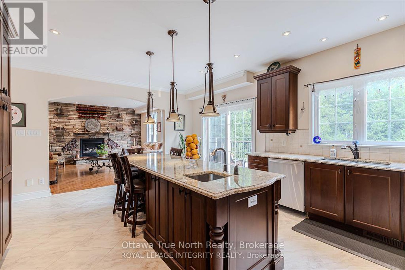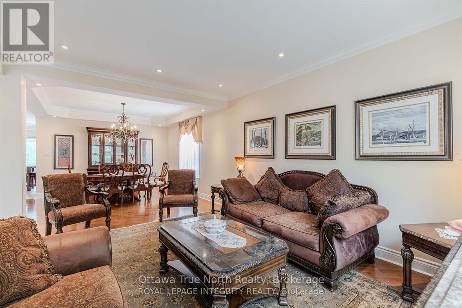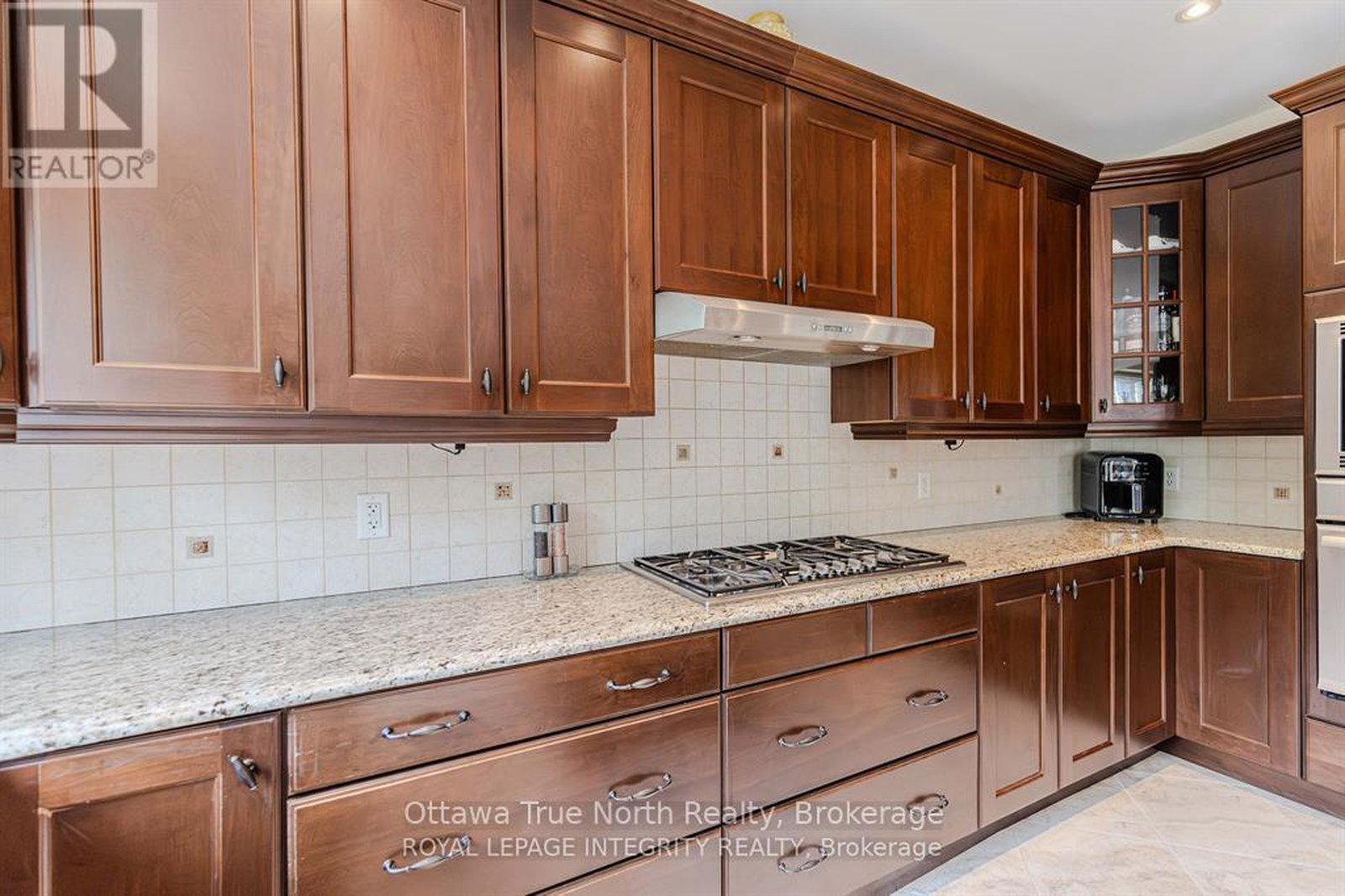 Your Private Backyard Sanctuary --A Rare Blend of Nature, Comfort & Style! This popular Monarch Maple Model sits on a premium pie-shaped lot backing onto protected green space in Stittsville's prestigious Traditions community. Lovingly maintained by the original owners, this 4-bedroom, 4-bathroom home exudes pride of ownership and boasts grand curb appeal. The landscaped front yard is a highlight of the neighborhood, setting the tone for the elegance that continues inside. Step into the open-to-above foyer and feel the warmth of hardwood floors, 9-ft ceilings, and crown molding throughout the main level. The open-concept living and dining rooms feature elegant tray ceilings, while the great room showcases a gas fireplace framed by a striking stone feature wall. The chef-inspired kitchen offers granite counters, high-end appliances, abundant cabinetry, and a large island with prep sink perfect for entertaining and everyday living. A main floor laundry and powder room add convenience. Upstairs, a maple staircase with iron spindles leads to a spacious loft retreat. The primary suite includes a walk-in closet and spa-like 5-piece ensuite. A second bedroom has its own ensuite and walk-in, while the third and fourth bedrooms share a Jack & Jill bath with individual walk-in closets. The private backyard oasis features landscaped gardens, interlock patio, a covered deck with electric awning, and no rear neighbors offering luxurious cottage-like living in the city! Bright and spacious unfinished lower level with four full egress windows and a rough-in, offering endless possibilities for your custom design.