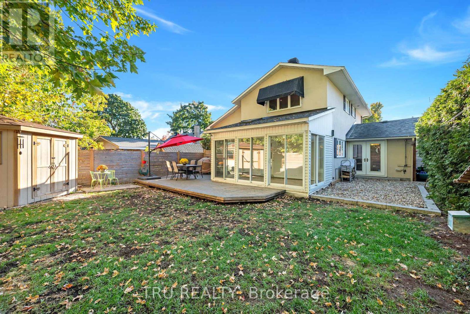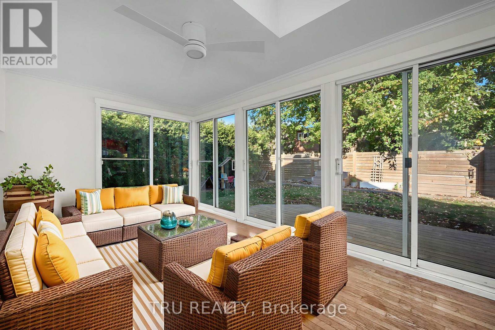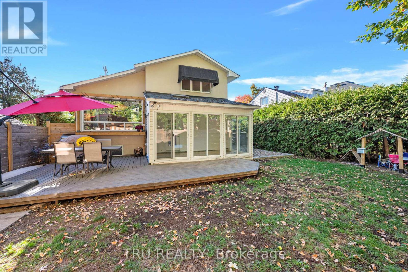 Welcome to 189 St. Laurent - a stylish and spacious side-split retreat, privately hidden behind a lush hedge in highly sought-after Manor Park! The thoughtfully redesigned landscaping offers exceptional curb appeal, complemented by a welcoming double-width driveway. Step inside to a bright and airy foyer with custom built-in storage and a convenient powder room. The generous eat-in kitchen provides abundant cabinetry, ample workspace, and direct flow into the inviting rear sunroom - the perfect spot for your morning coffee, surrounded by floor-to-ceiling sliding doors and natural light. The open-concept living and dining areas are anchored by a stunning vaulted ceiling, showcasing timeless mid-century modern character and ideal for entertaining. Upstairs, two well-sized bedrooms are thoughtfully placed at opposite ends of the home for added privacy, joined by a stylish main bathroom and a versatile office or nursery. The former garage has been converted into a comfortable main-level family room - perfect for a creative studio, guest suite, or cozy lounge. On the lower level, discover a laundry / utility room space, a flexible recreation room, and generous storage space to keep everything neatly organized. Set on a beautifully landscaped and fully fenced lot, this home combines timeless design with modern functionality - just moments from parks, shopping, and transit. Recent updates include: upgraded 200-amp panel (2022), Bosch high-efficiency heat pump furnace (2022), exterior shed (2022), fenced yard, and roof (2016).