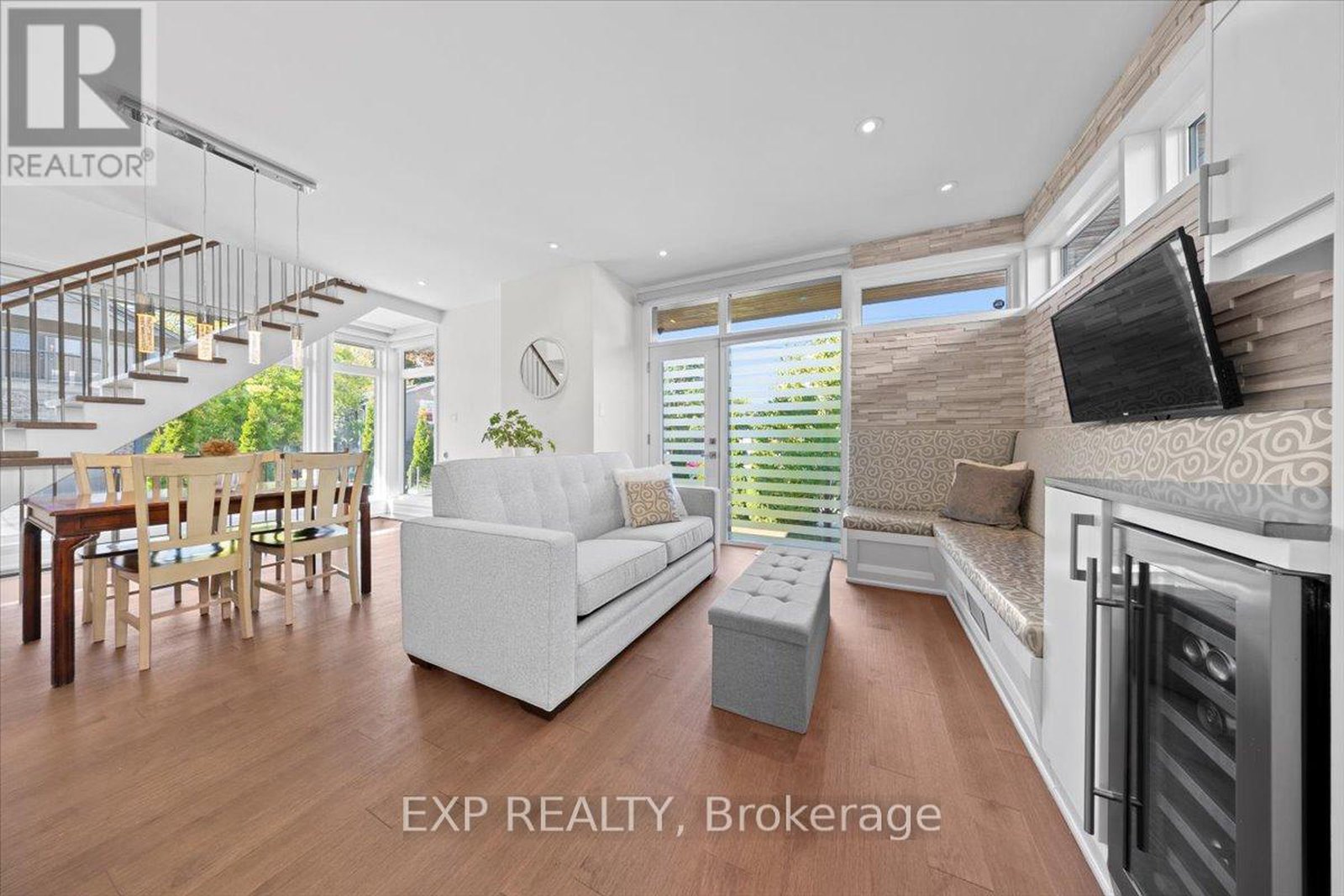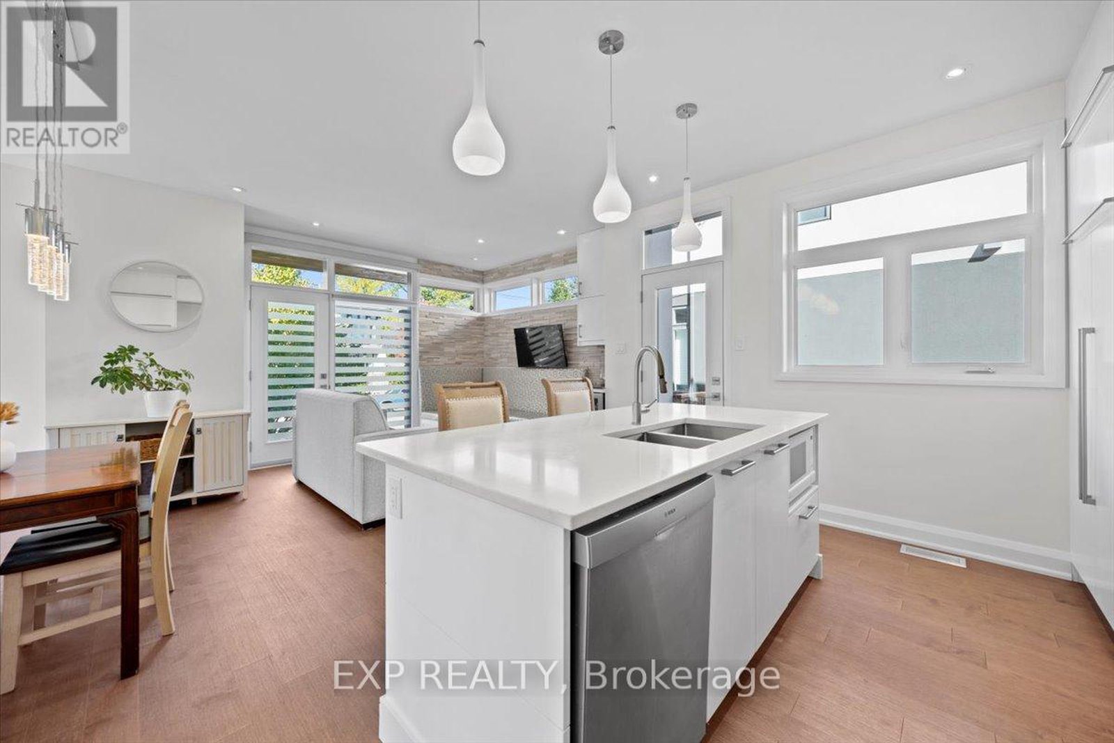 Welcome to this truly unique 3-bedroom, 3-bath home in the heart of Westboro, combining modern design with everyday comfort. The main level features a sleek kitchen with quartz countertops, an eating nook, and a stylish wine station perfect for entertaining. Large windows, engineered flooring, and 9-ft ceilings create an airy, light-filled space that flows seamlessly into the open-concept living and dining areas. Upstairs, you'll find two well-sized bedrooms, two full baths (including an ensuite), and a convenient laundry area. The lower level offers a spacious lounge, third bedroom, and an additional full bath an excellent retreat for guests or family. Step outside to enjoy private outdoor spaces designed for every moment of the day a sunny west-facing patio ideal for relaxing or dining al fresco, and a tranquil east-facing deck with direct kitchen access, perfect for morning coffee. All this is located just steps from Richmond Road, where you'll find Westboro's vibrant mix of boutique shops, restaurants, parks, and the Ottawa River pathways. A rare opportunity to enjoy stylish, low-maintenance living in one of Ottawa's most sought-after neighbourhoods.