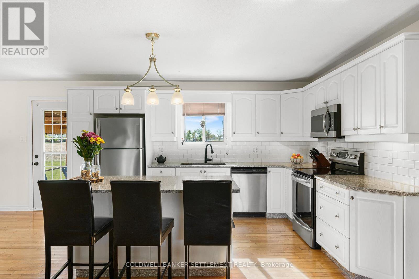 Custom-built all-brick raised bungalow offering 1,500 sq ft (est.) of functional living space, located on a quiet dead-end road just off Drummond Concession 7. Enjoy a peaceful rural setting with friendly neighbours & a strong sense of community. The location offers quick, direct access to Highway 7-making commuting to Ottawa easy & placing you just 10 minutes from all the amenities in Perth. The gently sloping lot has great drainage & offers plenty of parking. Pride of ownership is evident throughout the home, which has been very well maintained & thoughtfully updated over time. Inside, you'll find a bright & spacious foyer with tall ceilings & large windows that fill the home with natural light. The main level features hardwood flooring throughout-no carpet, a modern open-concept kitchen with a large island, a generous dining area, & direct walkout to a covered rear deck-ideal for outdoor meals, morning coffee, or simply enjoying the quiet surroundings. There are two bedrooms on the main floor, including a primary with walk-in closet, plus a full 4-piece bathroom. The lower level is fully finished & benefits from the raised bungalow design, with large windows that keep the space bright & welcoming. It includes an open family & recreation room, two additional bedrooms, a combination 4-piece bath & laundry area, & a large utility/storage room. Additional features include an attached 2-car garage with interior access, an updated heating system, & is wired for a generator for added peace of mind. This is a solid, comfortable home offering a great mix of privacy, convenience, & community-perfect for those seeking relaxed country living without sacrificing location or lifestyle.