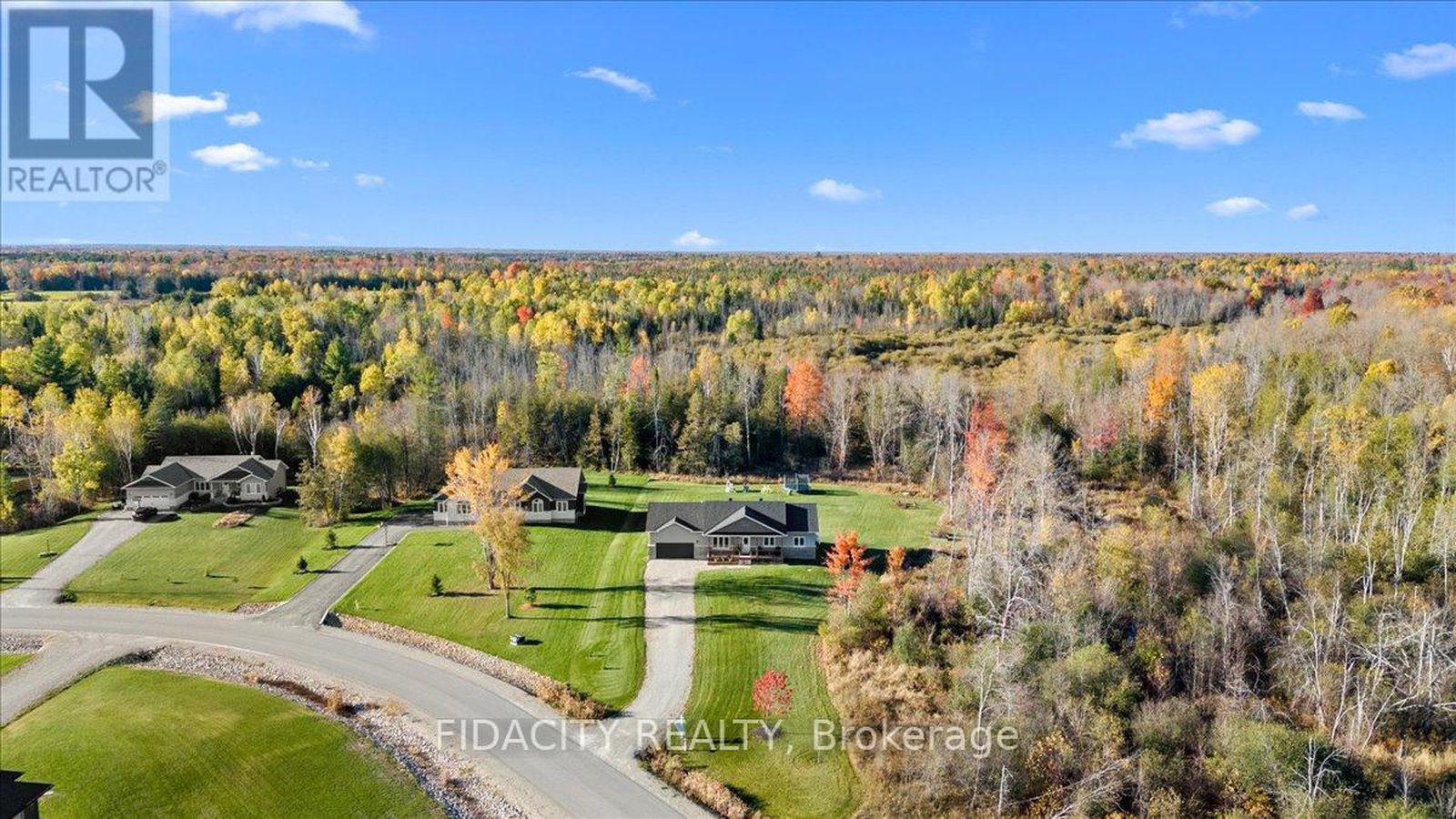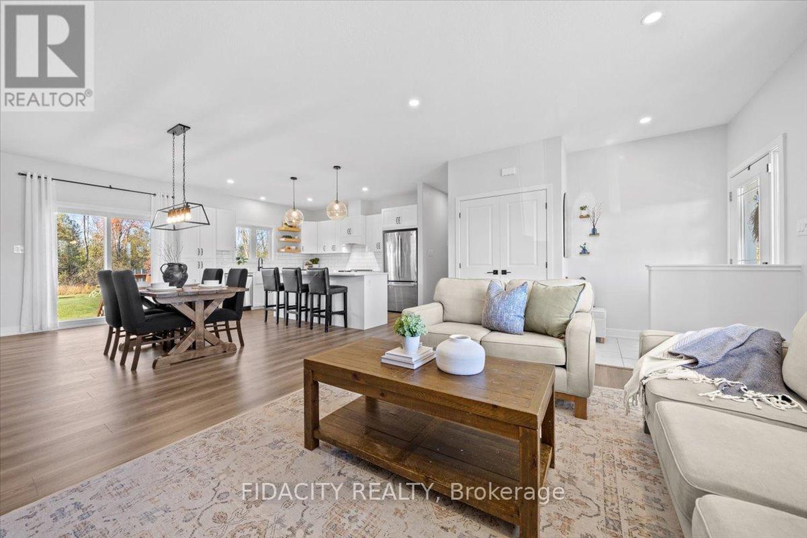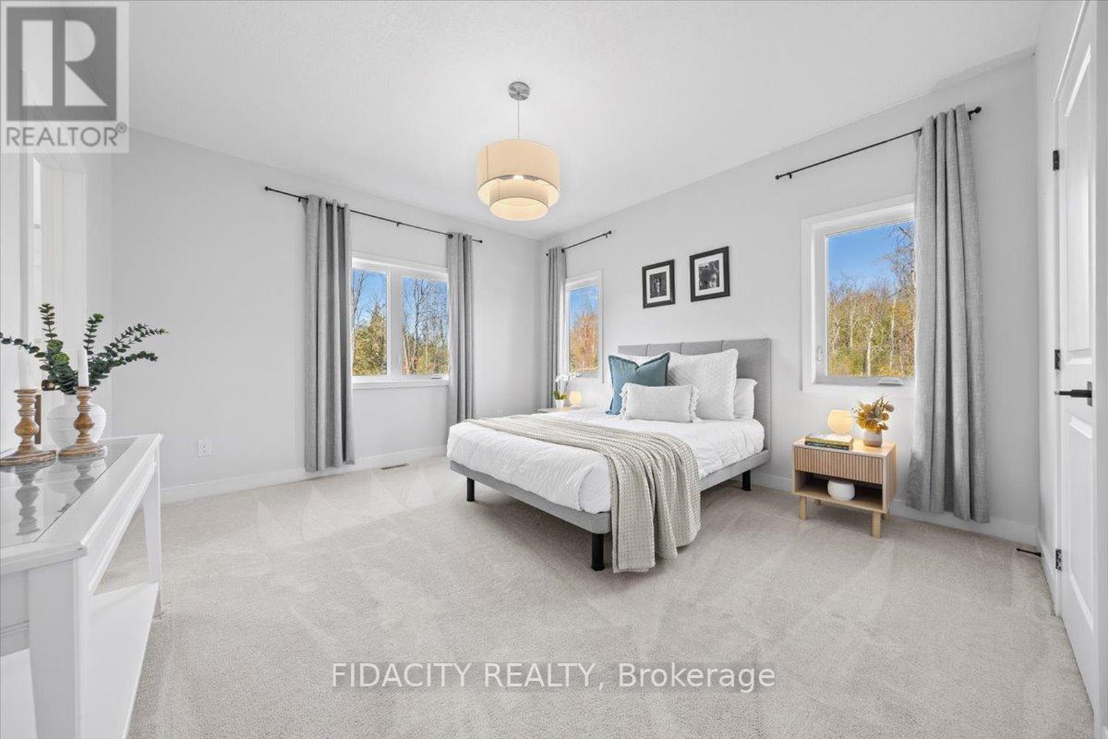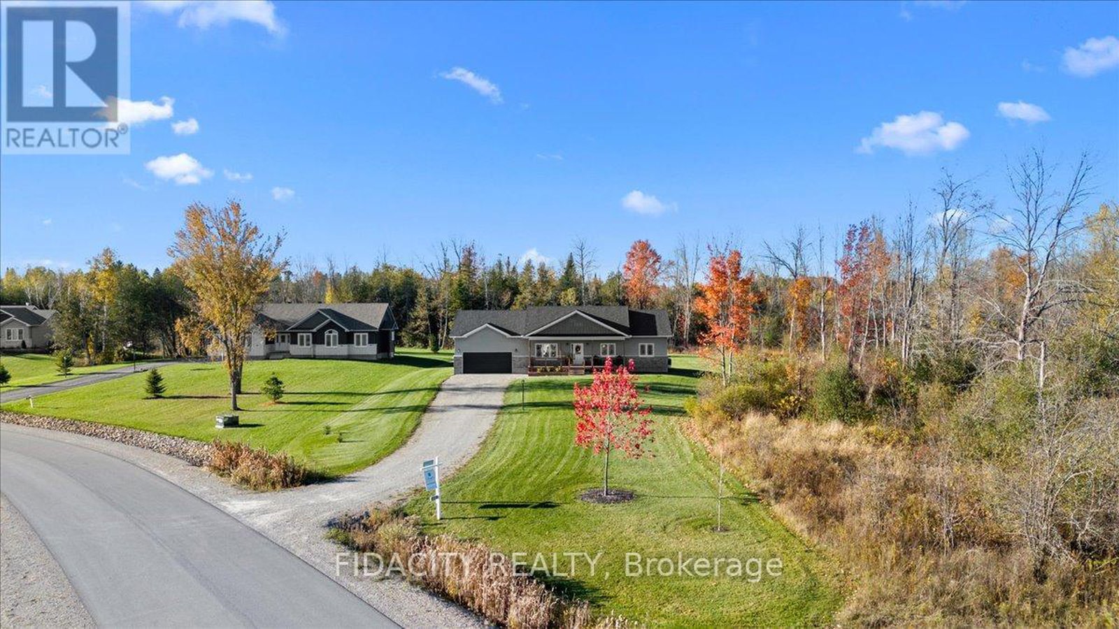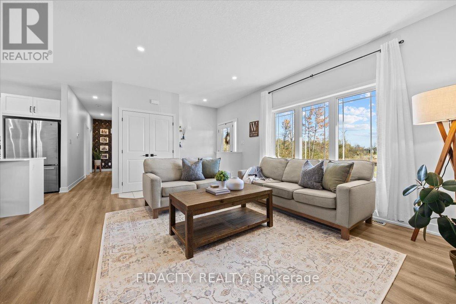 Welcome to 282 Ej's Lane, a stunning 3-bedroom bungalow sitting on 3.7 acres in the highly sought-after Moodie Estates. Nestled on a quiet street with no rear neighbours, this home offers privacy and tranquility with a long driveway leading to a double car garage featuring 11.5 feet ceilings. The main floor boasts 9-foot ceilings throughout and an open-concept layout with a beautifully upgraded chef's kitchen showcasing white cabinetry, quartz countertops, a large island with seating for four, built-in microwave, ample storage, and a farmhouse sink overlooking the picturesque yard. The spacious dining area is perfect for hosting family and friends, while the bright living room features large windows that flood the space with natural light and a cozy gas fireplace with a stone surround and wood mantle. The bedrooms are thoughtfully separated from the main living area, with the primary suite offering space for a king-sized bed, a walk-in closet, and a luxurious 4-piece ensuite with a glass shower, double sinks, and a double-door linen closet. The two additional bedrooms are well-sized with beautiful windows and accent walls. The lower level doubles the sqft and includes a finished office and bathroom rough-in, ready for your finishing touches. A functional mudroom and laundry area provide direct garage access and additional storage. Outside, enjoy a beautifully landscaped yard with a cozy firepit area and full front and back irrigation system to keep your lawn lush all summer long. Additional highlights include a gas BBQ line, Bell Fibe availability, constant pressure system, GenerLink at the meter base, upgraded siding, owned hot water tank and much more! The property's acreage extends into the trees to the right of the property and the neighbour owns the other half. Forest to the back and side lead to walking trails, all just minutes from Carleton Place and a short drive to Ottawa. This is one you don't want to miss!