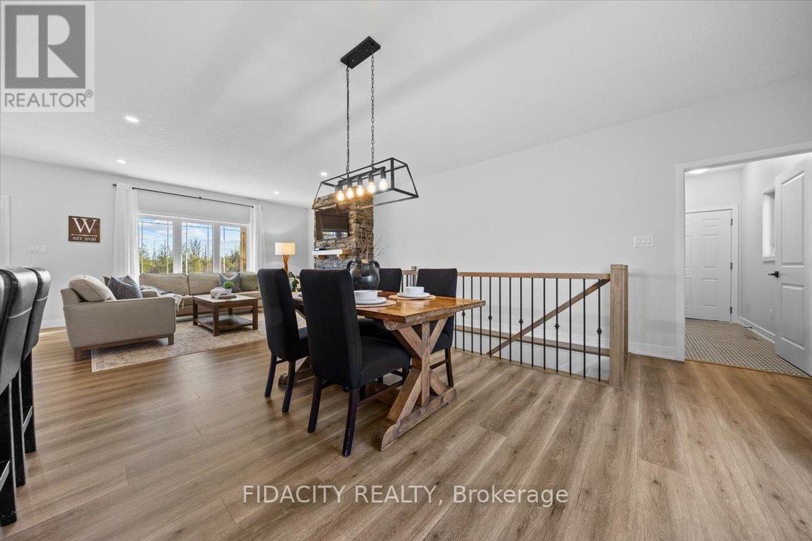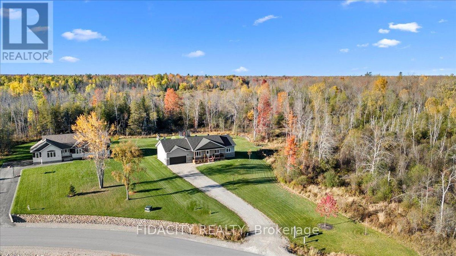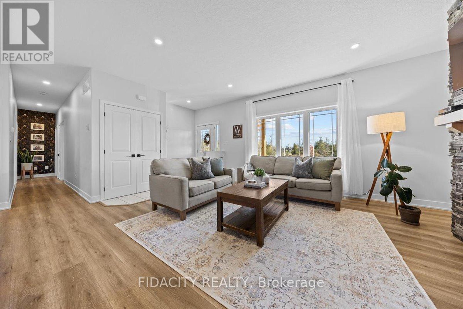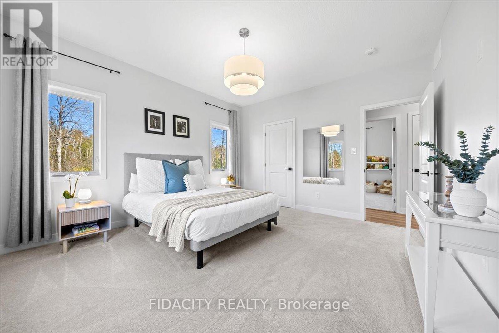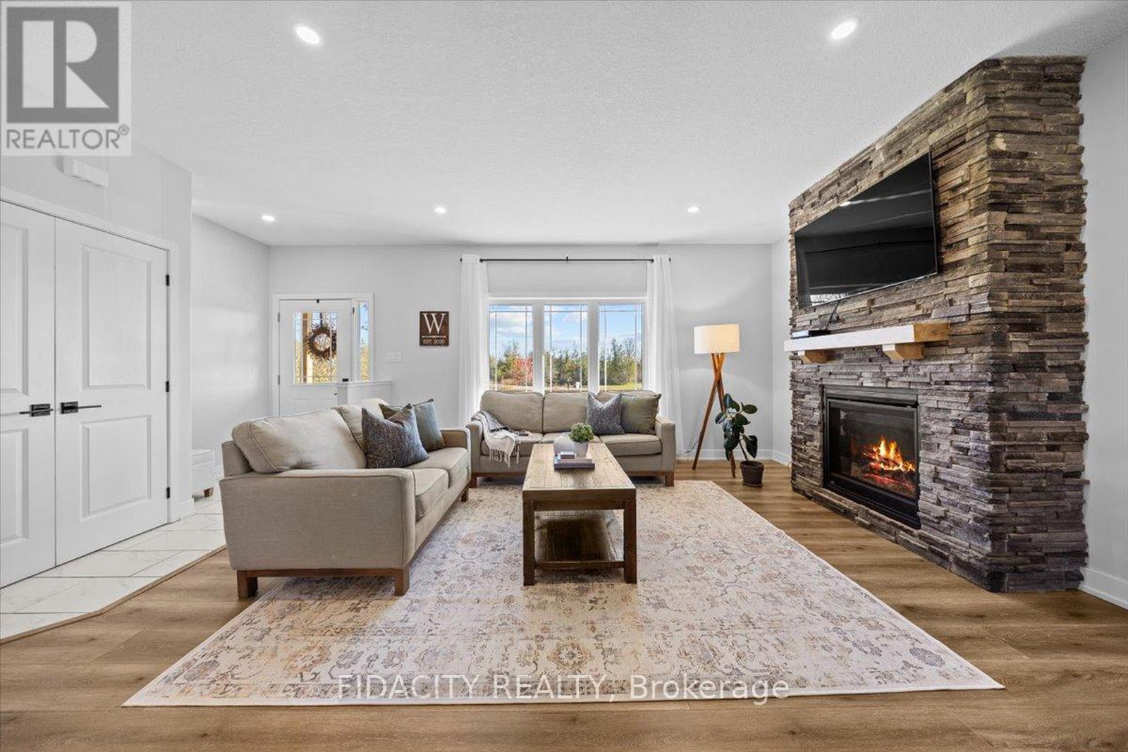 Welcome to 282 Ej's Lane, a stunning 3-bedroom bungalow sitting on 3.7 acres in the highly sought-after Moodie Estates. Nestled on a quiet street with no rear neighbours, this home offers privacy and tranquility with a long driveway leading to a double car garage featuring 11.5 feet ceilings. The main floor boasts 9-foot ceilings throughout and an open-concept layout with a beautifully upgraded chef's kitchen showcasing white cabinetry, quartz countertops, a large island with seating for four, built-in microwave, ample storage, and a farmhouse sink overlooking the picturesque yard. The spacious dining area is perfect for hosting family and friends, while the bright living room features large windows that flood the space with natural light and a cozy gas fireplace with a stone surround and wood mantle. The bedrooms are thoughtfully separated from the main living area, with the primary suite offering space for a king-sized bed, a walk-in closet, and a luxurious 4-piece ensuite with a glass shower, double sinks, and a double-door linen closet. The two additional bedrooms are well-sized with beautiful windows and accent walls. The lower level doubles the sqft and includes a finished office and bathroom rough-in, ready for your finishing touches. A functional mudroom and laundry area provide direct garage access and additional storage. Outside, enjoy a beautifully landscaped yard with a cozy firepit area and full front and back irrigation system to keep your lawn lush all summer long. Additional highlights include a gas BBQ line, Bell Fibe availability, constant pressure system, GenerLink at the meter base, upgraded siding, owned hot water tank and much more! The property's acreage extends into the trees to the right of the property and the neighbour owns the other half. Forest to the back and side lead to walking trails, all just minutes from Carleton Place and a short drive to Ottawa. This is one you don't want to miss!