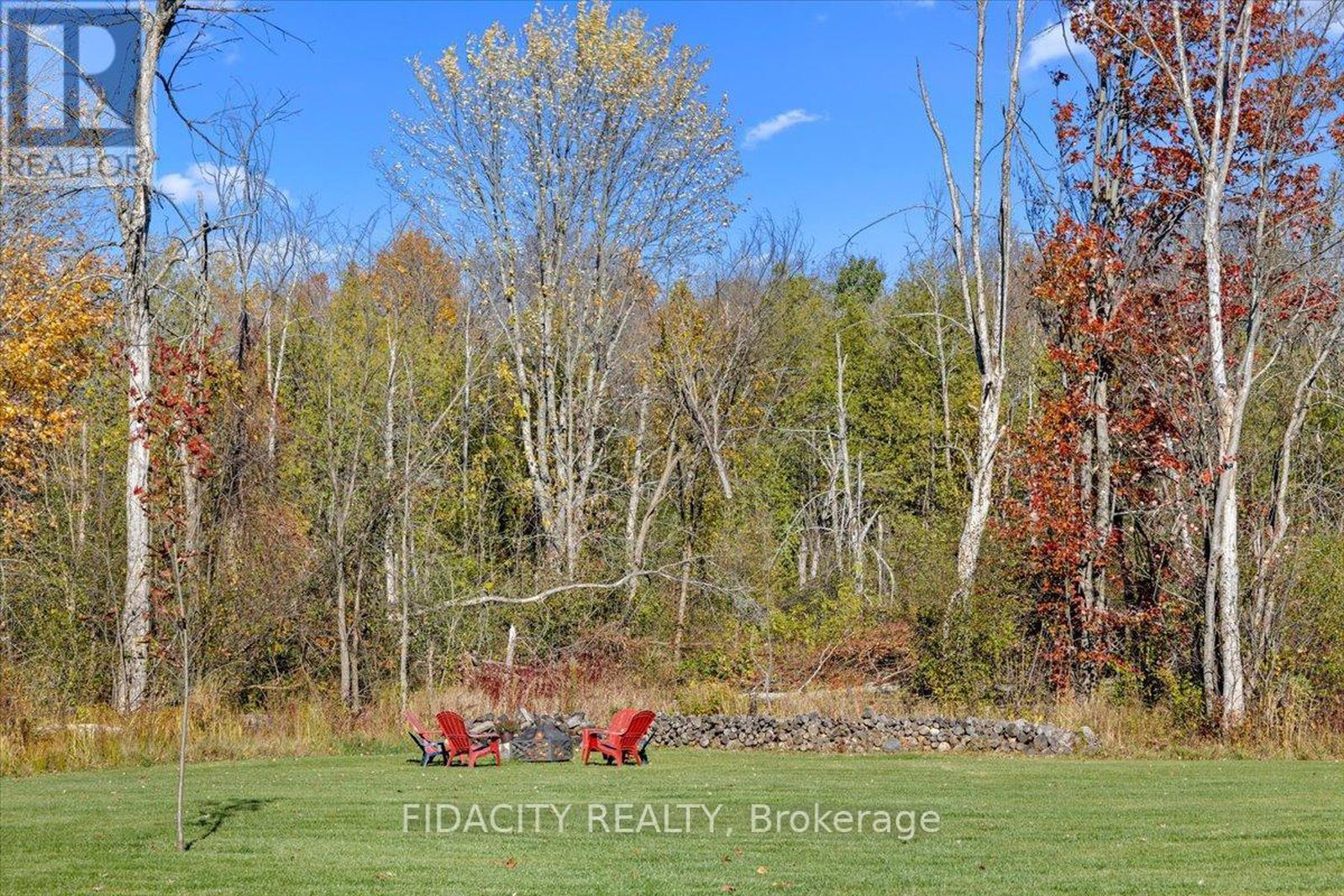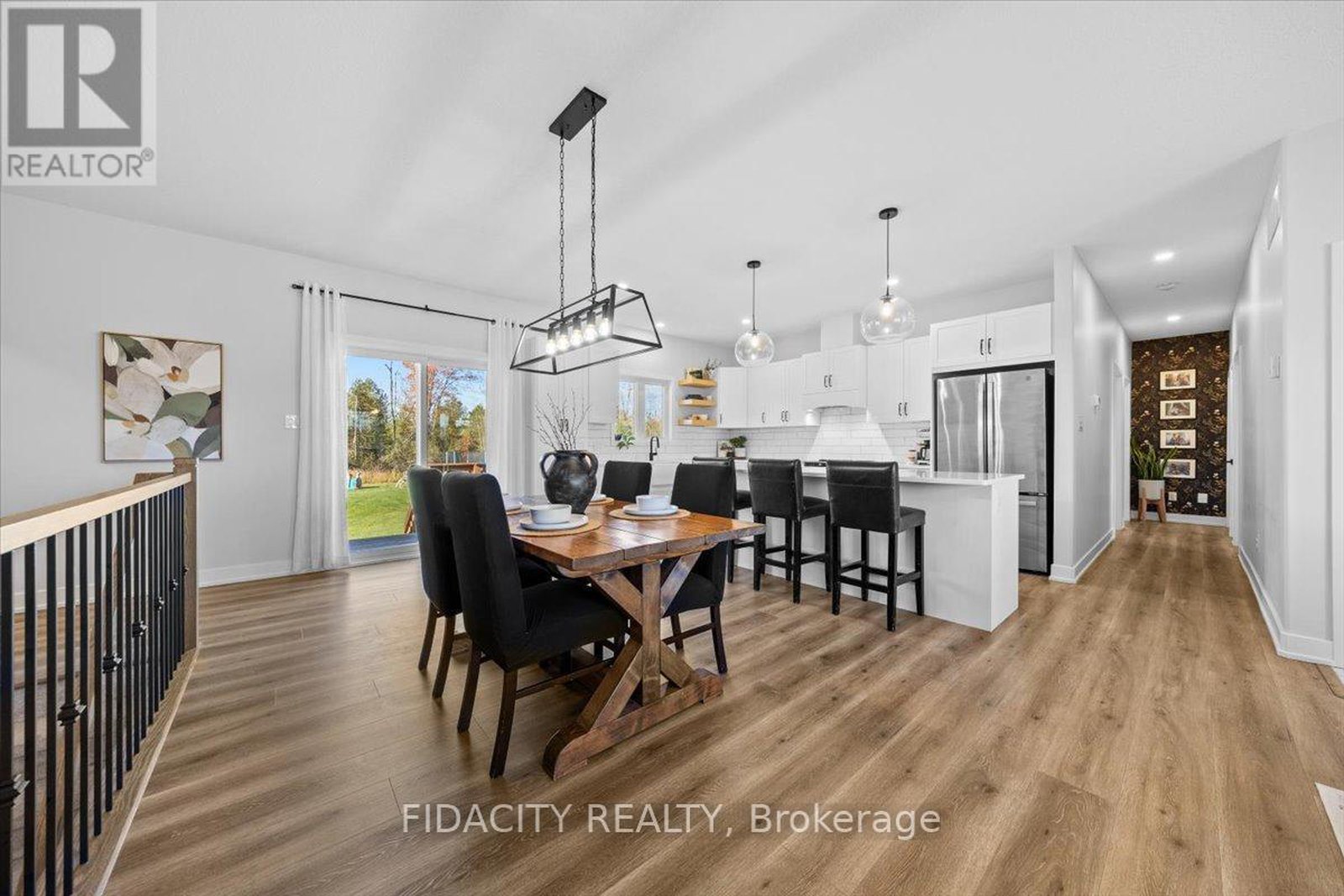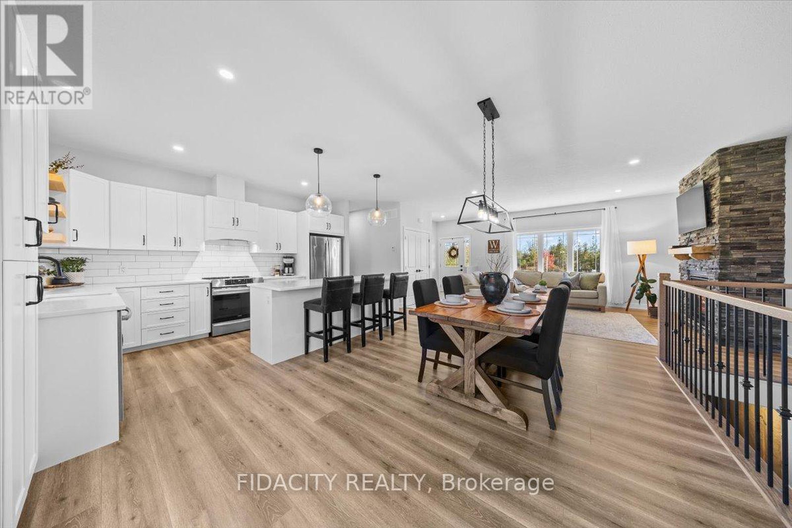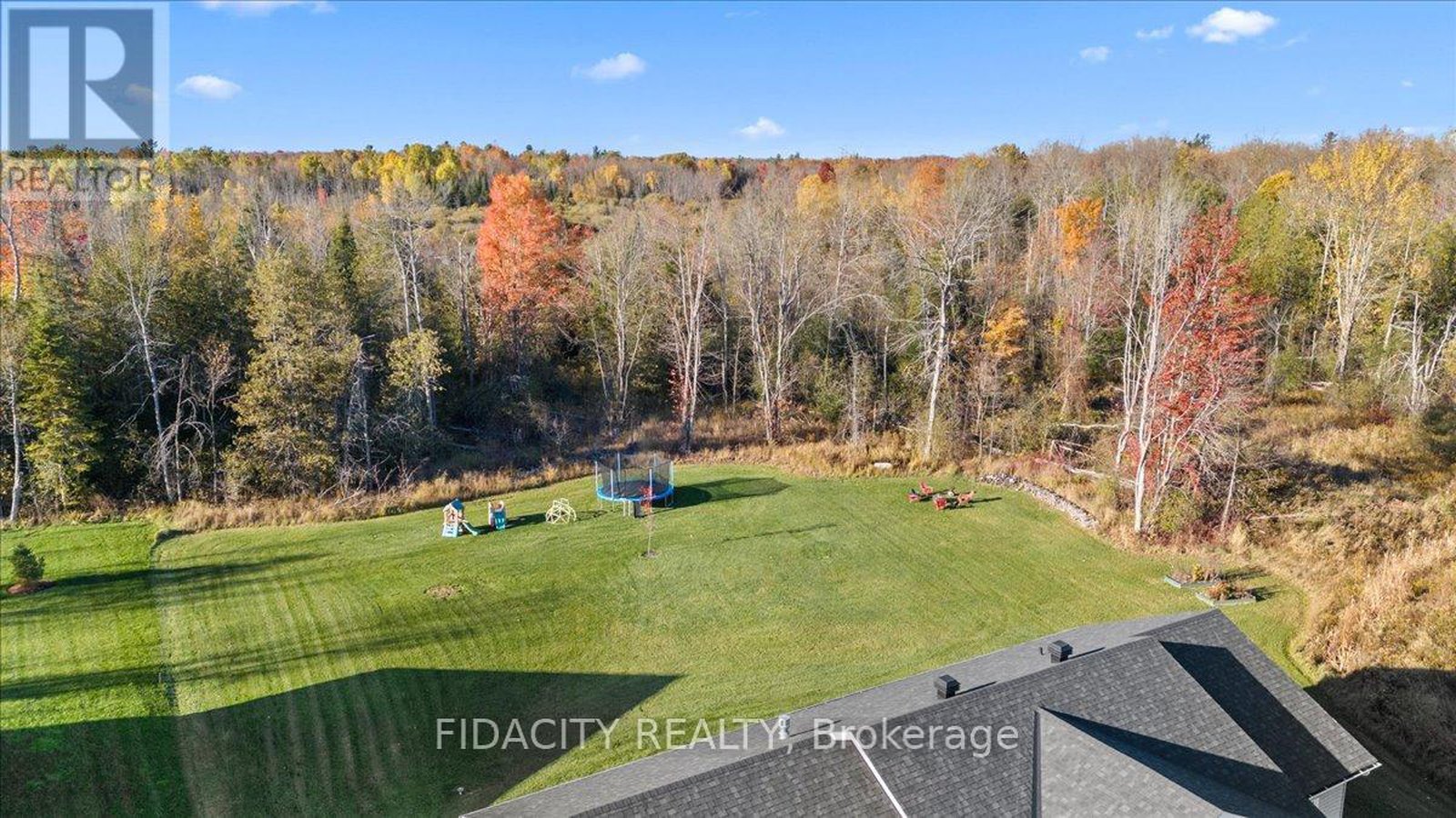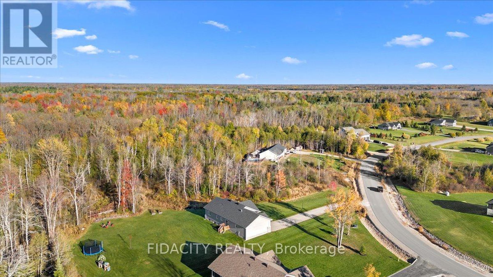 Welcome to 282 Ej's Lane, a stunning 3-bedroom bungalow sitting on 3.7 acres in the highly sought-after Moodie Estates. Nestled on a quiet street with no rear neighbours, this home offers privacy and tranquility with a long driveway leading to a double car garage featuring 11.5 feet ceilings. The main floor boasts 9-foot ceilings throughout and an open-concept layout with a beautifully upgraded chef's kitchen showcasing white cabinetry, quartz countertops, a large island with seating for four, built-in microwave, ample storage, and a farmhouse sink overlooking the picturesque yard. The spacious dining area is perfect for hosting family and friends, while the bright living room features large windows that flood the space with natural light and a cozy gas fireplace with a stone surround and wood mantle. The bedrooms are thoughtfully separated from the main living area, with the primary suite offering space for a king-sized bed, a walk-in closet, and a luxurious 4-piece ensuite with a glass shower, double sinks, and a double-door linen closet. The two additional bedrooms are well-sized with beautiful windows and accent walls. The lower level doubles the sqft and includes a finished office and bathroom rough-in, ready for your finishing touches. A functional mudroom and laundry area provide direct garage access and additional storage. Outside, enjoy a beautifully landscaped yard with a cozy firepit area and full front and back irrigation system to keep your lawn lush all summer long. Additional highlights include a gas BBQ line, Bell Fibe availability, constant pressure system, GenerLink at the meter base, upgraded siding, owned hot water tank and much more! The property's acreage extends into the trees to the right of the property and the neighbour owns the other half. Forest to the back and side lead to walking trails, all just minutes from Carleton Place and a short drive to Ottawa. This is one you don't want to miss!