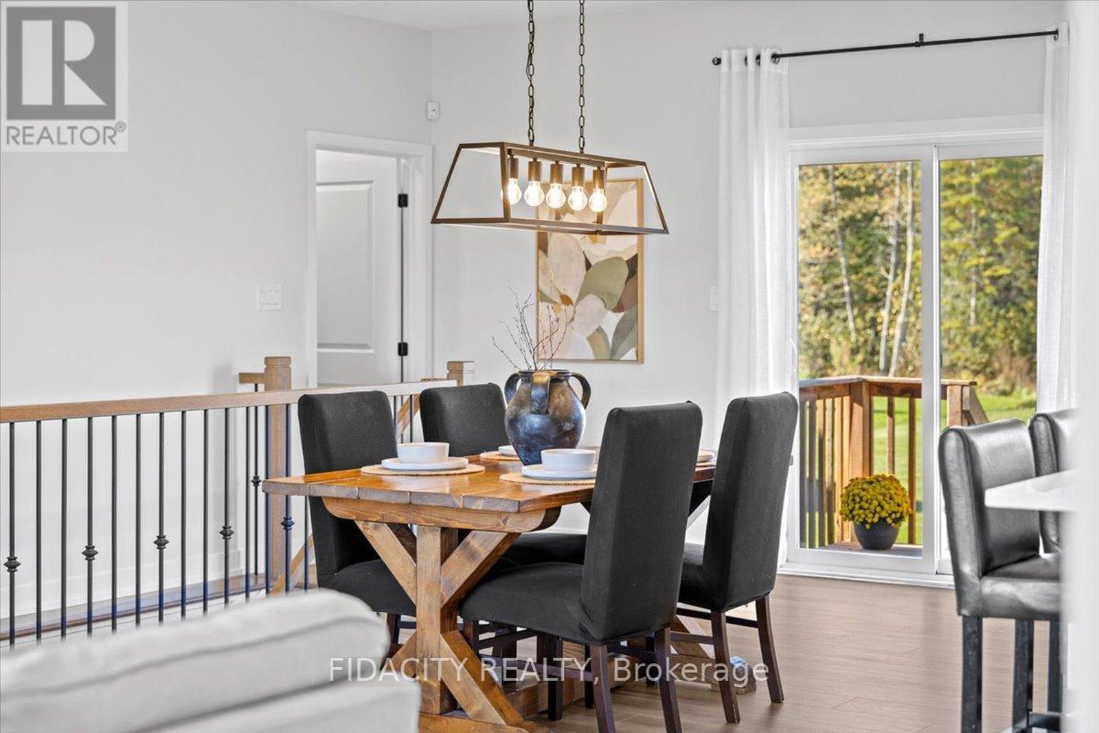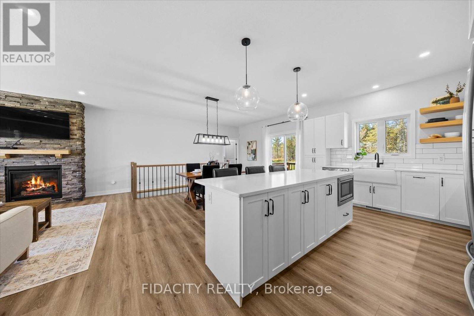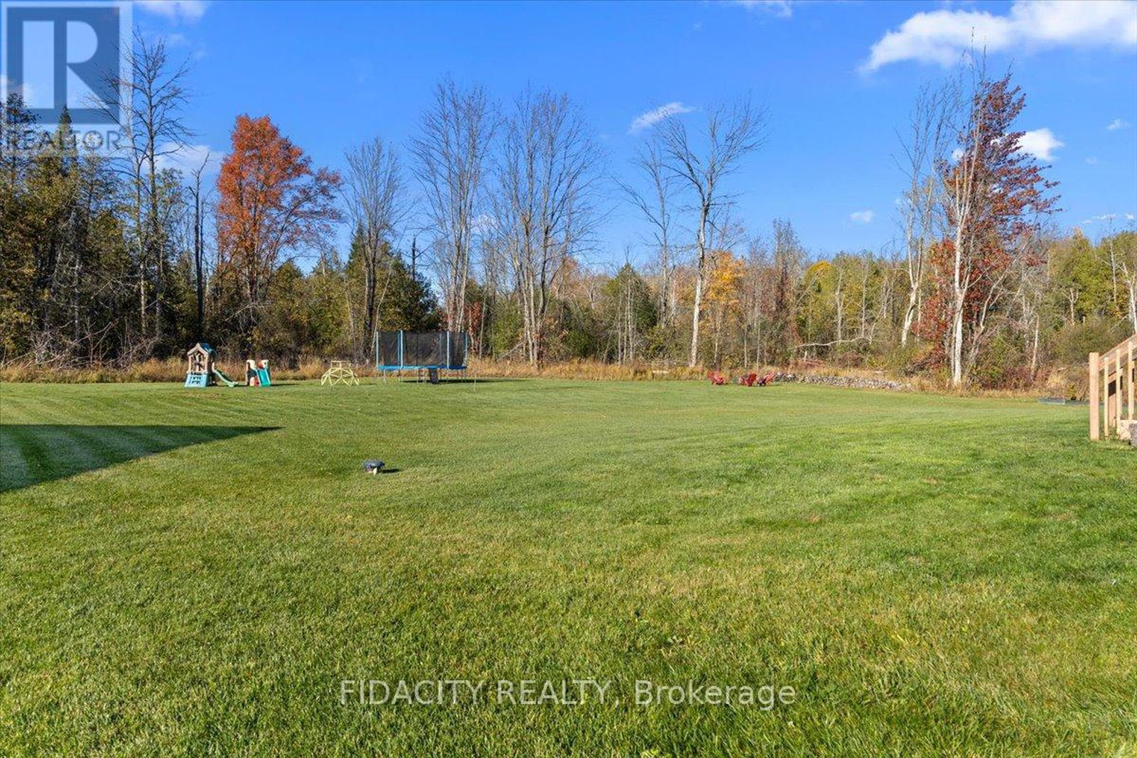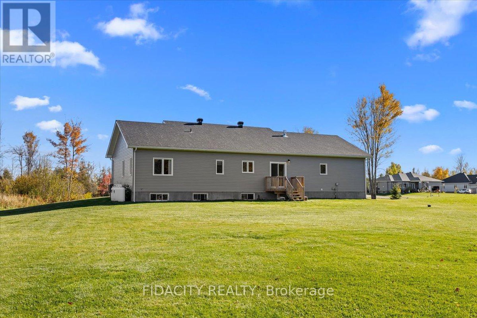 Welcome to 282 Ej's Lane, a stunning 3-bedroom bungalow sitting on 3.7 acres in the highly sought-after Moodie Estates. Nestled on a quiet street with no rear neighbours, this home offers privacy and tranquility with a long driveway leading to a double car garage featuring 11.5 feet ceilings. The main floor boasts 9-foot ceilings throughout and an open-concept layout with a beautifully upgraded chef's kitchen showcasing white cabinetry, quartz countertops, a large island with seating for four, built-in microwave, ample storage, and a farmhouse sink overlooking the picturesque yard. The spacious dining area is perfect for hosting family and friends, while the bright living room features large windows that flood the space with natural light and a cozy gas fireplace with a stone surround and wood mantle. The bedrooms are thoughtfully separated from the main living area, with the primary suite offering space for a king-sized bed, a walk-in closet, and a luxurious 4-piece ensuite with a glass shower, double sinks, and a double-door linen closet. The two additional bedrooms are well-sized with beautiful windows and accent walls. The lower level doubles the sqft and includes a finished office and bathroom rough-in, ready for your finishing touches. A functional mudroom and laundry area provide direct garage access and additional storage. Outside, enjoy a beautifully landscaped yard with a cozy firepit area and full front and back irrigation system to keep your lawn lush all summer long. Additional highlights include a gas BBQ line, Bell Fibe availability, constant pressure system, GenerLink at the meter base, upgraded siding, owned hot water tank and much more! The property's acreage extends into the trees to the right of the property and the neighbour owns the other half. Forest to the back and side lead to walking trails, all just minutes from Carleton Place and a short drive to Ottawa. This is one you don't want to miss!