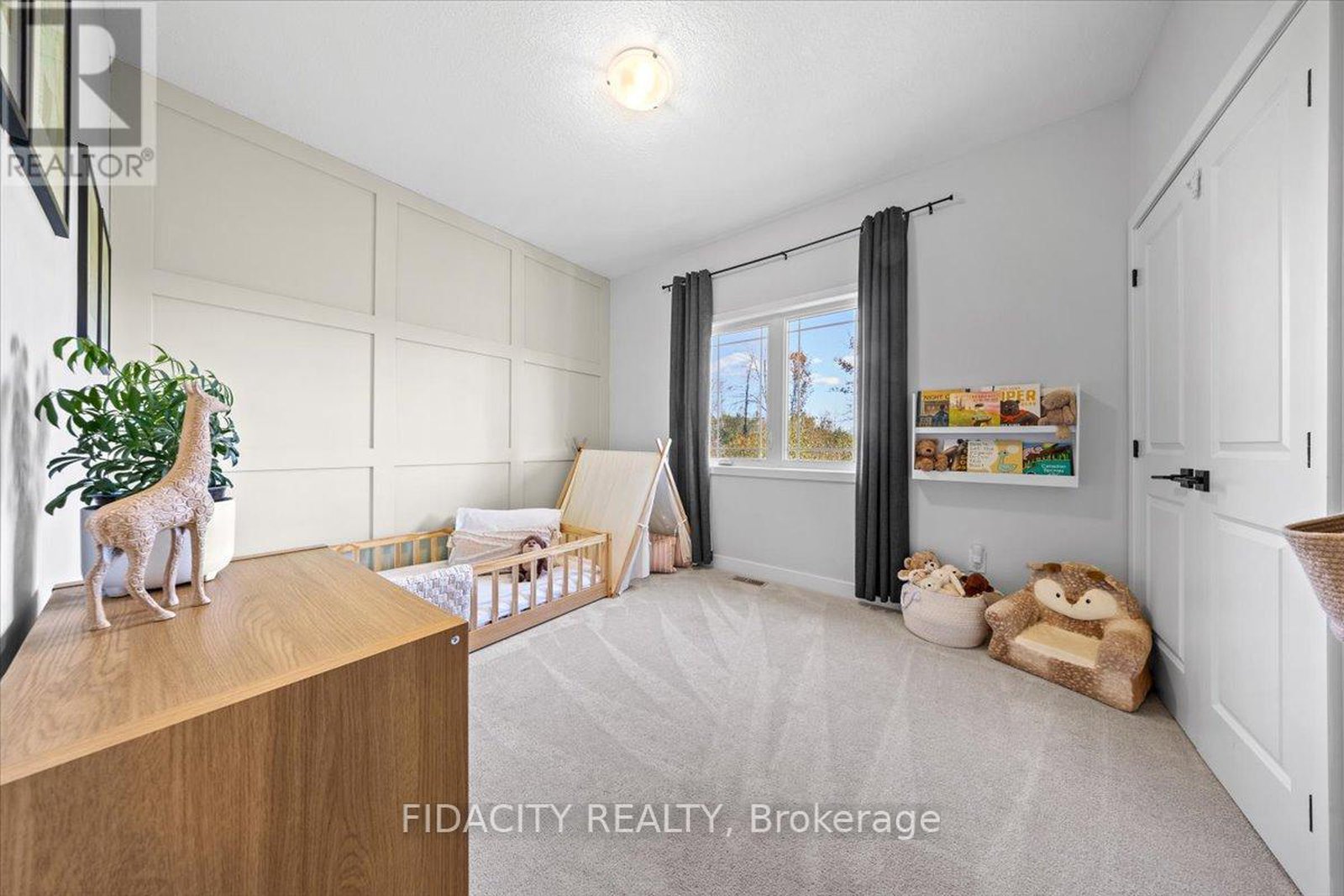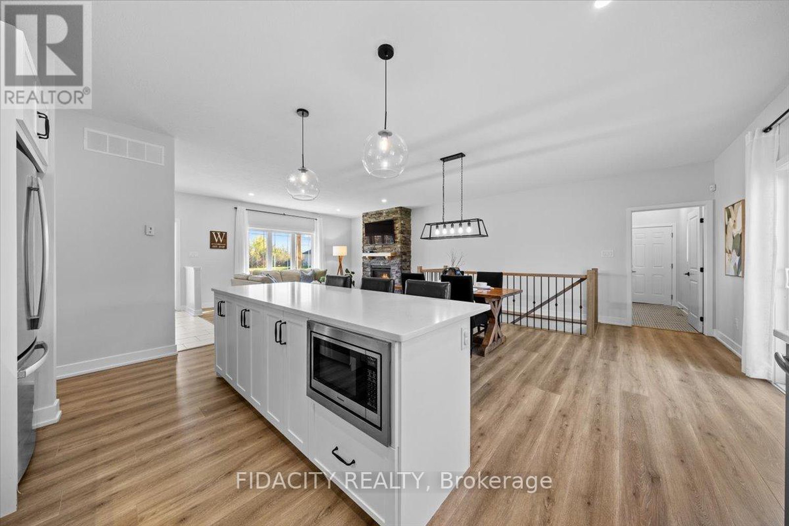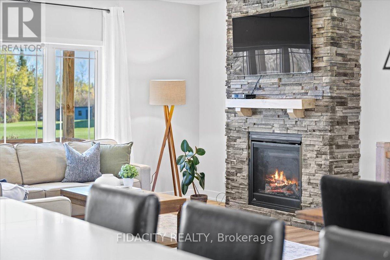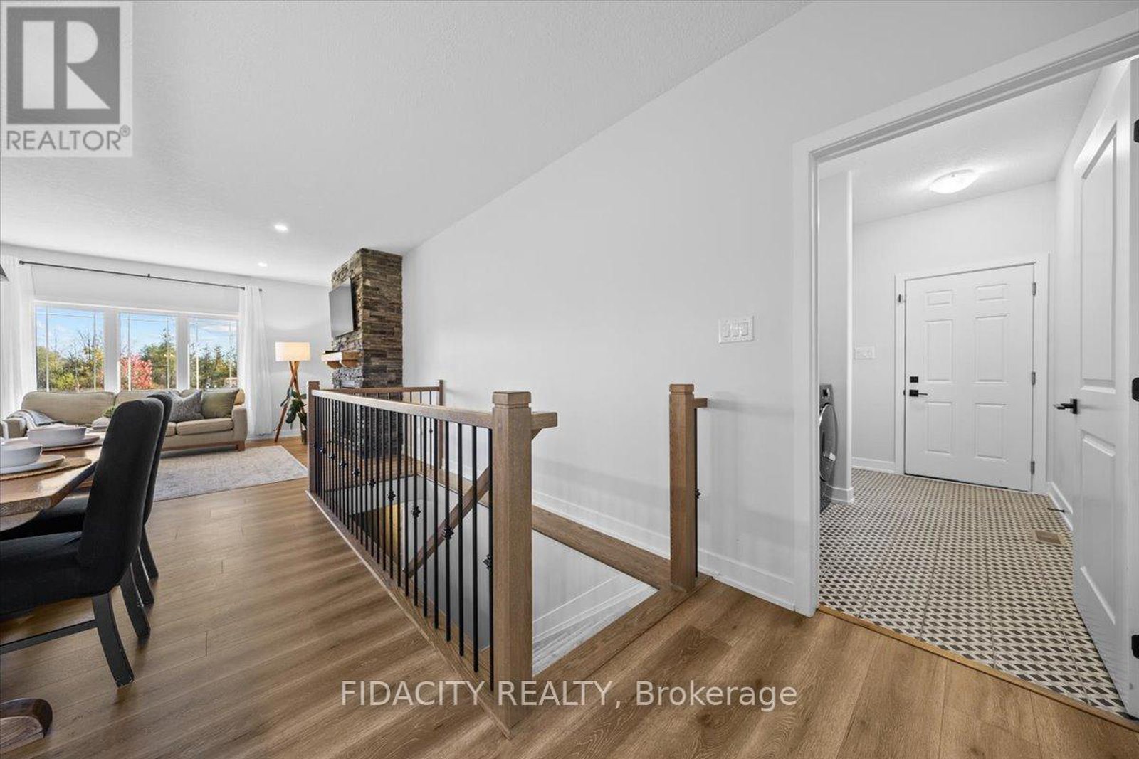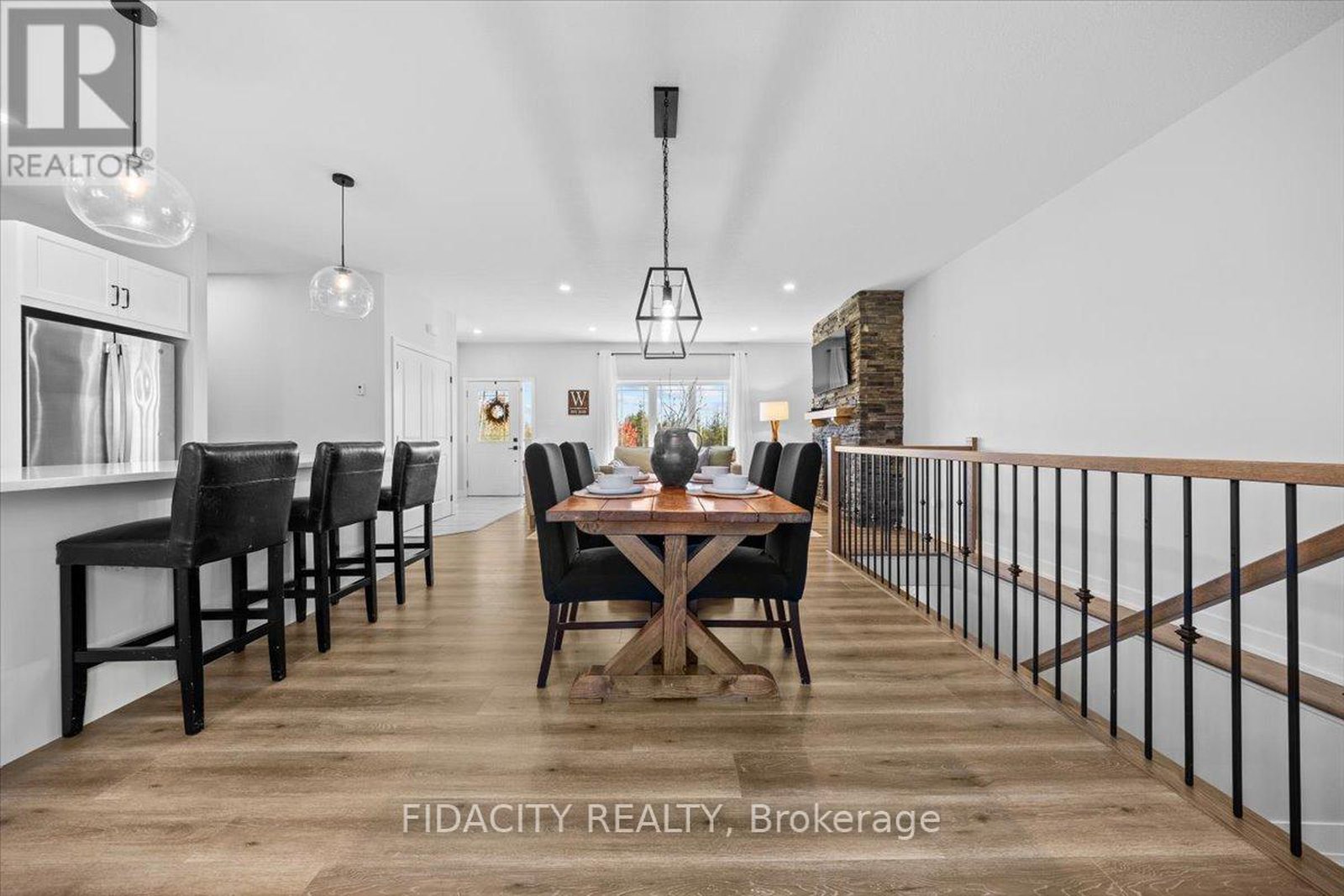 Welcome to 282 Ej's Lane, a stunning 3-bedroom bungalow sitting on 3.7 acres in the highly sought-after Moodie Estates. Nestled on a quiet street with no rear neighbours, this home offers privacy and tranquility with a long driveway leading to a double car garage featuring 11.5 feet ceilings. The main floor boasts 9-foot ceilings throughout and an open-concept layout with a beautifully upgraded chef's kitchen showcasing white cabinetry, quartz countertops, a large island with seating for four, built-in microwave, ample storage, and a farmhouse sink overlooking the picturesque yard. The spacious dining area is perfect for hosting family and friends, while the bright living room features large windows that flood the space with natural light and a cozy gas fireplace with a stone surround and wood mantle. The bedrooms are thoughtfully separated from the main living area, with the primary suite offering space for a king-sized bed, a walk-in closet, and a luxurious 4-piece ensuite with a glass shower, double sinks, and a double-door linen closet. The two additional bedrooms are well-sized with beautiful windows and accent walls. The lower level doubles the sqft and includes a finished office and bathroom rough-in, ready for your finishing touches. A functional mudroom and laundry area provide direct garage access and additional storage. Outside, enjoy a beautifully landscaped yard with a cozy firepit area and full front and back irrigation system to keep your lawn lush all summer long. Additional highlights include a gas BBQ line, Bell Fibe availability, constant pressure system, GenerLink at the meter base, upgraded siding, owned hot water tank and much more! The property's acreage extends into the trees to the right of the property and the neighbour owns the other half. Forest to the back and side lead to walking trails, all just minutes from Carleton Place and a short drive to Ottawa. This is one you don't want to miss!