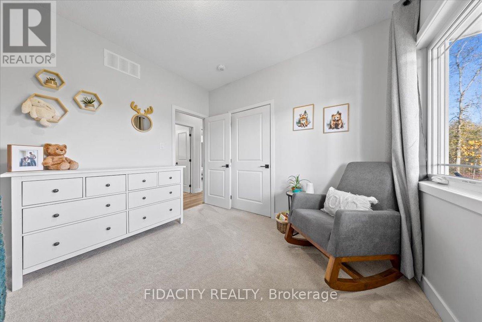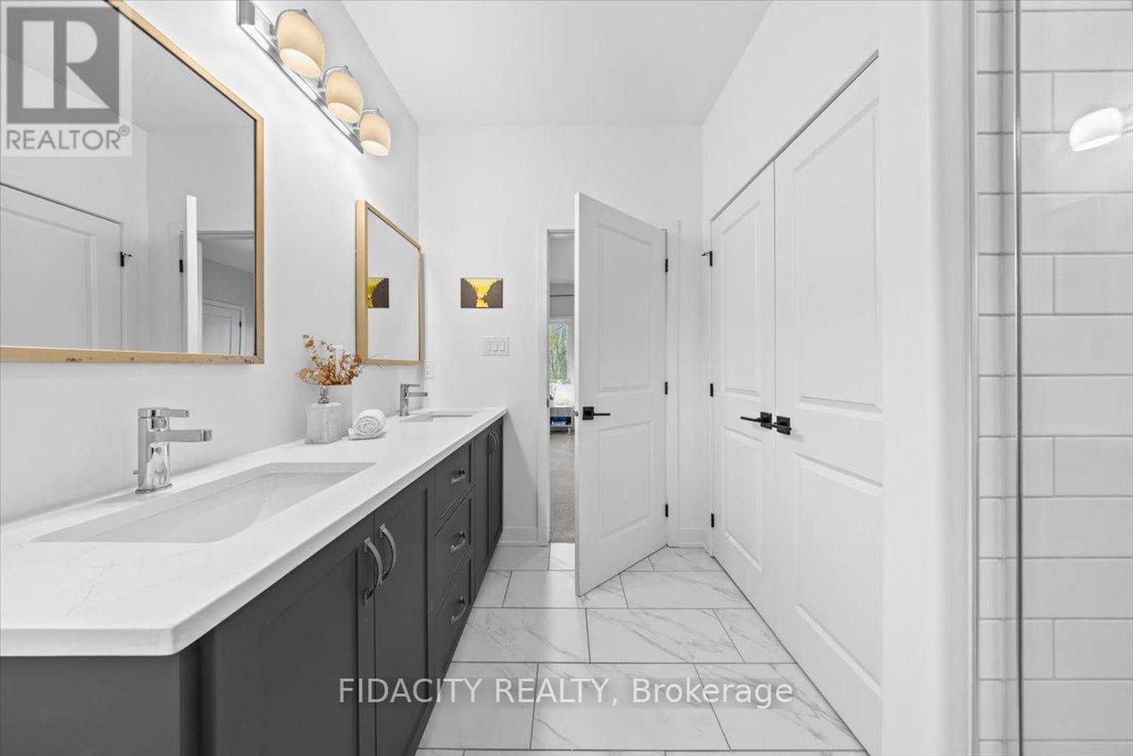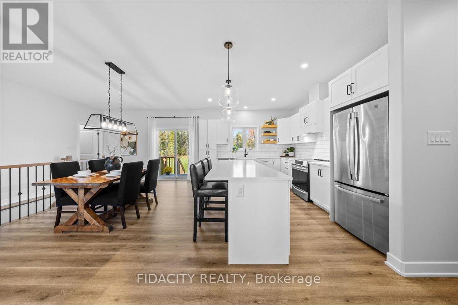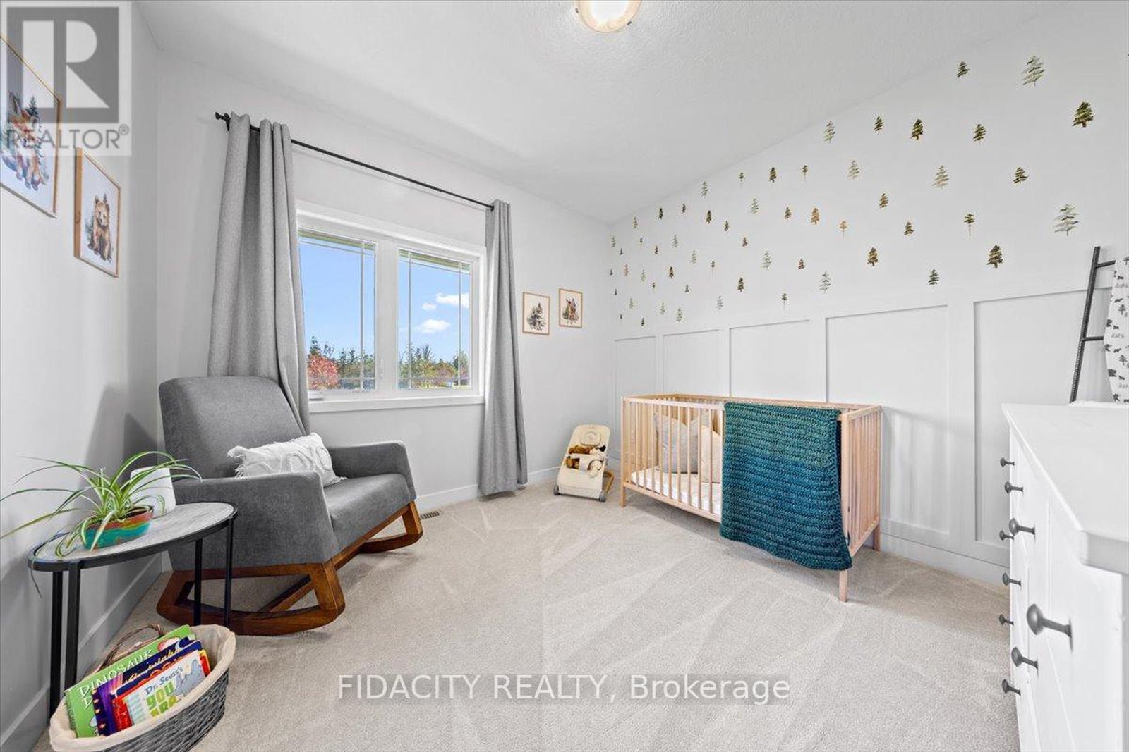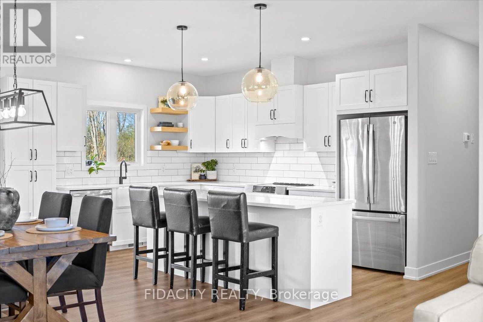 Welcome to 282 Ej's Lane, a stunning 3-bedroom bungalow sitting on 3.7 acres in the highly sought-after Moodie Estates. Nestled on a quiet street with no rear neighbours, this home offers privacy and tranquility with a long driveway leading to a double car garage featuring 11.5 feet ceilings. The main floor boasts 9-foot ceilings throughout and an open-concept layout with a beautifully upgraded chef's kitchen showcasing white cabinetry, quartz countertops, a large island with seating for four, built-in microwave, ample storage, and a farmhouse sink overlooking the picturesque yard. The spacious dining area is perfect for hosting family and friends, while the bright living room features large windows that flood the space with natural light and a cozy gas fireplace with a stone surround and wood mantle. The bedrooms are thoughtfully separated from the main living area, with the primary suite offering space for a king-sized bed, a walk-in closet, and a luxurious 4-piece ensuite with a glass shower, double sinks, and a double-door linen closet. The two additional bedrooms are well-sized with beautiful windows and accent walls. The lower level doubles the sqft and includes a finished office and bathroom rough-in, ready for your finishing touches. A functional mudroom and laundry area provide direct garage access and additional storage. Outside, enjoy a beautifully landscaped yard with a cozy firepit area and full front and back irrigation system to keep your lawn lush all summer long. Additional highlights include a gas BBQ line, Bell Fibe availability, constant pressure system, GenerLink at the meter base, upgraded siding, owned hot water tank and much more! The property's acreage extends into the trees to the right of the property and the neighbour owns the other half. Forest to the back and side lead to walking trails, all just minutes from Carleton Place and a short drive to Ottawa. This is one you don't want to miss!