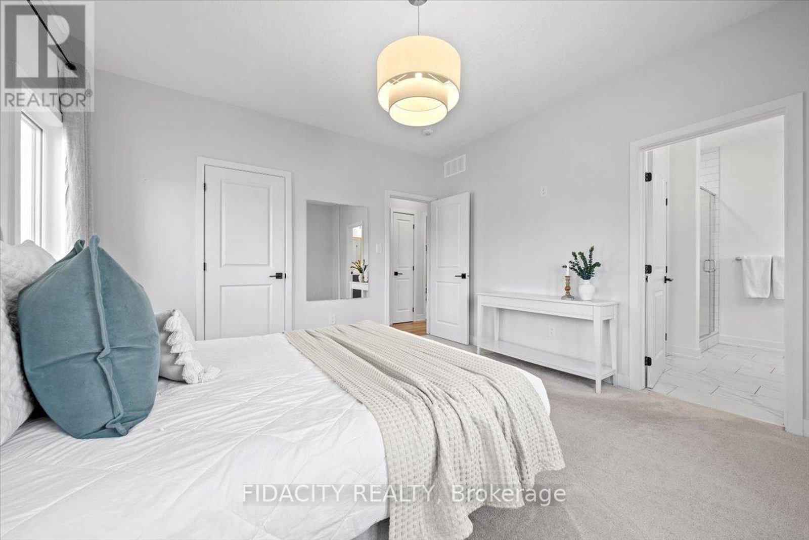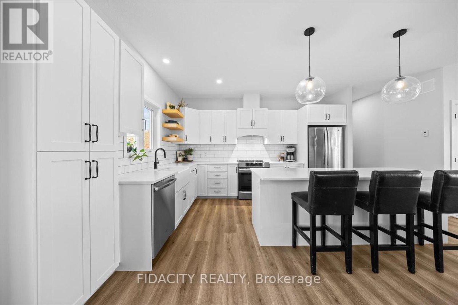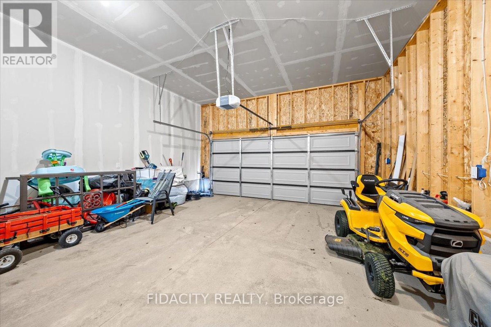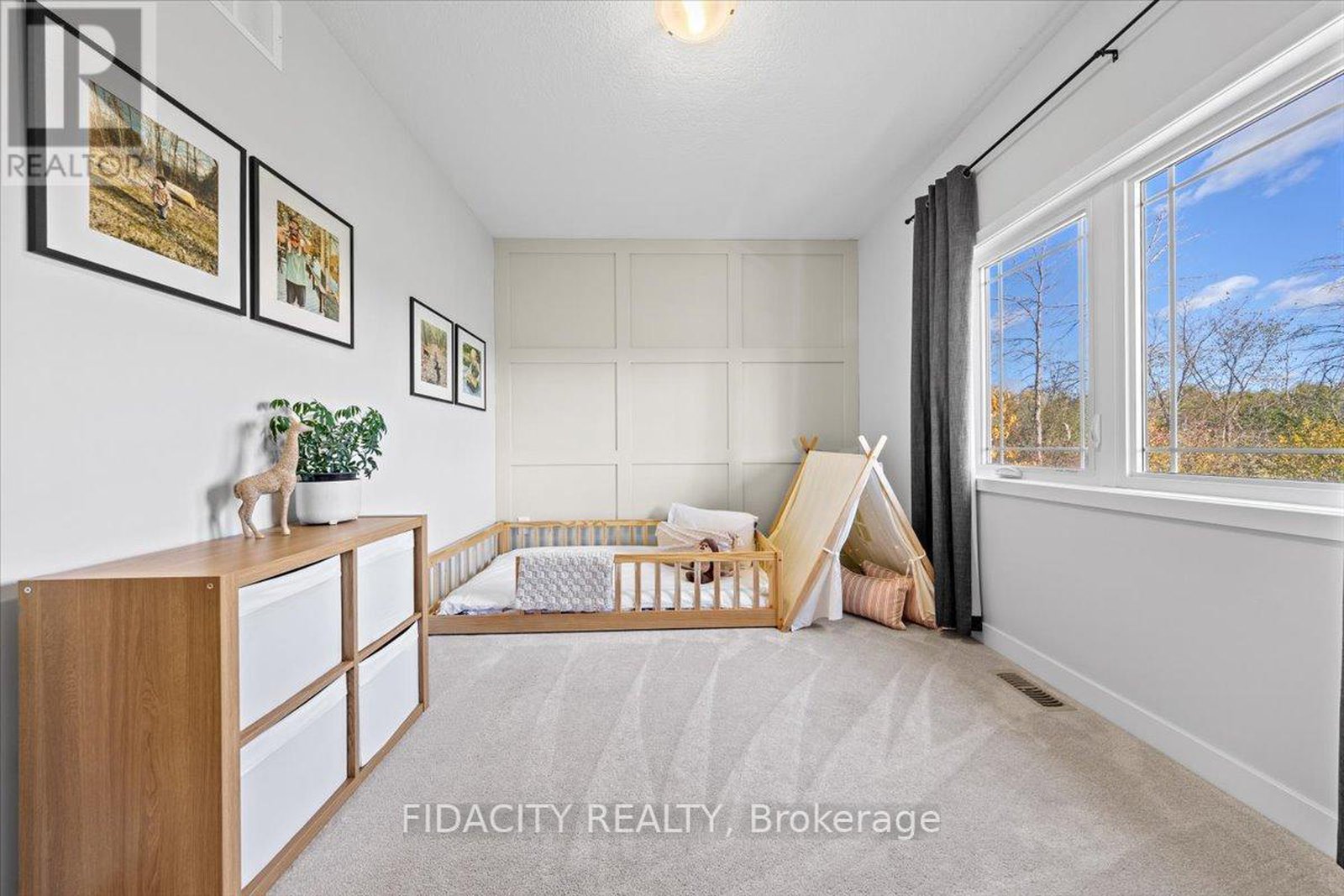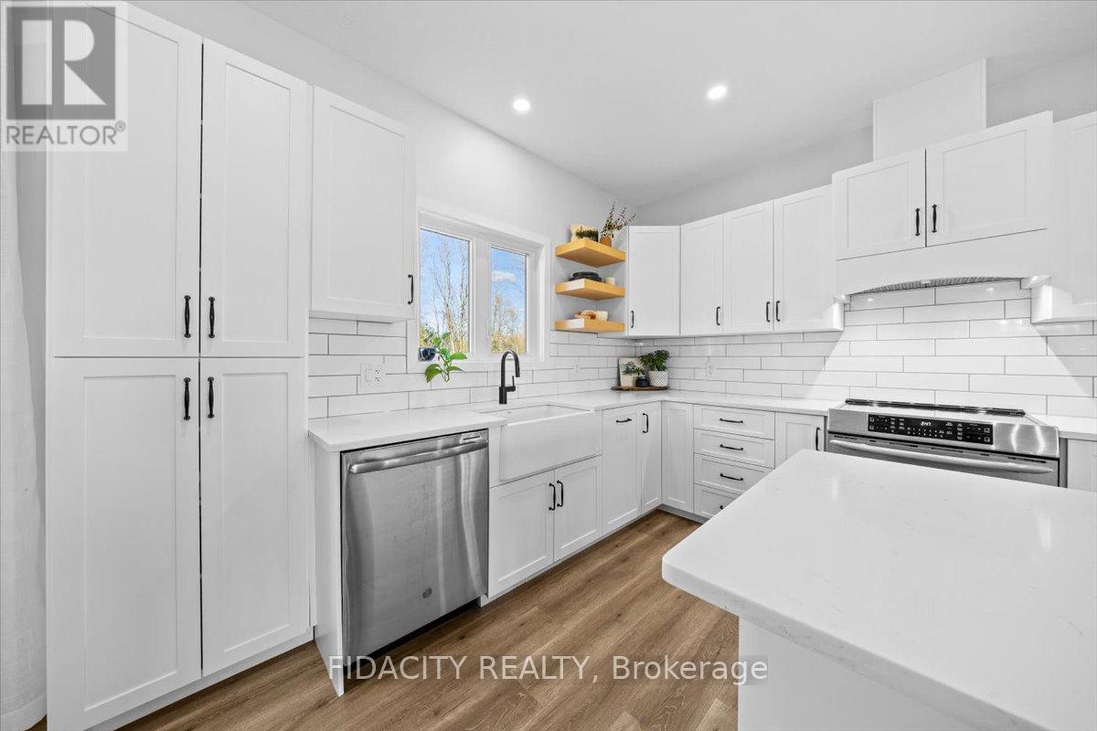 Welcome to 282 Ej's Lane, a stunning 3-bedroom bungalow sitting on 3.7 acres in the highly sought-after Moodie Estates. Nestled on a quiet street with no rear neighbours, this home offers privacy and tranquility with a long driveway leading to a double car garage featuring 11.5 feet ceilings. The main floor boasts 9-foot ceilings throughout and an open-concept layout with a beautifully upgraded chef's kitchen showcasing white cabinetry, quartz countertops, a large island with seating for four, built-in microwave, ample storage, and a farmhouse sink overlooking the picturesque yard. The spacious dining area is perfect for hosting family and friends, while the bright living room features large windows that flood the space with natural light and a cozy gas fireplace with a stone surround and wood mantle. The bedrooms are thoughtfully separated from the main living area, with the primary suite offering space for a king-sized bed, a walk-in closet, and a luxurious 4-piece ensuite with a glass shower, double sinks, and a double-door linen closet. The two additional bedrooms are well-sized with beautiful windows and accent walls. The lower level doubles the sqft and includes a finished office and bathroom rough-in, ready for your finishing touches. A functional mudroom and laundry area provide direct garage access and additional storage. Outside, enjoy a beautifully landscaped yard with a cozy firepit area and full front and back irrigation system to keep your lawn lush all summer long. Additional highlights include a gas BBQ line, Bell Fibe availability, constant pressure system, GenerLink at the meter base, upgraded siding, owned hot water tank and much more! The property's acreage extends into the trees to the right of the property and the neighbour owns the other half. Forest to the back and side lead to walking trails, all just minutes from Carleton Place and a short drive to Ottawa. This is one you don't want to miss!