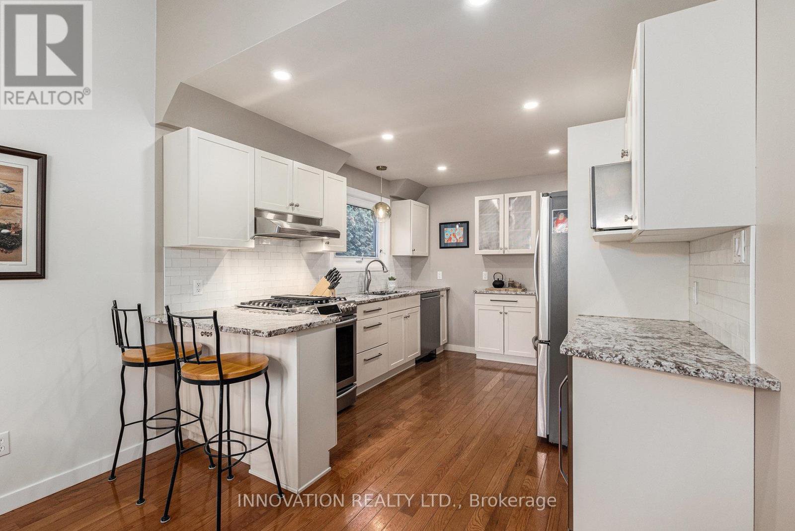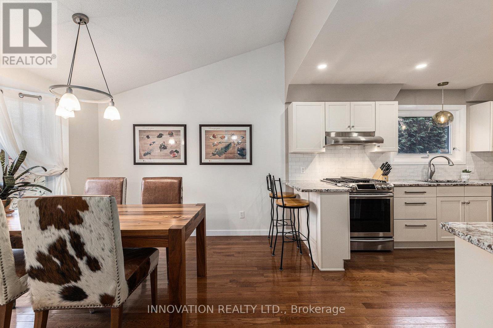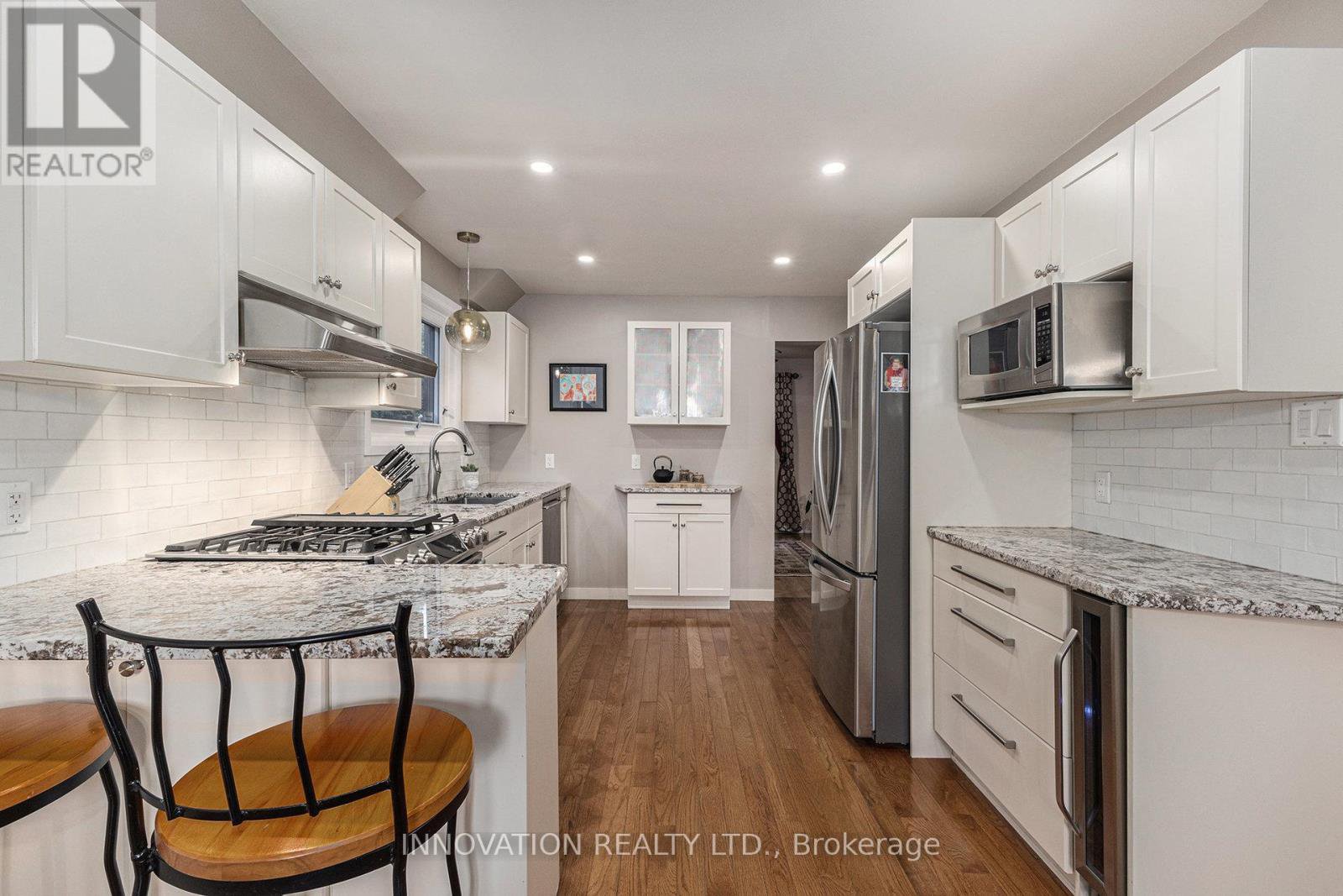 Welcome to this beautifully updated detached two-storey home located on a quiet crescent within a five minute walking distance from two elementary schools and a high school - the perfect setting for families! Enjoy the ultimate in convenience with quick access to Highway 417, Terry Fox Drive, and the abundance of nearby shopping, restaurants, parks, Kanata Leisure Centre and Wave Pool and the Canadian Tire Centre - all just minutes away. Inside, you'll find a warm and inviting layout featuring 3 spacious bedrooms, 3 baths, and hardwood floors throughout (2021). The cozy wood-burning fireplace anchors the living room, enhanced by Lutron remote lighting in key rooms for comfort and style. The heart of the home is the modern, fully remodeled kitchen (2020), showcasing granite countertops, tile backsplash, stainless steel appliances including a gas stove, wine fridge, Bosch dishwasher, and LG refrigerator - perfect for cooking and entertaining. The adjacent dining area opens to a covered back deck overlooking a private, fully fenced yard (new in 2023) with perennial gardens and two apple trees, creating a tranquil outdoor retreat. Other notable updates and features include: new front deck (2023), roof (2017), attic insulation upgrade (2019), furnace (2017), driveway paved (2024) and professionally sealed (2025), natural gas Napoleon BBQ hookup, high-speed fibre high-speed internet, Electrolux washer & dryer (2019). This home also offers a partially finished basement, attached garage, parking for 3-4 vehicles and combines modern upgrades with everyday practicality in one of the most convenient and family-friendly locations in the city. Don't miss your opportunity - book your showing today!