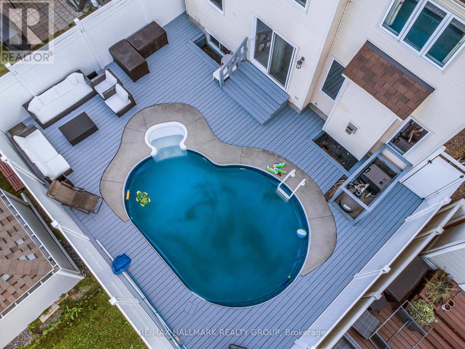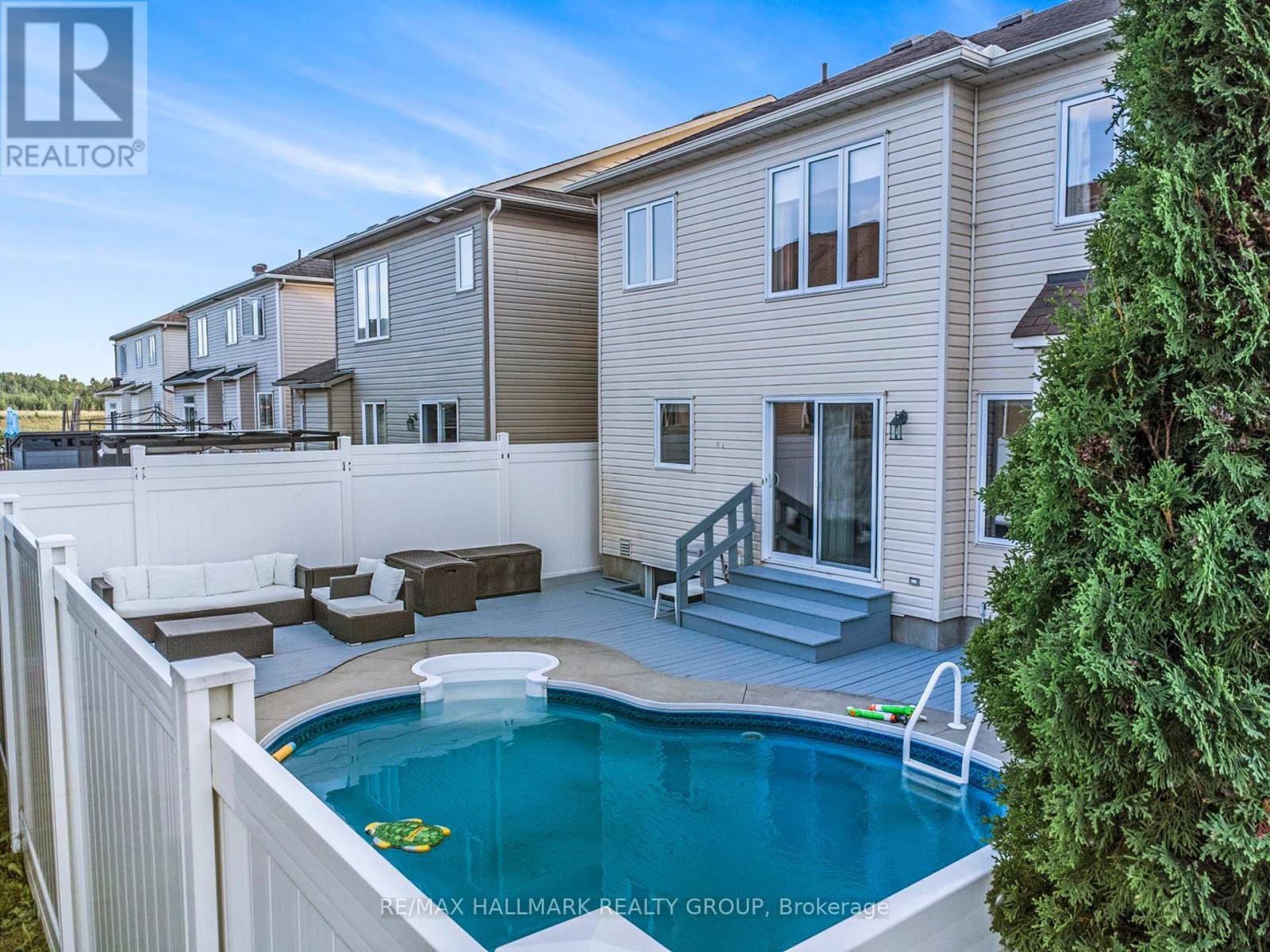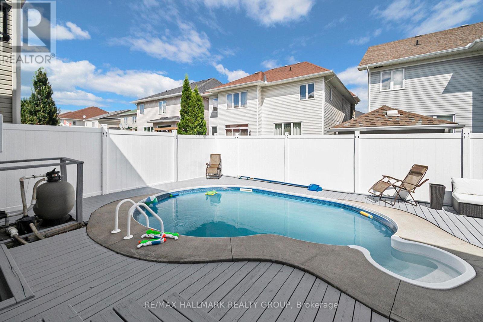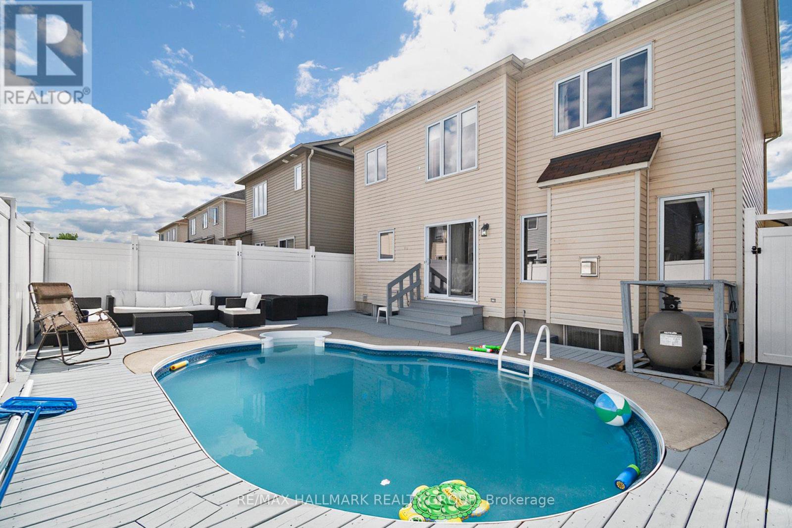 Welcome to 470 Frank Cauley, perfectly situated on one of the most peaceful and sought-after streets in Orleans. This stunning detached home offers 3 spacious bedrooms, 4 bath and a family living with countless upgrades inside and an incredible backyard oasis outside.Step inside to a bright and spacious main level featuring rich hardwood and ceramic flooring. The living room will take your breath away with its soaring vaulted ceiling and oversized arched window, flooding the space with natural light. The inviting family room, complete with a cozy gas fireplace and warm wood mantle, creates the perfect gathering space for relaxing evenings or entertaining. The open-concept kitchen offers granite countertops, stainless steel appliances, a convenient pantry, and an eating area with direct access to the backyard. Main-level laundry adds everyday convenience.Upstairs, the primary retreat includes a sitting area/study nook, a large walk-in closet, and a spa-inspired 4-piece ensuite with separate shower and soaker tub. Two additional bedrooms and a full bathroom complete the second level, designed for comfort and privacy.The fully finished lower level (2019) provides an expansive recreation space, a 3-piece bathroom, and plenty of storage ideal for a home office, gym, or media room.Your private backyard beach oasis is the true showstopper featuring a heated inground saltwater pool, sun-drenched patio, and a large entertaining deck. Whether its hosting summer barbecues or enjoying peaceful evenings by the pool, this backyard delivers the ultimate retreat..A double-wide driveway ensures parking comfort.Located close to schools, parks, trails, shopping, and transit, this move-in-ready home offers the perfect mix of lifestyle, location, and luxury. Recent updates include: full home repaint (2025), garage repaint (2025), driveway resealed (Aug 2025) Truly one of Orleans hidden gems!