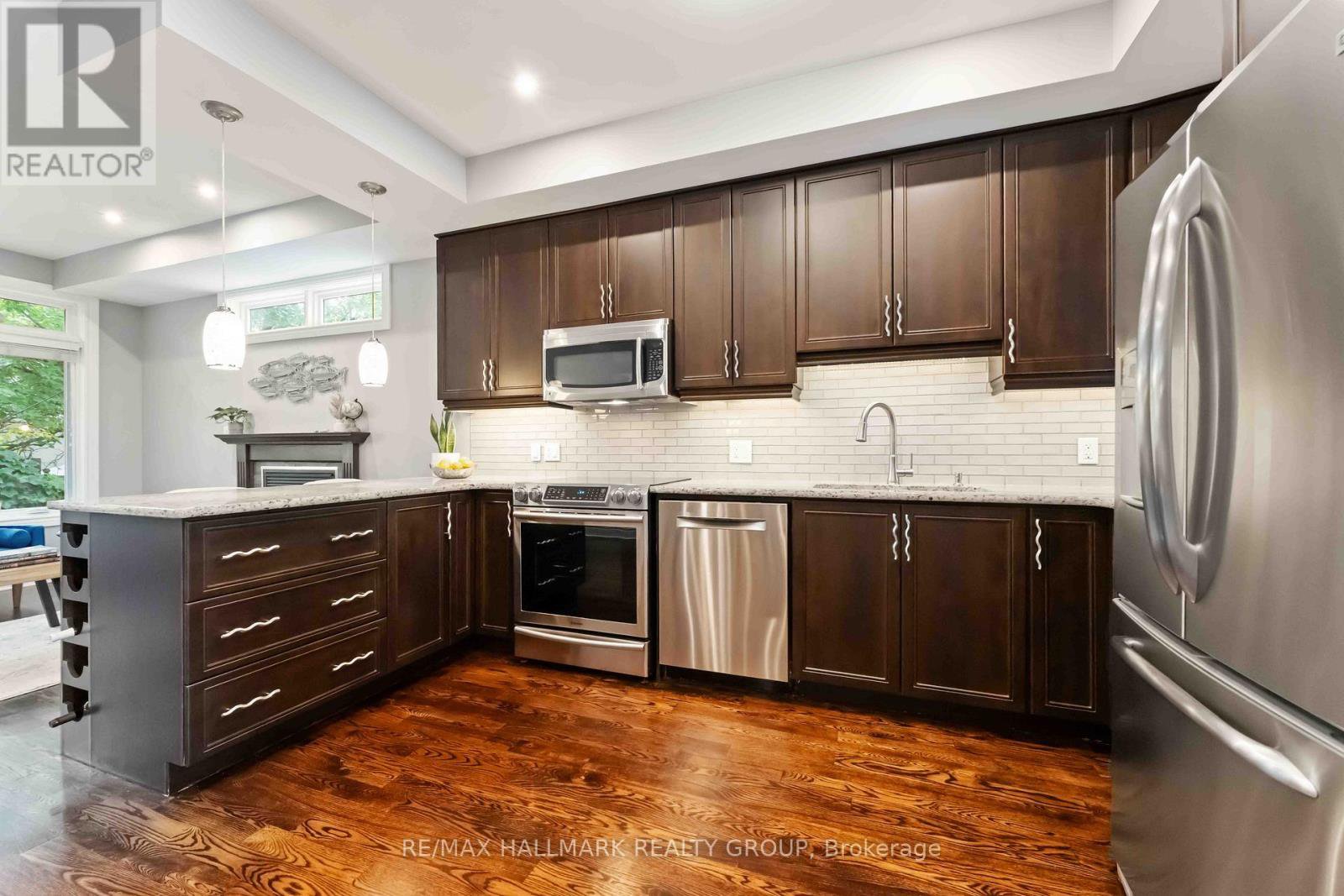 OPEN HOUSE, Sunday, October 26th, 2-4 p.m. Award-Winning Hamel Designed Semi-Detached. This stunning sun filled 3-storey semi-detached blends modern design with urban convenience, just 10 minutes to downtown and an 8-minute walk to Tremblay LRT/VIA Rail. The open-concept main level with hardwood floors features 9' ceilings, a chef's kitchen with granite counters, undermount sink and breakfast bar. Kitchen opens to the living room with gas fireplace and door to the private back yard. The second floor offers a master-sized 2nd bedroom, 3rd bedroom, a full bath plus a bright den/workout room with balcony and view. The top level features a luxurious primary suite, spa-inspired ensuite, and a covered patio retreat. The versatile lower level includes a family room (or 4th bedroom), full bath, and bar ideal for entertaining or future apartment conversion. Unbeatable location: steps to the Overbrook Community Center (programs, Sens Rink of Dreams, sports fields, dog park), minutes to shopping and the Rideau Sports Centre. Only 2 blocks to the Rideau River trails and a 20-minute walk to the University of Ottawa. An urban lifestyle gem by an award-winning designer.