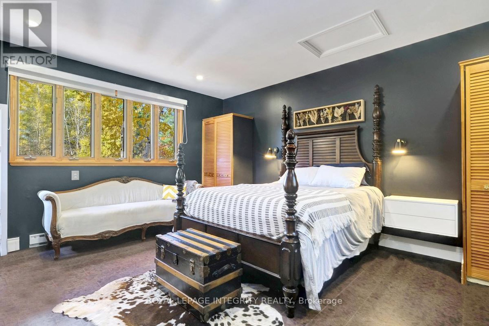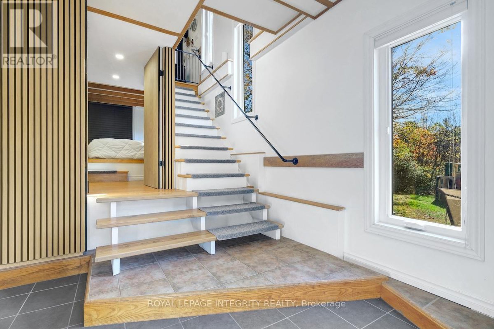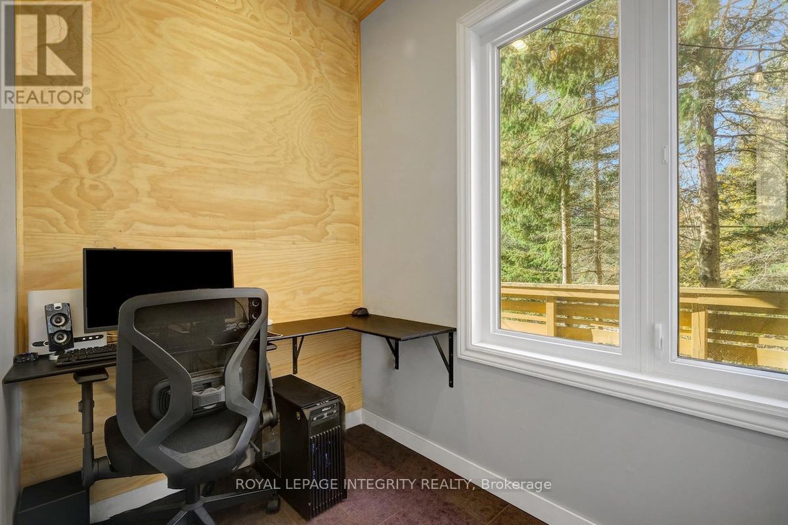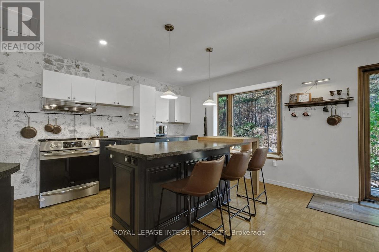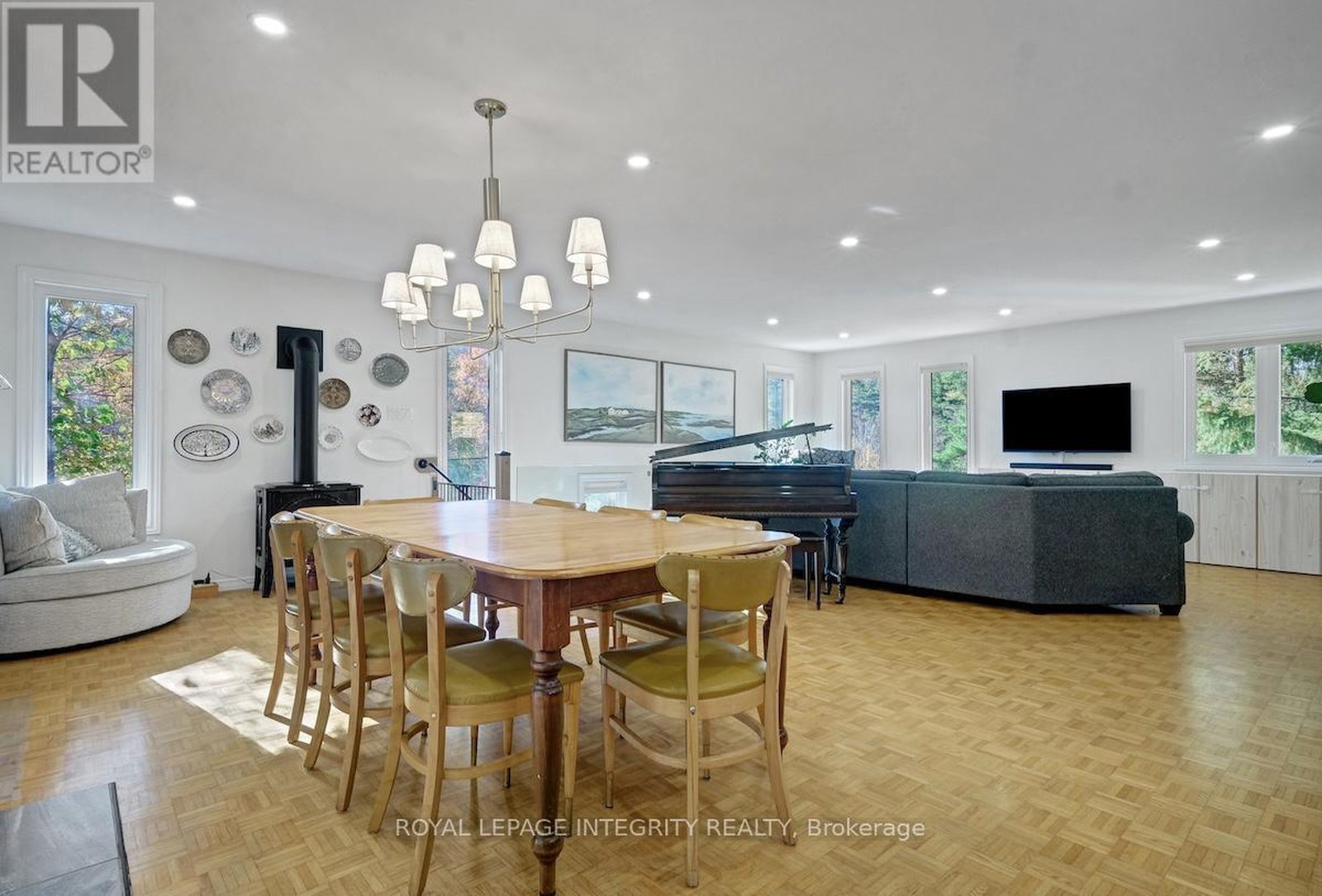 Tucked into the natural landscape of the Canadian Shield, this one-of-a-kind home offers the perfect balance of peace, privacy, and proximity to recreation. Nestled on a 1.24-acre double lot beside Mount Pakenham, this 3-bedroom, 1.5-bath home feels like a modern ski-lodge retreat. Surrounded by mature pines, boulders, and trails leading to a cozy fire pit, it offers serenity in every season - just 30 minutes from Ottawa. The open-concept main living area on the second level showcases the surrounding landscape, with large windows framing treetop views. The bright kitchen features newer stainless steel appliances (2023), and the adjoining dining area with a fireplace (propane) sets the tone for family meals and gatherings. This level also includes a full bathroom. The main level offers a welcoming foyer, three bedrooms, a powder room, laundry room, and a versatile layout-with the newest bedroom addition (2025) enhancing the home's functionality and charm. The newly completed office (2024) is fully insulated and soundproofed-ideal for remote work-with a large window bringing in natural light. Updates include pot lights throughout (2021-2025), a custom tile shower (2023), pine ceiling and bulkheads in the second bedroom (2023), and more. The primary bedroom, part of a thoughtful addition, offers a quiet retreat with expansive windows and peaceful forest views-an inviting space that reflects the home's tranquil character. Enjoy decks on both sides to follow the sun, a 20' x 12' workshop/shed, ample parking, and fibre optic internet to keep you connected. Minutes to Pakenham village, shops, golf, schools, and the Ottawa Valley Rail Trail - this is country living at its most connected and serene.
