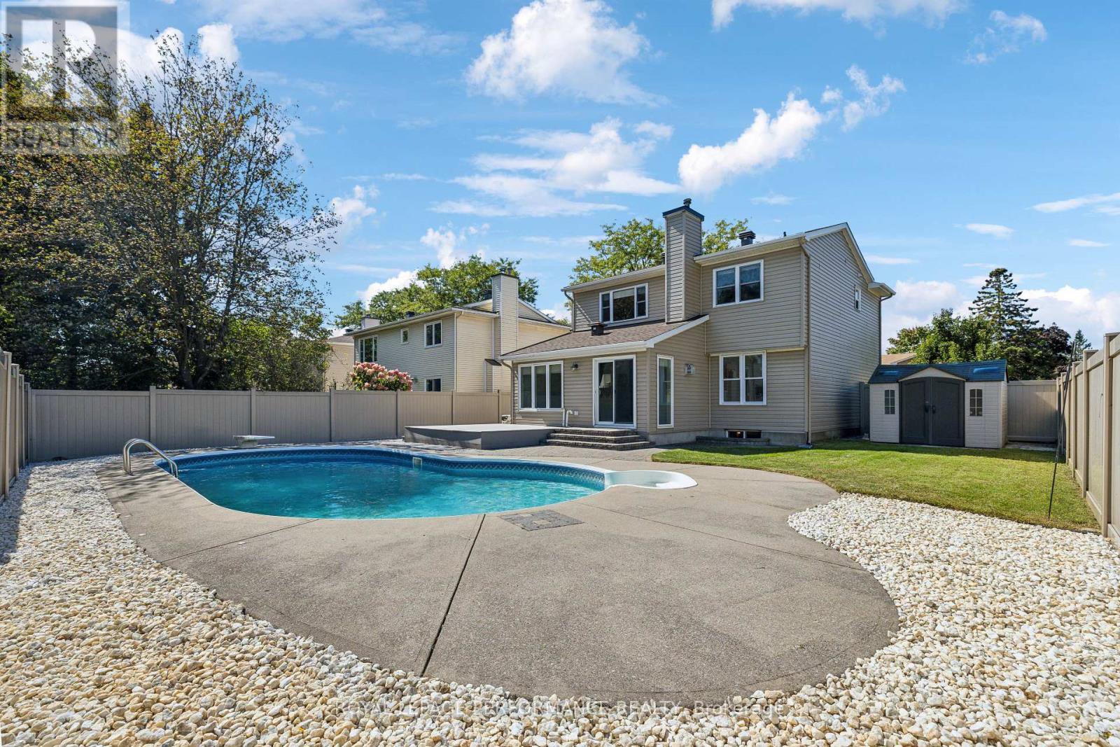 This beautifully maintained corner-lot home in Chapel Hill offers incredible curb appeal, modern upgrades, & a private backyard oasis with an in-ground pool. The bright foyer leads to a spacious living & dining area with resurfaced hardwood floors & oversized windows. The fully renovated kitchen features granite countertops, stainless steel appliances, & a tumbled marble backsplash. A sunken family room boasts vaulted ceilings, a gas fireplace, & stunning backyard views. The primary suite offers ample closet space & an updated ensuite, while two additional bedrooms include new hardwood floors & a stylish 4-piece bath. The finished basement features a large rec room with an electric fireplace, a fourth bedroom, & a powder room. Outside, enjoy a composite deck, a professionally landscaped backyard with white river stone surrounding the pool, & a new stone pathway. Recent upgrades since 2022 include attic insulation, a full kitchen renovation, new hardwood in two bedrooms, a modern staircase, & an insulated garage. The backyard was redesigned with white river stone to reduce grass near the pool. Additional renovations since 2009 include interlock landscaping, a repaved driveway, PVC fencing, & pool updates such as a new pump (2024), liner (2011), filter, & safety cover. The roof was replaced in 2018, along with new siding, front & side doors. Main, ensuite, & powder room bathrooms were updated, & bay, family room, & basement windows were replaced. The furnace, air conditioner, gas fireplace, & electric fireplace were also upgraded. Popcorn ceilings were removed on the main floor, & the basement was recently renovated. Located in the desirable Chapel Hill community, this home is near top-rated schools like Forest Valley Elementary & Chapel Hill Catholic School. Enjoy nearby parks, trails, & Racette Park, with easy access to transit, shopping, & Highway 174. Dont miss this dream home book your showing today!