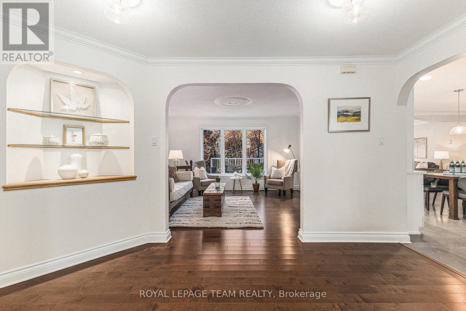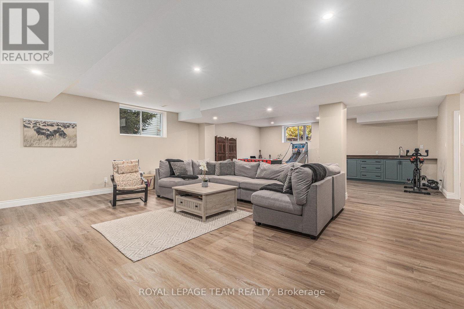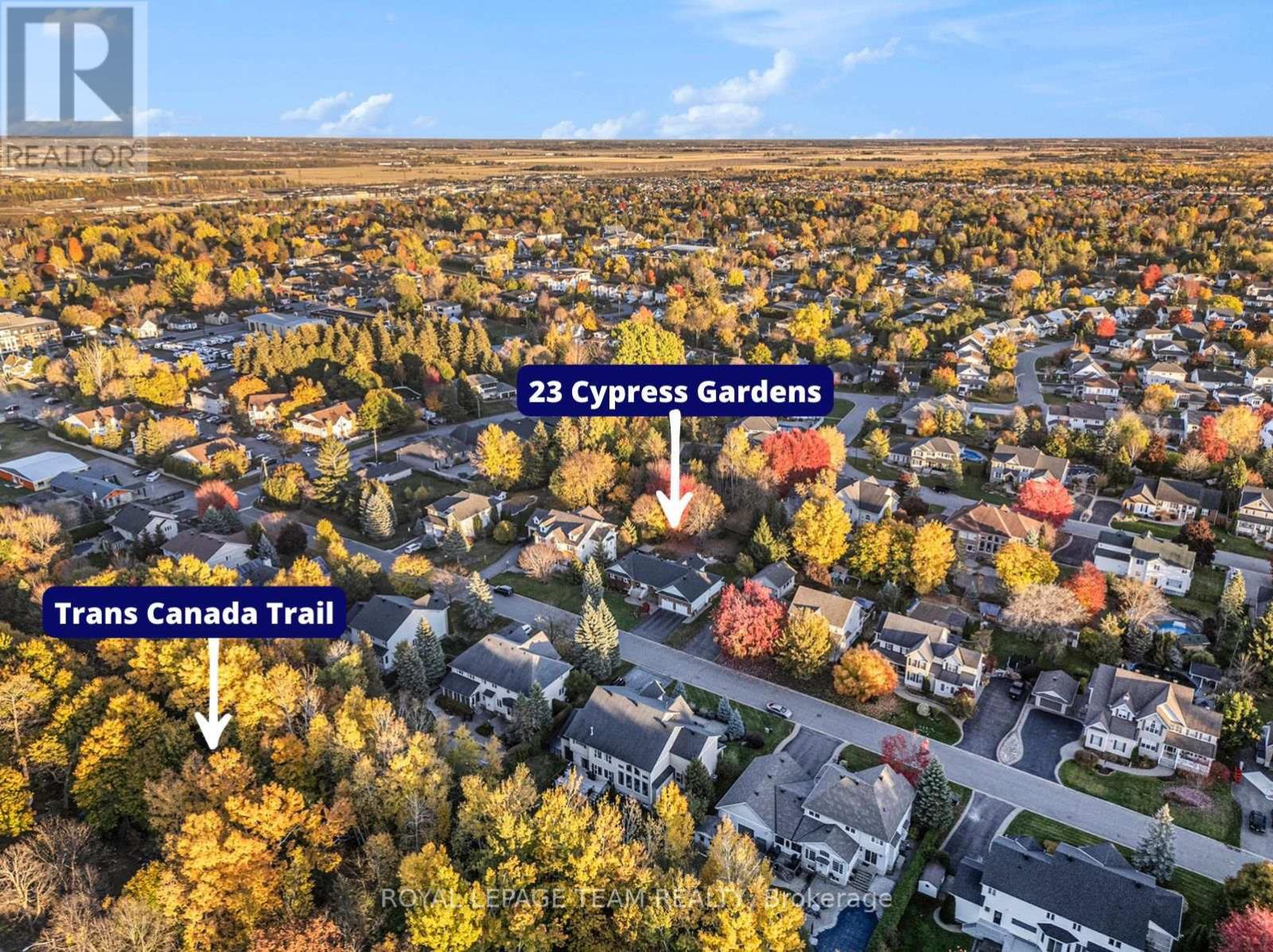 OPEN HOUSE SUNDAY NOV 2, 2 - 4 PM. Welcome to 23 Cypress Gardens - a spacious and tastefully updated bungalow in the heart of Stittsville, offering around 4,400 sqft of living space across two levels. Set on one of the community's most sought-after streets, where the lots are deep, the days are peaceful, and the Trans Canada Trail is just steps away, and close to all the coffee shops, parks, schools, and amenities that make Stittsville such a welcoming place to live. Inside, a bright foyer opens to an inviting main floor, where on the left you'll find three generously sized bedrooms tucked away in their own private wing, including a primary suite with walk-in closet and ensuite bath featuring a walk-in shower. To the right of the grand foyer, a large dining room and sitting room lead to the heart of the home - a stunning open-concept family room and custom kitchen area with extended island, built-in double oven, and premium appliances. From here, you'll find a spacious mudroom connecting to the oversized two-car garage and the lower level. The fully finished basement with 8"5' ceilings is spacious and very bright, including a large bedroom, a den, two storage rooms, and an expansive family room with wet bar and electric fireplace - the large sectional sofa here is included in the sale! There is a backdoor entrance that offers excellent potential for a nanny or in-law suite. Step outside to your private backyard retreat - 170 ft deep at its longest point - featuring a deck, two newer patios and pergola, and a perennial garden. The whole front and backyard are watered through a built-in irrigation system. Come see this beautiful home for yourself & fall in love!