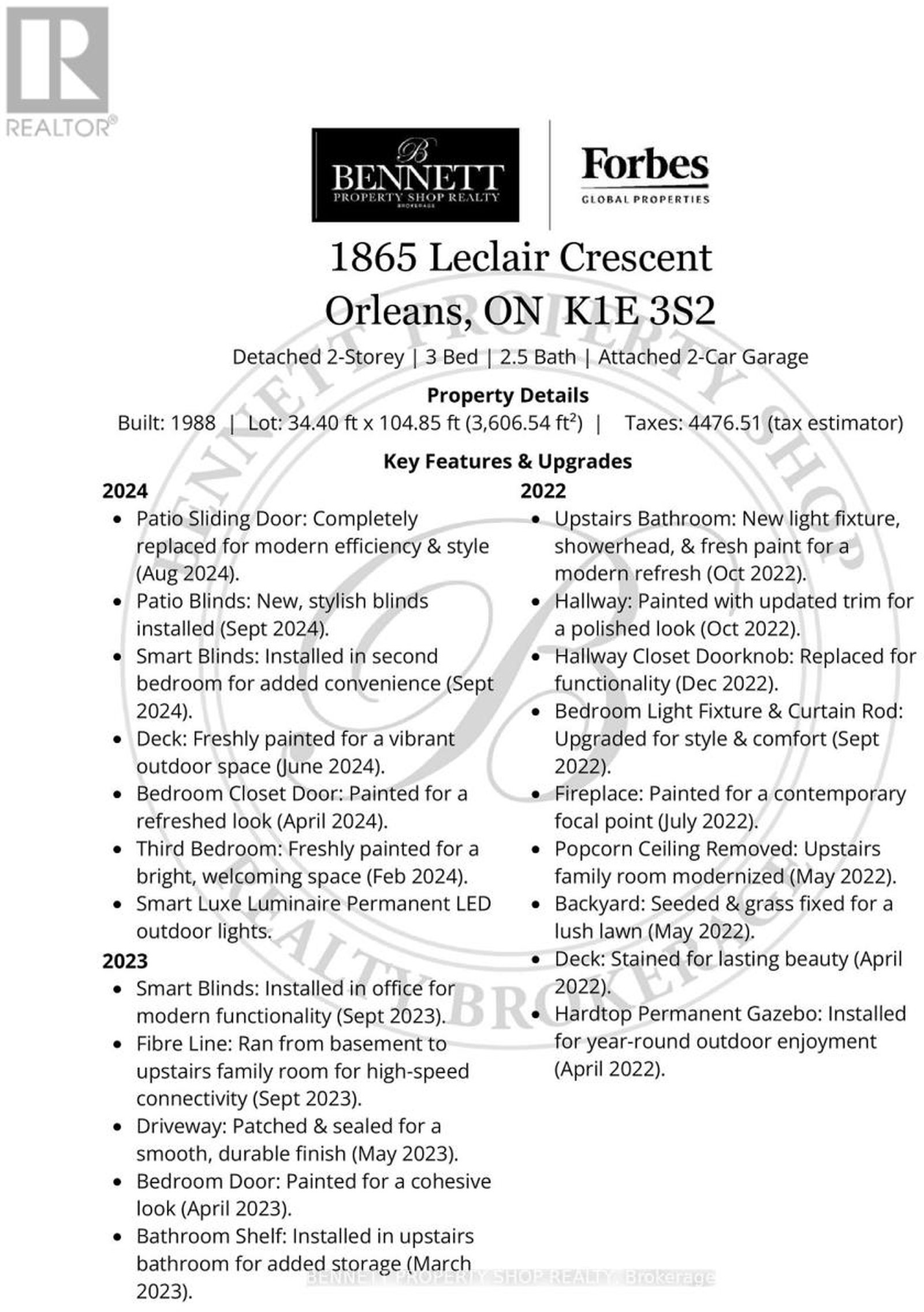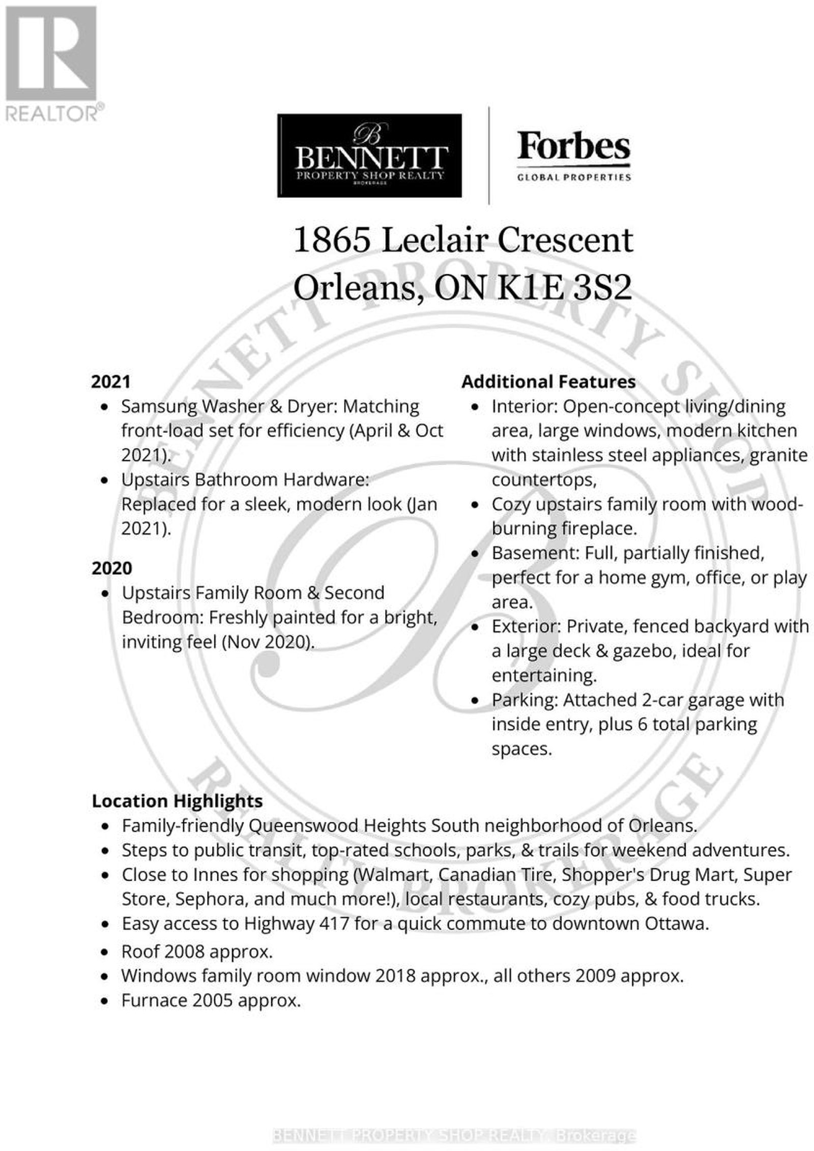 A must see! This awesome 3-bedroom, 2.5-bathroom detached home is right in the heart of Orleans! Step through the front door and you're greeted by a bright and spacious foyer. From there, the space opens up into an airy living and dining area that flows right into a killer kitchen. We're talking stainless steel appliances, granite counters, and tons of room to cook, chat, or toss together a charcuterie board for game night. Big windows flood the home with sunlight, making it feel open and oh-so-inviting. There's also a handy half-bath nearby for when friends pop over. Head up the curved staircase to a cozy family room with a wood-burning fireplace - perfect for kicking back with a movie or warming up on a chilly evening. Up a few more steps and you'll find three roomy bedrooms, each with that same sunny vibe. The primary bedroom is your personal retreat, complete with a walk-in closet and a sweet ensuite. Another full bathroom keeps the morning chaos in check. The partially finished basement is a blank canvas- think home gym, office, movie den, or a spot for the kids to go wild. Out back, the private yard with a large deck and new hardtop gazebo is your go-to for summer BBQs, morning coffee, or just chilling under the stars. Orleans has it all-this home is perfectly situated amid lush green space, yet just minutes from transit, top-rated schools, Innes' unparalleled amenities, awesome parks, and scenic trails for weekend adventures. Craving a night out? Hit up local restaurants, cozy pubs, or hunt down the best food trucks in town. This isn't just a house-it's where your family's memories will shine and your life will thrive! Some photos are digitally enhanced. 24 hours irrevocable on all offers.