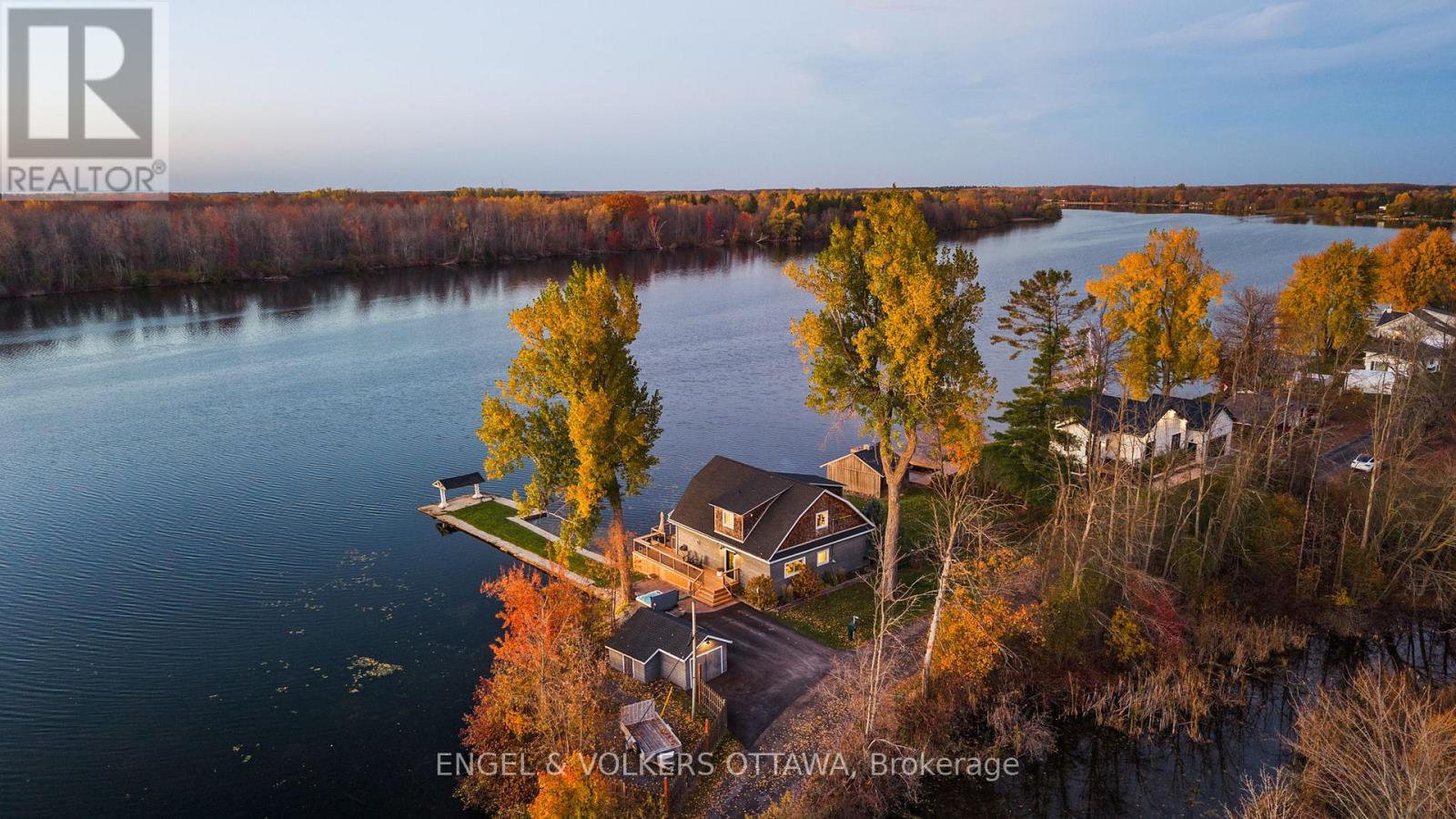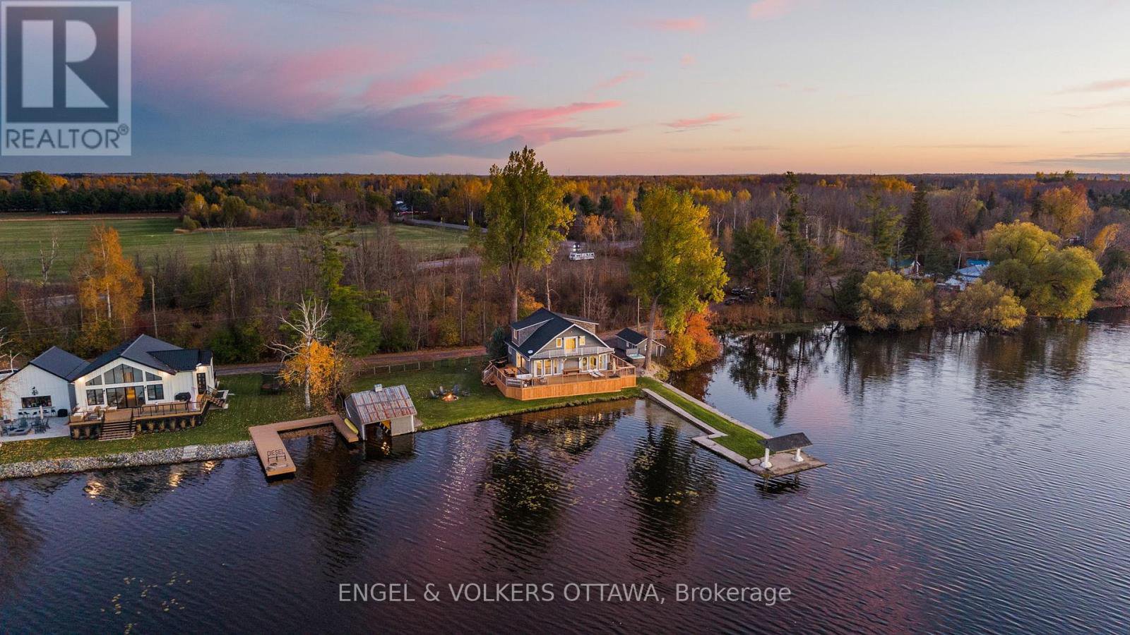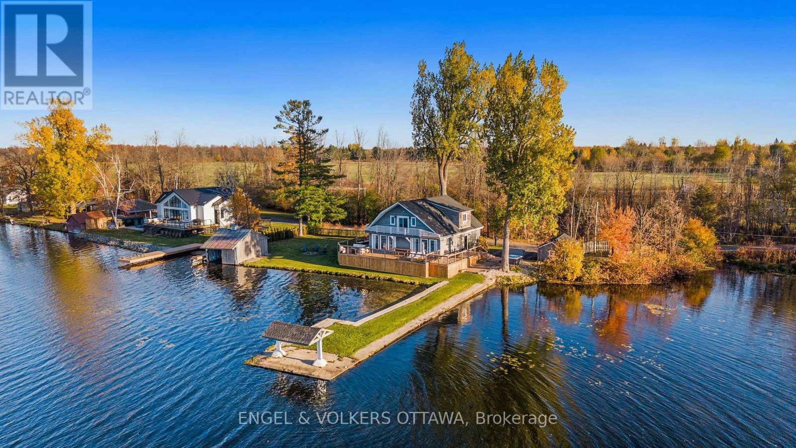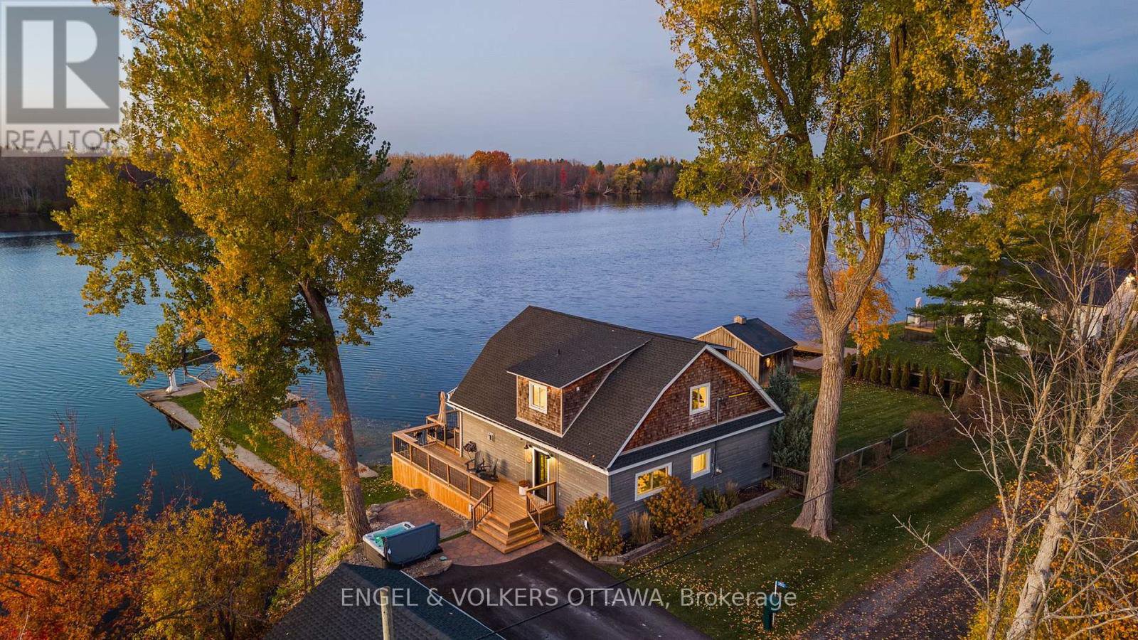 The Pier House - designer waterfront living on the Rideau River. This 4-bedroom retreat offers nearly 200 ft of pristine shoreline along the Long Reach, 30km of lock-free boating, with sunset views across the water toward Baxter Conservation Area. Elevated by luxury finishes and extensive updates, the home features a striking great room with floor-to-ceiling windows, custom built-ins, and a modern fireplace. The kitchen blends walnut butcherblock counters and a quartz island for a warm, modern aesthetic. A major renovation in 2022 introduced engineered hardwood throughout, new trim, doors, and a fully redesigned primary suite with spa-inspired ensuite and walk-in closet. Roof(2024), decking(2025), and front door(2024) all recently replaced; new hot tub (2025) with warranty. Updated electrical and advanced RO + UV water purification systems ensure turnkey peace of mind. The home's expansive wrap-around deck provides the ultimate outdoor living experience, thoughtfully designed with multiple zones for relaxing and entertaining - from casual lounging and dining areas to a dedicated BBQ space. A built-in wood bar with high stools adds a resort-like touch, perfect for enjoying evening drinks overlooking the water. Easy boating with a private boathouse, and in winter, enjoy skating, cross-country skiing, and snowmobiling right from your shoreline. Conveniently located with quick access to Highway 416 - just 30 minutes to downtown Ottawa, 15 minutes to Manotick, and 10 minutes to Kemptville.