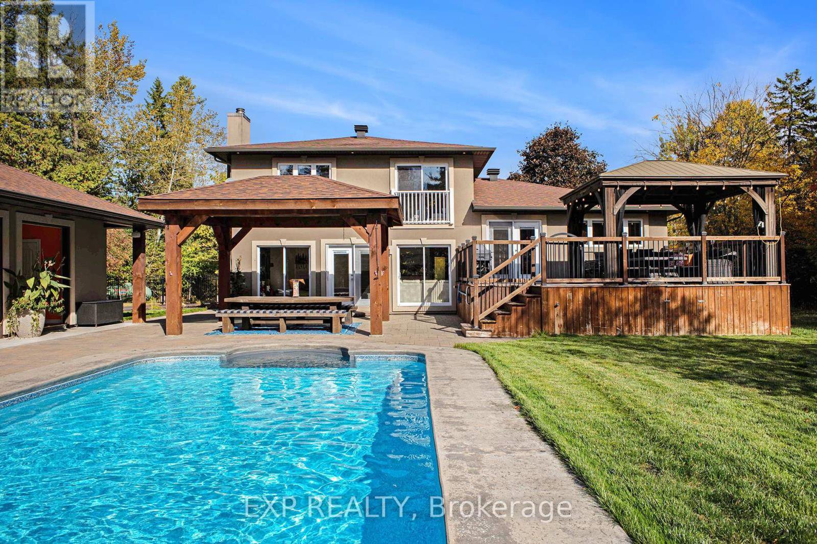 **OPEN HOUSE SUNDAY NOV 9TH 2PM-4PM.** Step Into A World Where Luxury, Privacy, & Nature Unite In Perfect Harmony! Tucked Away In A Prestigious Golf Course Community, This Exceptional Estate Rests On Nearly Six Acres Of Rolling Greenery & Towering Trees, Creating A Setting Unlike Any Other. As You Arrive, The Tranquility Of The Property Is Instantly Apparent. Step Through The Front Door Into A Spacious Foyer That Opens To Sun-Filled Living Areas Adorned With Hardwood Floors & Expansive Windows Framing Picturesque Views. The Inviting Living Room Centers Around A Striking Wood-Burning Fireplace, Adding Warmth & Character To Every Gathering. The Heart Of The Home Is A Chef-Inspired Kitchen Designed For Beauty & Function, With Solid Wood Cabinetry, Granite Counters, 7 Premium Stainless Steel Appliances, Including Double Ovens & An Oversized Fridge. A Generous Island & Adjacent Dining Area Make Entertaining Effortless, Flowing Seamlessly Toward The Backyard Paradise. Upstairs, The Primary Suite Offers A Peaceful Escape With A Juliette Balcony & Spa-Inspired Ensuite. Each Additional Bedroom Features Its Own Ensuite, Ensuring Comfort & Privacy For Family & Guests. The Fully Finished Basement Extends The Living Space With Areas For Recreation, Fitness, Or Movie Nights. Step Outside & Discover The True Highlight Of This Estate-A Resort-Style Backyard. A Saltwater Pool Is Surrounded By Lush Landscaping, Expansive Interlock, & A Timber-Framed Pool House With Wet Bar, Sitting Area, Outdoor Shower & Change Room. Gather Around The Built-In Fire Pit Beneath The Stars, Explore Private Trails, Or Simply Relax In Your Outdoor Sanctuary. With A New Furnace, Irrigation System, Heated Garage W/Epoxy Flooring, Secondary Laneway, & Two Wells-The Second Dedicated To Front & Back Irrigation-Every Detail Has Been Thoughtfully Designed. This Property Perfectly Blends Sophistication, Comfort, & Natural Beauty-A Rare Chance To Truly Have It All. Schedule Your Showing Today. Don't Miss This GEM!