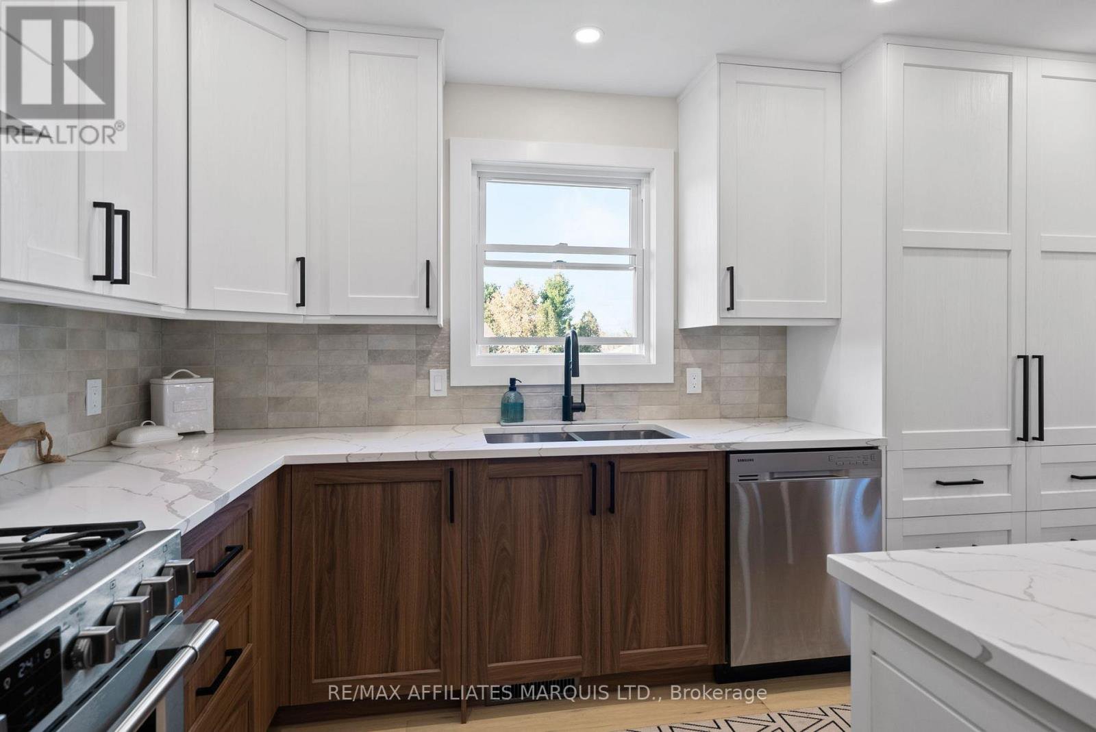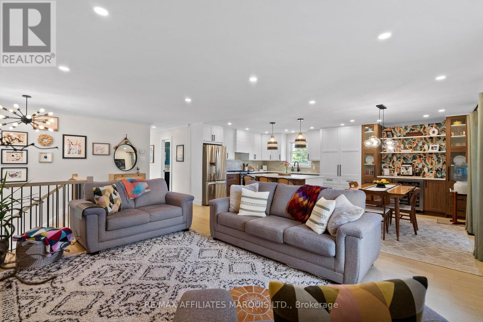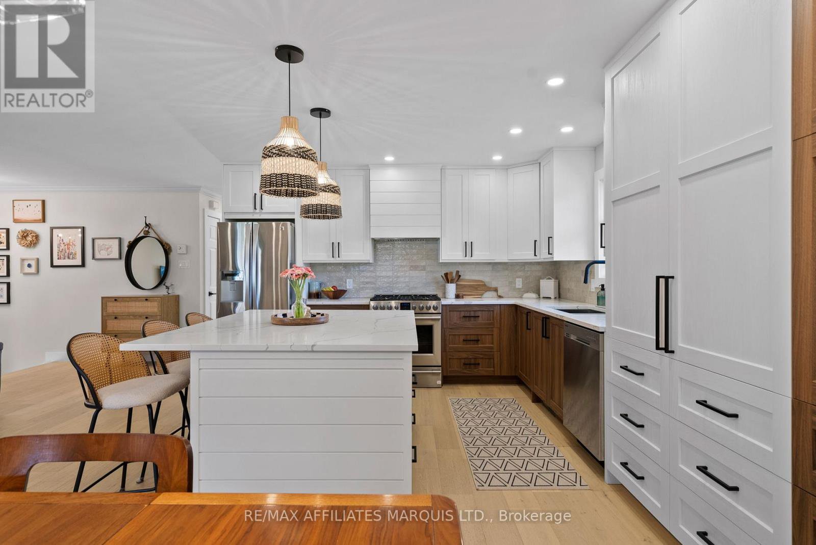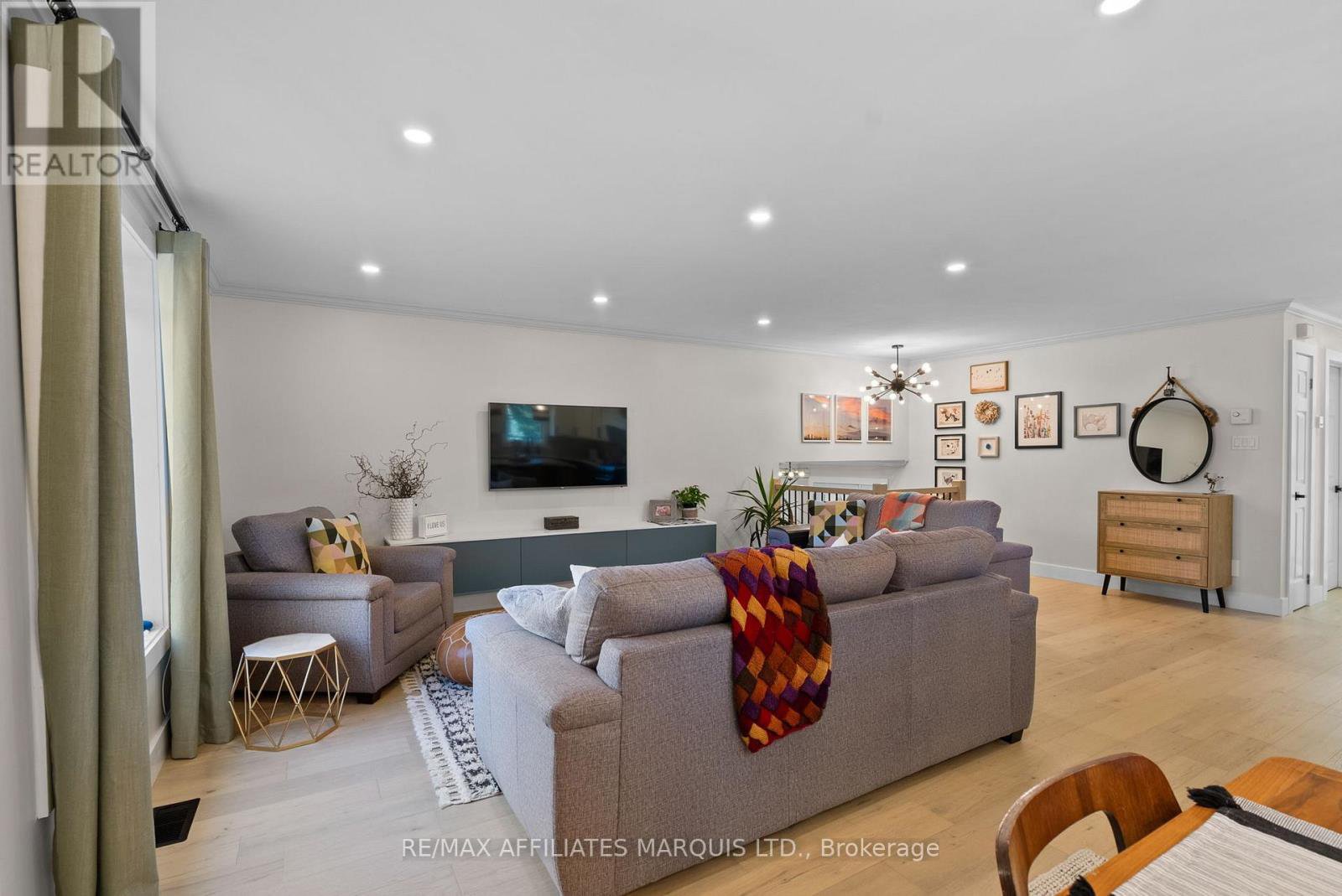 Welcome to this stylish and personality-filled 3+2 bedroom, 2 bathroom home offering approximately 1400 square feet of beautifully finished main floor living space plus a fully finished basement. From the moment you step inside, you'll notice the light-toned hardwood flooring that flows seamlessly throughout the main level, creating an inviting and airy feel. The recently renovated custom kitchen is truly a showpiece, featuring a large island with extra storage, quartz countertops, a stunning glass tile backsplash, boho lighting and thoughtfully designed cabinetry with modern conveniences. The open-concept layout connects the kitchen to both the living room and the bright three-season sunroom, perfect for morning coffee or quiet evenings overlooking the backyard. The dining area exudes modern charm, complete with a striking feature wall and space for a cozy coffee bar setup. Each of the three main-floor bedrooms is generously sized and tastefully decorated with accent walls that add warmth and character. The main bathroom is a spa-like retreat, offering a freestanding soaker tub and a walk-in glass shower. Downstairs, the fully finished basement extends your living space with a spacious rec room featuring a gas fireplace - ideal for movie nights or family gatherings - along with two additional bedrooms and an updated second bathroom. Outside, enjoy the large backyard with a hot tub, fire pit, and plenty of space for entertaining or relaxing under the stars. The attached double garage adds convenience, and the home is located in an excellent family-oriented neighborhood just minutes from Cornwall - the perfect blend of modern comfort and small-town charm.