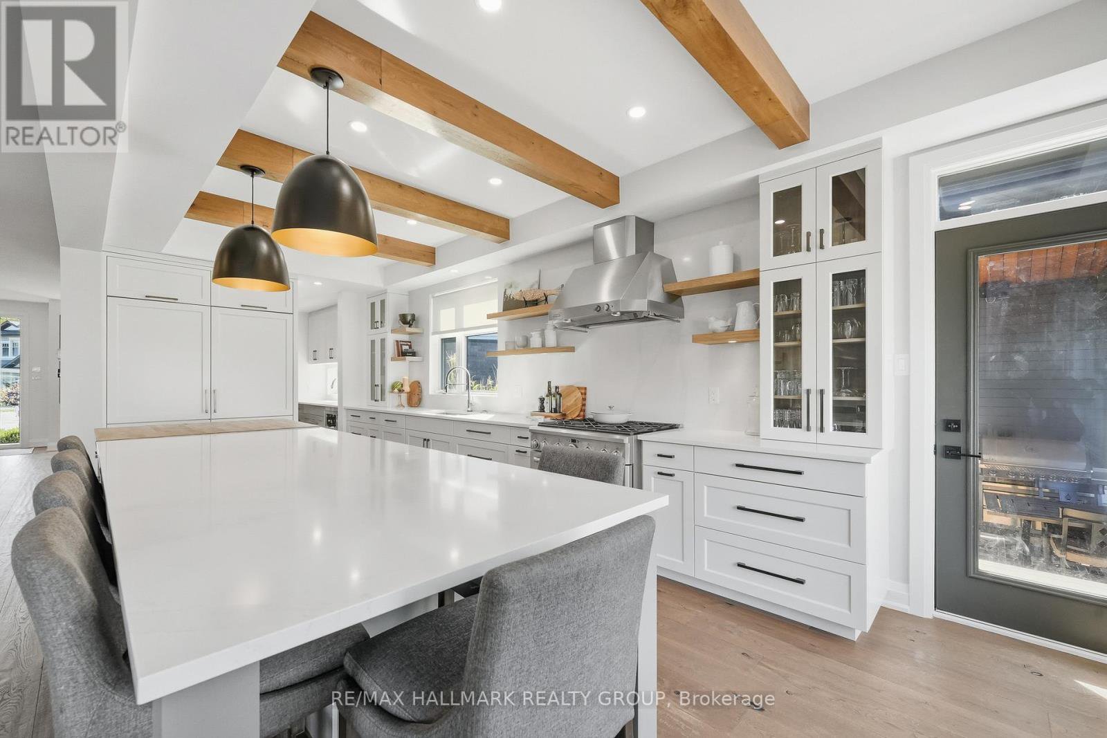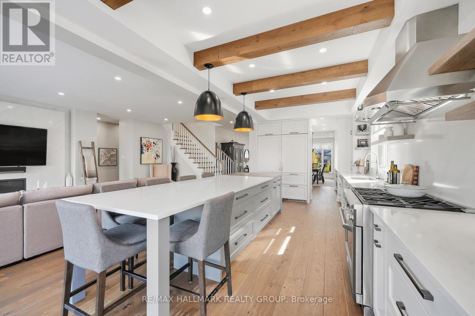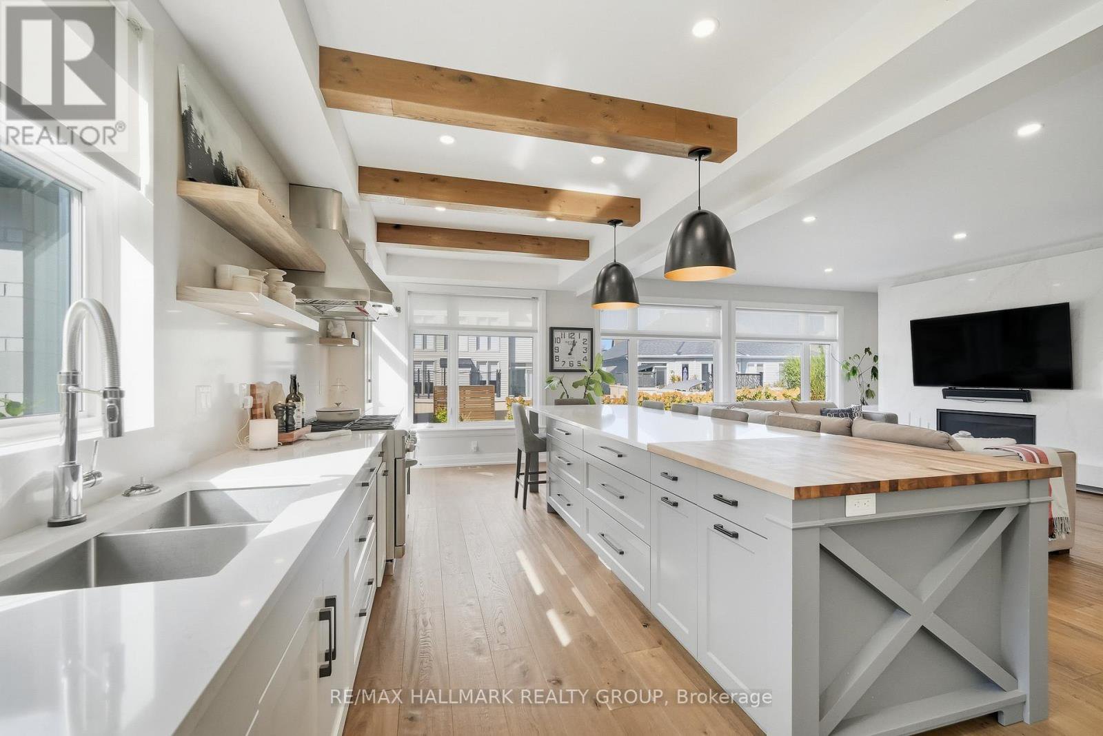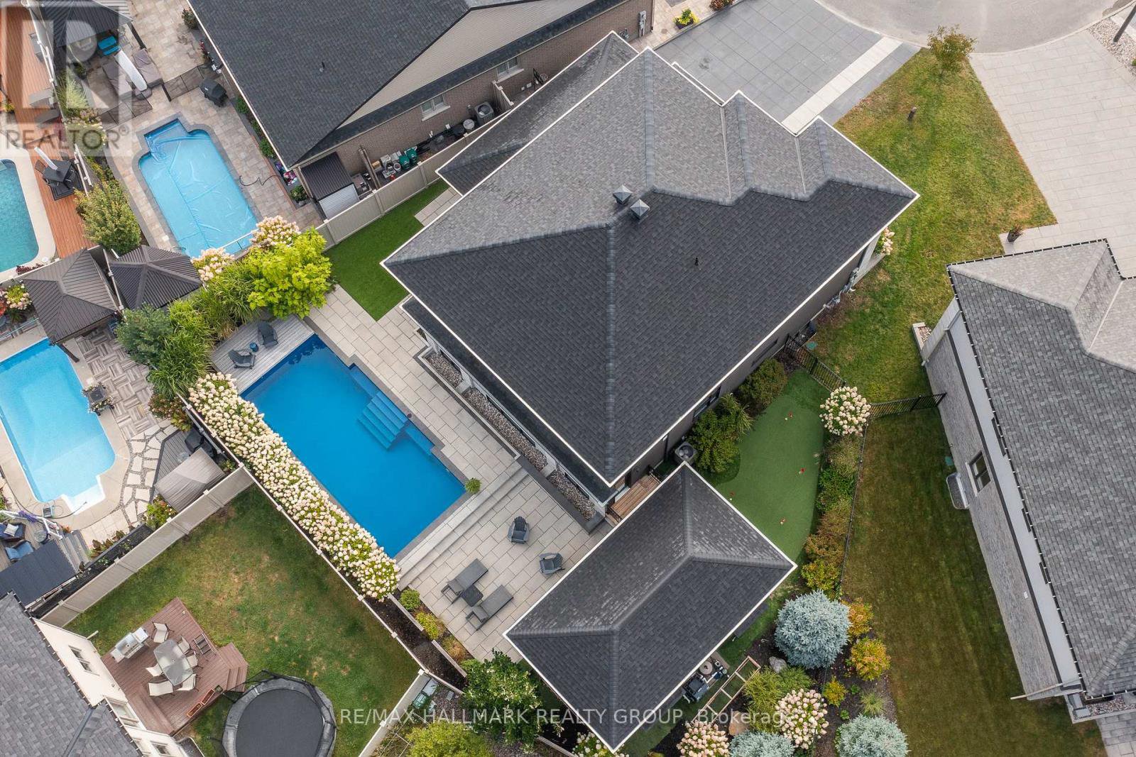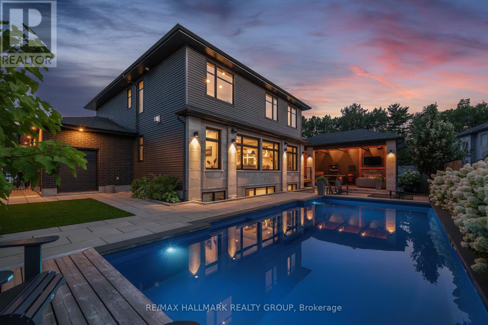 **OPEN HOUSE SUNDAY, NOVEMBER 9, BETWEEN 2-4PM** This stunning 5 bedroom home blends architectural sophistication with modern comfort, set in one of Orleans' most prestigious communities of Trails Edge. Its striking stone-and-brick exterior, modern landscaping and triple-car garage make an unforgettable first impression. Step outside to your backyard oasis - an entertainer's paradise featuring an inground pool, sleek stone patio, and a rustic-style covered pavilion with exposed beams, built-in gas BBQ, gas fireplace, TV area, and ample space to dine or lounge in style. Professionally landscaped for elegance and low maintenance, this outdoor retreat is perfect for summer gatherings and entertaining. Inside, rich hardwood flows throughout, complemented by pot lights and expansive windows that flood the home with natural light. The main level features a living room with gas fireplace, a private office with built-ins, and a chef's kitchen designed to impress - high-end appliances, gas stove, oversized island with seating for six, custom drawers, accent wood beams, and a convenient butler style service kitchen with two mini fridges, perfect for coffee, cocktails, or entertaining guests. Upstairs, the lavish primary suite boasts a boutique-style walk-in closet with island and a spa-inspired 5-piece ensuite with soaking tub, glass shower with rain head, and floating dual-sink vanity. Each secondary bedroom offers a walk-in closet and ensuite bath, while a generous laundry room with built-in storage completes the upper level. The finished lower level expands living space with a recreation area, wet bar, two bedrooms, a full bath, and abundant storage, creating an ideal retreat for family and guests. Combining modern elegance, sophisticated living, and exceptional walking access to top elementary and secondary schools, parks, and amenities, this home delivers the ultimate in comfort and style.