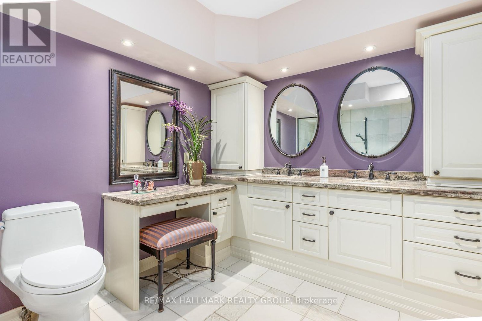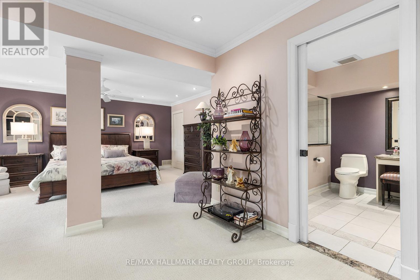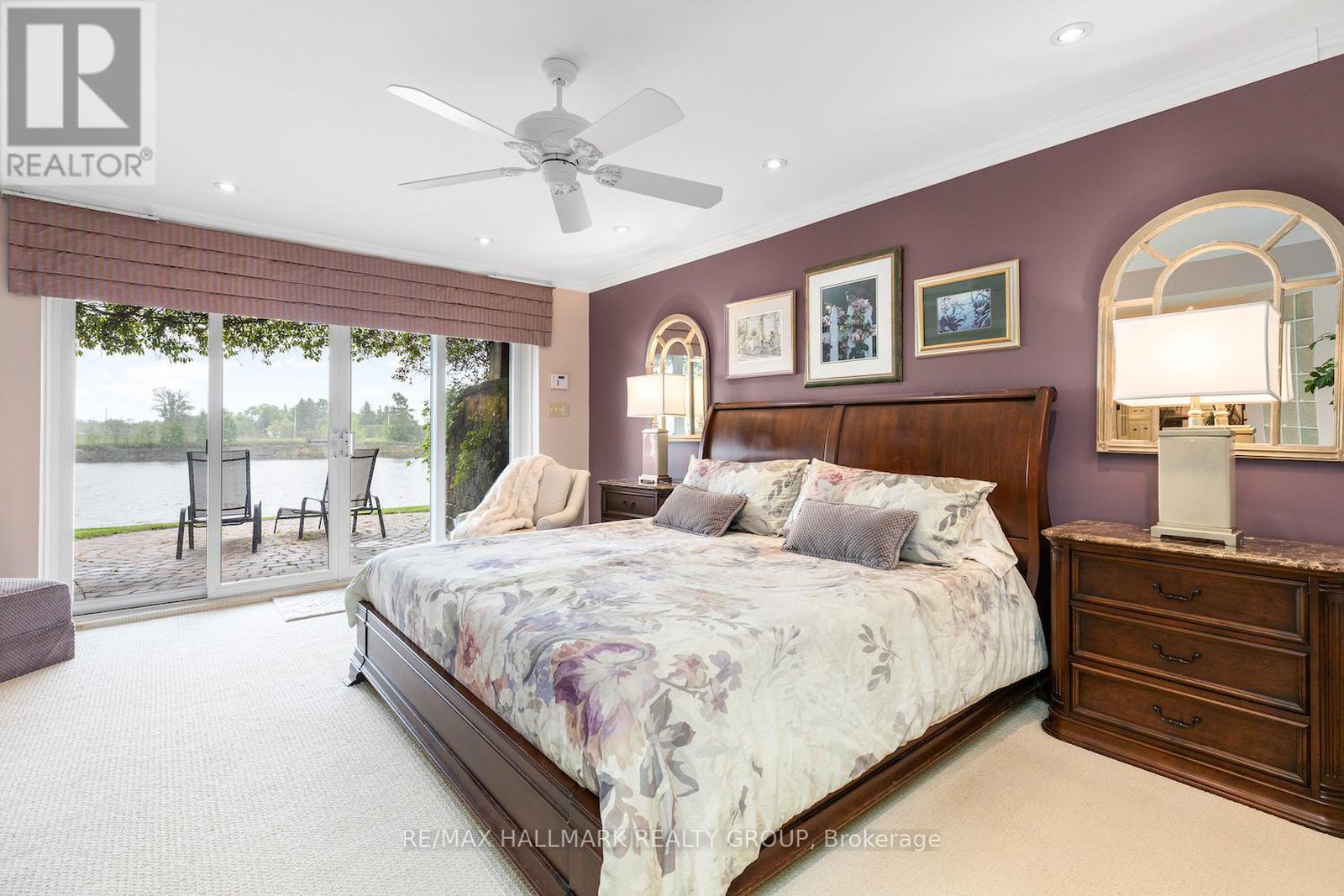 Escape to your private retreat on the Rideau River, where tranquility meets convenience. This stunning 3-bedroom, 3-bathroom bungalow sits at the end of Rideau Glen Drive, boasting 126 feet of picturesque shoreline. Enjoy breathtaking views from the expansive wrap-around deck, overlooking lush gardens, a manicured lawn, and your own private dock. Inside, the open-concept living room, kitchen, and dining area flow seamlessly to the deck, perfect for entertaining. High-end finishes shine throughout, from custom quartz countertops and rich wood floors to the elegant coffered ceilings in the formal dining room and a striking stone fireplace in the family room. The luxurious primary suite is a true sanctuary, featuring a private patio, a spacious walk-in closet, and a spa-like ensuite with heated floors. Two additional bedrooms and a full bathroom can be separately accessed, making them ideal for an Airbnb rental or guest suite. City approval has also been granted for the addition of an oversized two car garage at the north side of the home. Located just minutes from top schools, shopping, the airport, and an exclusive golf course, this rare waterfront gem offers the best of both worlds peaceful riverfront living with all the perks of city life.