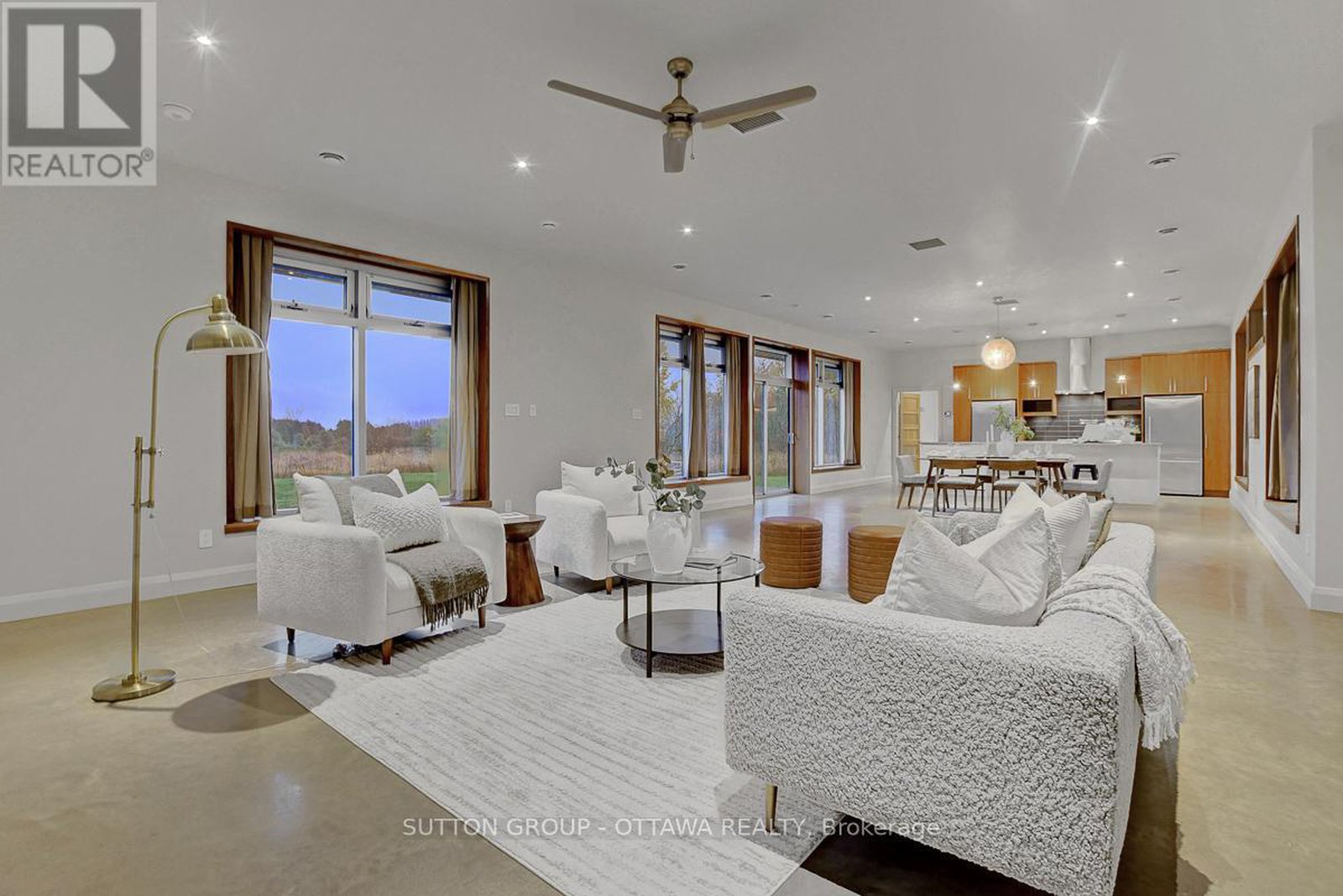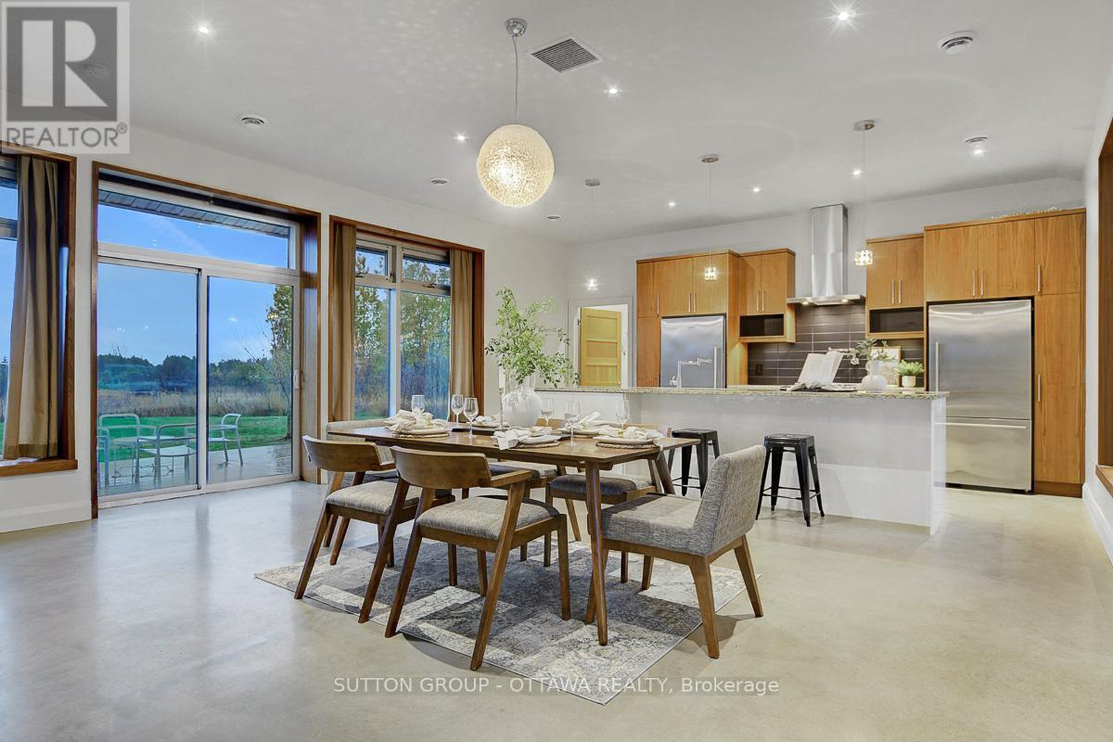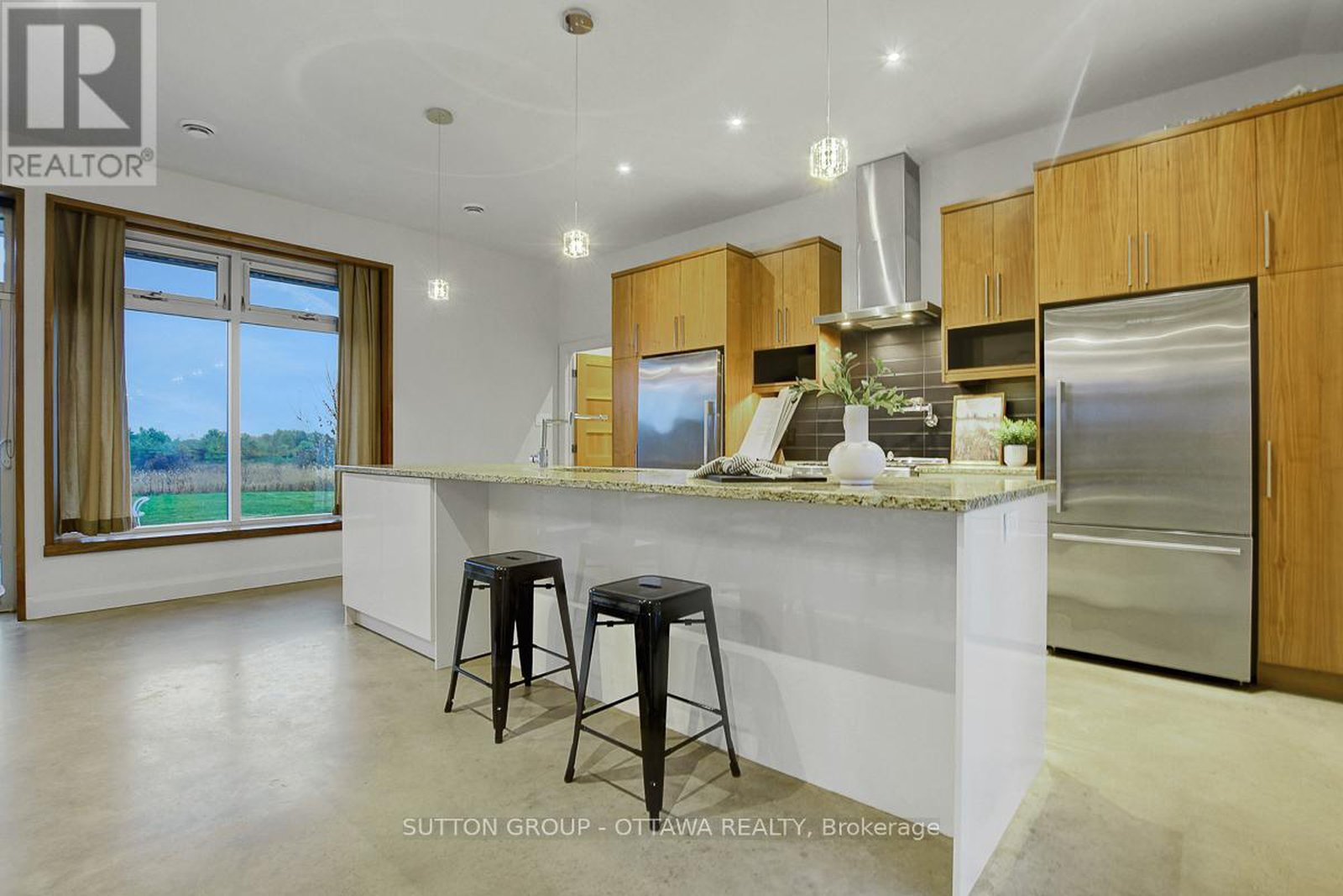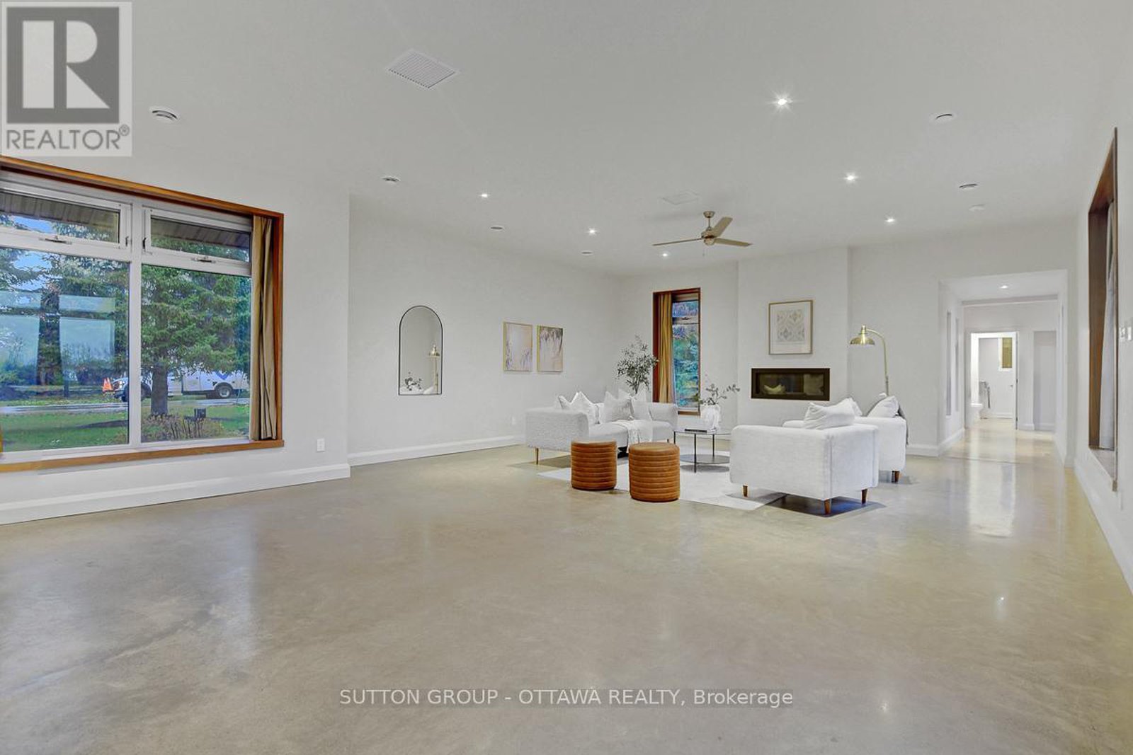 Welcome to 7844 Bleeks Road - Country Luxury in the Heart of Munster Located in the charming village of Munster and within walking distance of Saunders Farm, this beautifully updated bungalow sits on a tranquil two-acre lot that perfectly blends country serenity with modern comfort. Originally renovated in 2014 and expanded with a stunning addition in 2018, the home showcases quality craftsmanship, thoughtful design, and an inviting open-concept layout ideal for family living and entertaining. Step inside from the side entrance into a wide hallway that leads to a bright, spacious living area where polished concrete floors with radiant heat create warmth and elegance. The chef's kitchen features stainless-steel appliances, a gas stove with pot filler, and an abundance of counter space, flowing naturally into the dining and living rooms filled with natural light and scenic views of the surrounding greenery. The home offers three bedrooms and three full bathrooms, including a generous primary suite with a beautifully renovated ensuite completed in 2025. The second bathroom, completed in 2018, doubles as a convenient laundry space. A fully finished basement extends the living area and sits beneath the 2018 addition, perfect for a recreation room, gym, or home office.Outside, a wrap-around deck overlooks a gently sloping backyard surrounded by trees, offering the perfect setting for outdoor gatherings or quiet mornings with coffee. The property features a drilled well, a new septic system installed in 2018 and pumped in 2020, a metal roof on the main home, and new shingles and siding on the addition. Ample driveway parking provides space for family and guests alike. Only twenty minutes from Highway 417, this property offers the best of both worlds - peaceful country living with convenient access to Ottawa's west-end amenities.Easy to show. Heated thermal floors on one side and forced air on the new additions. 2 furnaces, 2 Ac, 2 Hot water tanks