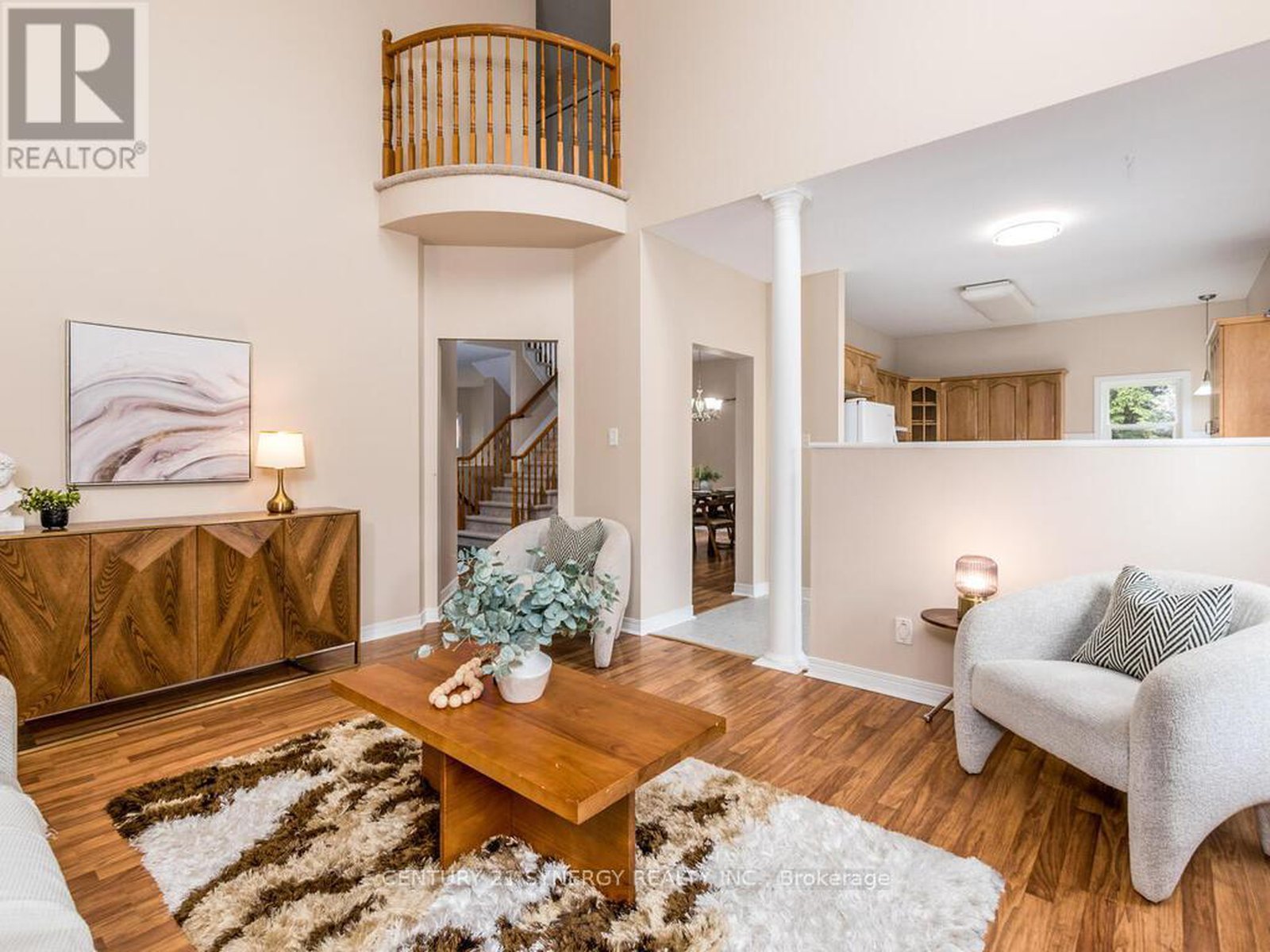 Nestled on a picturesque street, this beautiful home exudes warmth, comfort, and style. Surrounded by scenic trails, parks, and convenient amenities, it offers the perfect blend of nature and neighbourhood living. Step inside and be greeted by a soaring 18-foot ceiling in the main-floor family room - a stunning architectural feature that fills the space with natural light and creates an inviting gathering place for family and friends. Also featuring a lovely gas fireplace. The versatile floor plan includes a main-floor living room, ideal as a formal sitting area or home office. The bright, updated kitchen features gorgeous new quartz countertops, abundant cabinetry, and a patio door leading to the generous 59-foot lot, complete with new fencing (2023) - ready for your landscaping dreams. Upstairs, you'll find three spacious bedrooms, second-floor laundry, and a charming balcony overlooking the family room, adding even more light and openness to the second level. Fresh new carpeting adds comfort and style throughout.The primary bedroom suite is a peaceful retreat, complete with a walk-in closet and a lovely 4-piece ensuite featuring a soaker tub, standalone shower, and elegant new quartz vanity top. Notable updates include a new roof (2019), new fencing (2023), new quartz counters, sinks, and taps in the kitchen and two bathrooms (2025), fresh paint throughout, and new carpeting on the second floor (2025)- providing peace of mind for years to come.While the unfinished basement offers excellent storage, it's also an ideal space for a home gym, play area, or future finishing potential. Discover why homes on Eliza Crescent are so magnificent - a wonderful community where pride of ownership and thoughtful design meet.