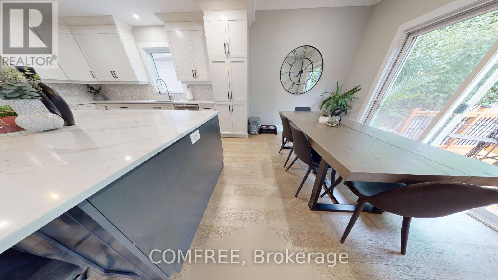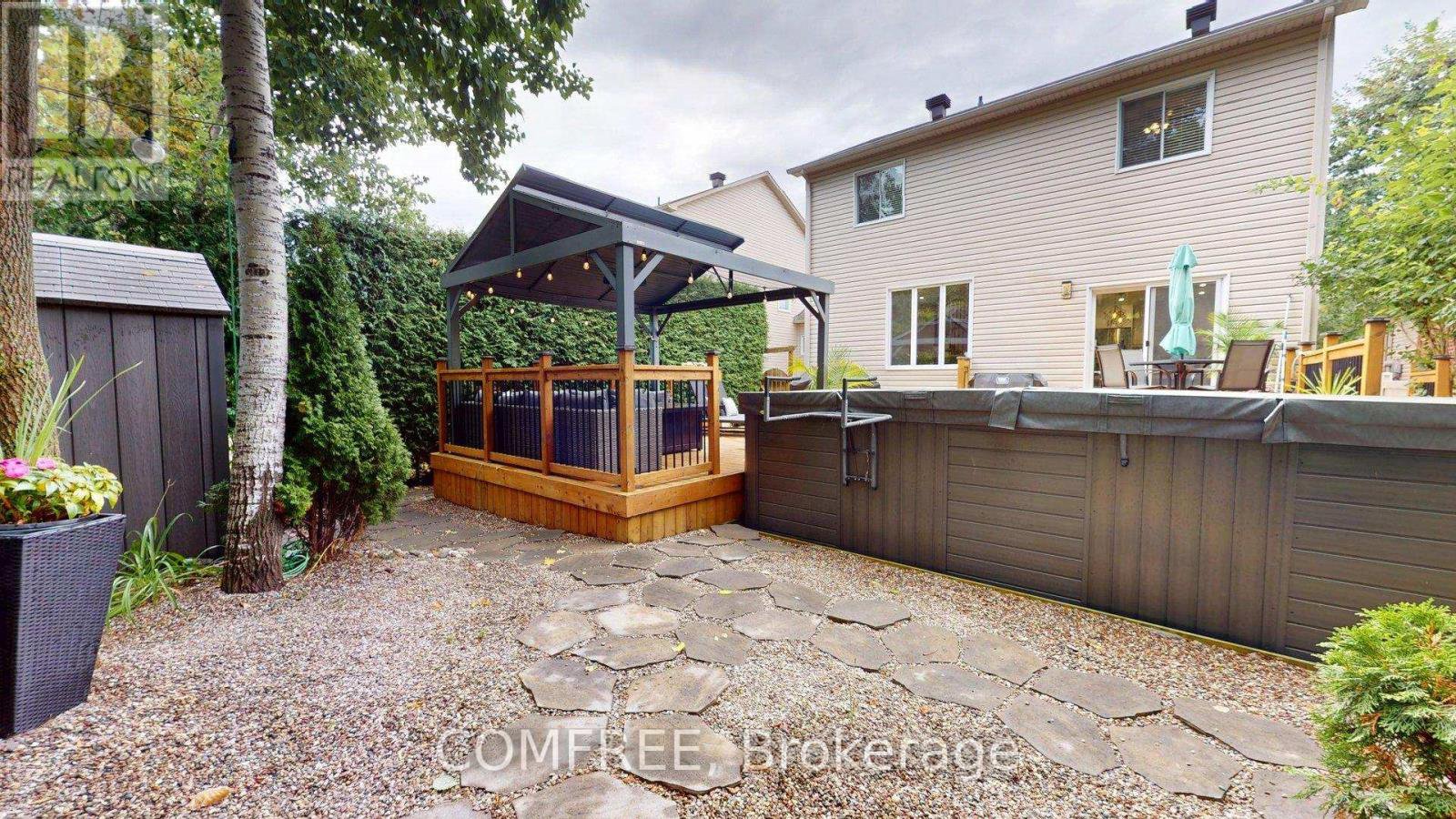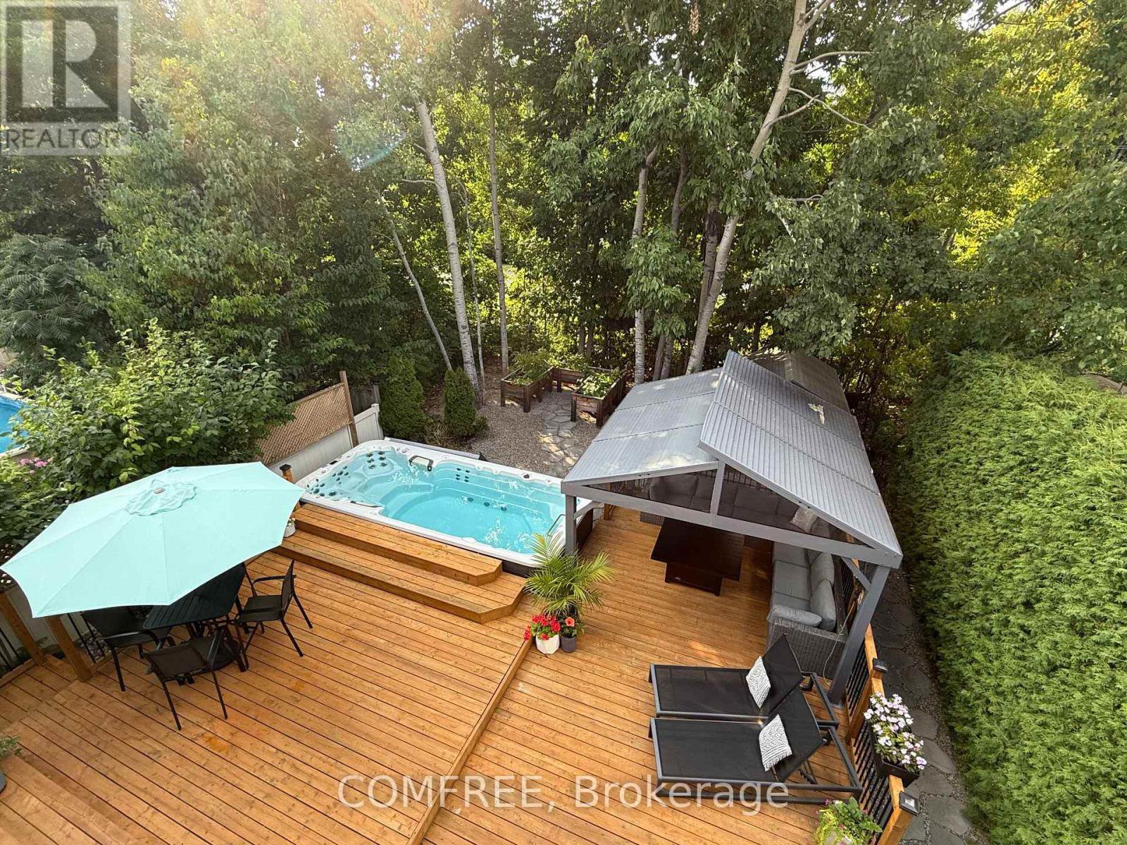 Beautifully renovated 2-storey home offering 2700 sq. ft. of living space, featuring 3+2 bedrooms and 4 bathrooms. Extensive renovations completed in 2021 showcase high-end, modern finishes throughout. The bright and inviting main floor is filled with natural light from large windows overlooking a landscaped backyard and spacious deck (2020). The kitchen boasts a quartz countertop, ample cabinetry, and contemporary fixtures, while the adjacent dining area and generous den provide flexibility for work or leisure. Upstairs, the primary bedroom impresses with a vaulted ceiling, a luxurious ensuite with a double-sink vanity, a large glass-enclosed shower, and a walk-in closet. Two additional bedrooms, sitting/flex area and a full bathroom complete the upper level. The fully finished basement offers a large family room, two additional bedrooms, and a full bathroom ideal for guests, extended family, or recreational use. The insulated and heated double garage adds year-round convenience. Recent updates include roof (2019), main bathroom (2025), and heat pump (2024). Situated on a quiet crescent with no rear neighbours, this property provides a private, treed low maintenance backyard oasis including a raised garden bed area, with a huge deck great for entertaining with room for sitting/lounging and a swim spa area next to the spacious gazebo, while being close to parks, public transit, and shopping.