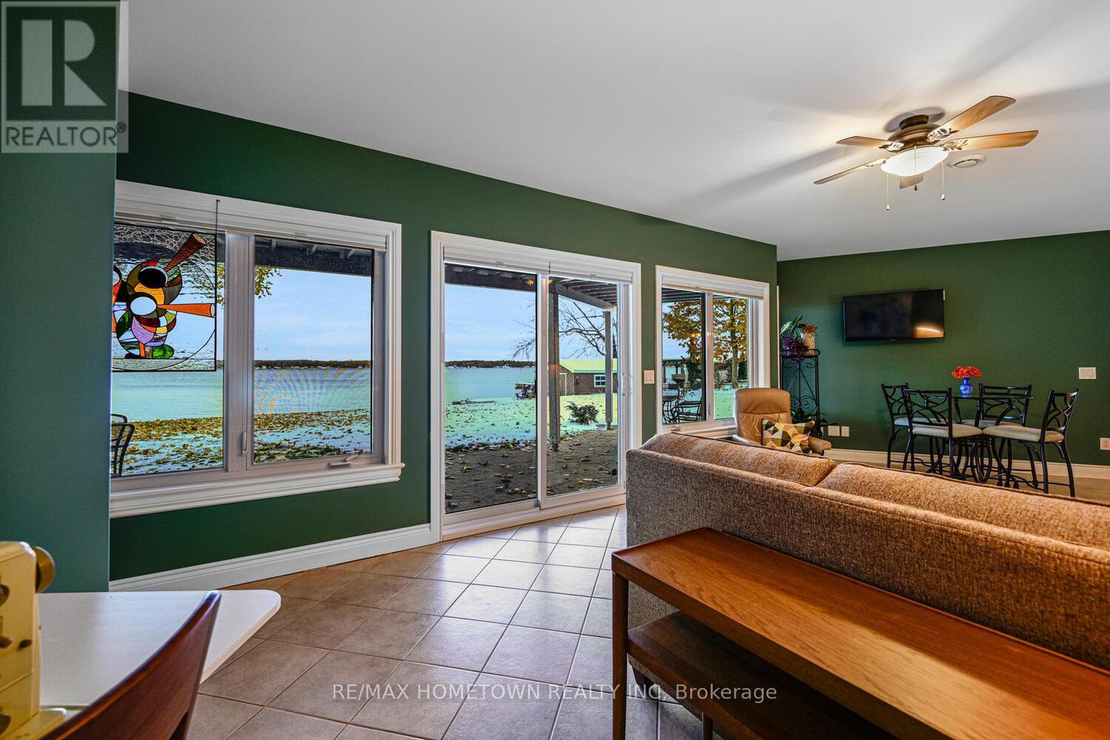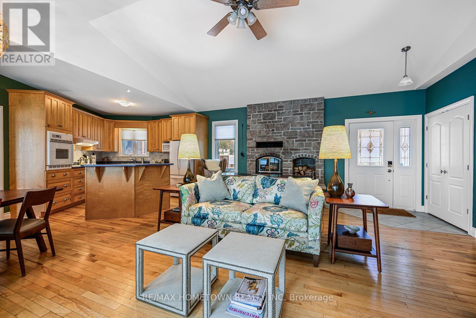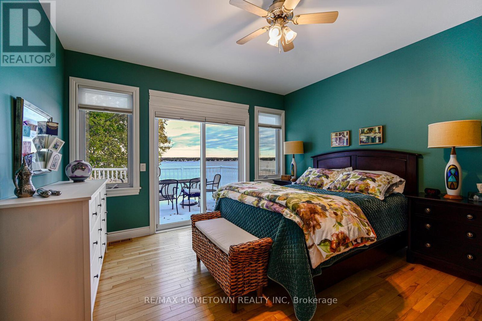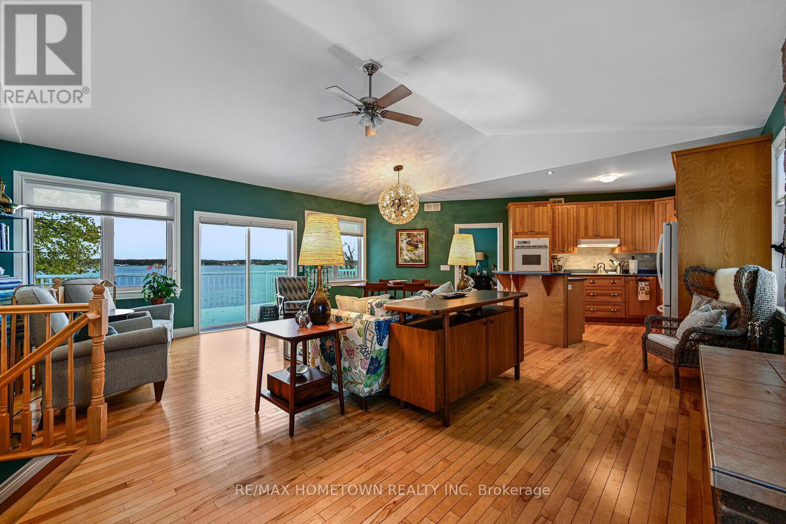 A home ready for the holidays-welcome to 1219 County Road 2, a refined St. Lawrence River residence just west of the pretty village of Maitland and moments from the Brockville hub. This exceptional waterfront setting offers a rare balance of global reach and peaceful, unhurried living. Sunrises glow across the water, moonlight shimmers on the currents, and international ships pass by like moving artwork-beauty always in motion. The property has been thoughtfully refreshed with new perennial gardens, interlocking stone, a newly paved 8-car drive, and a brand-new septic, ensuring confidence and ease of country living. A full veranda spans the front of the home, providing an elegant outdoor space to enjoy the river's four spectacular seasons and the sweeping panorama toward upper New York State. Inside, approx. 1,200 sq ft on each level offers light-filled, open living. The main floor features 2 serene bedrooms and 2 stylish baths, complemented by warm in-floor heating and a charming wood fireplace that enriches the home's ambiance. The lower walkout level adds 2 additional bedrooms and 1 bath, a bright rec room, and a flexible office area-ideal for guests, hobbies, or multi-generational living. With 150 + ft of owned waterfront and a rare dry boathouse, this property delivers exceptional appeal for riverfront enthusiasts. Step down to the gentle shoreline and experience the calm and grandeur of one of the world's great waterways. Tastefully presented, meticulously maintained, and available for immediate occupancy, this home offers tranquility, beauty, and a timeless riverfront lifestyle.