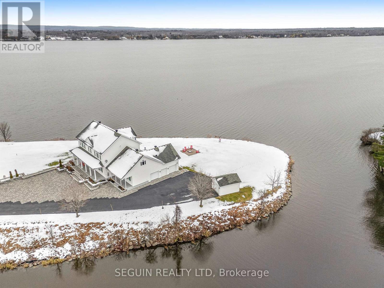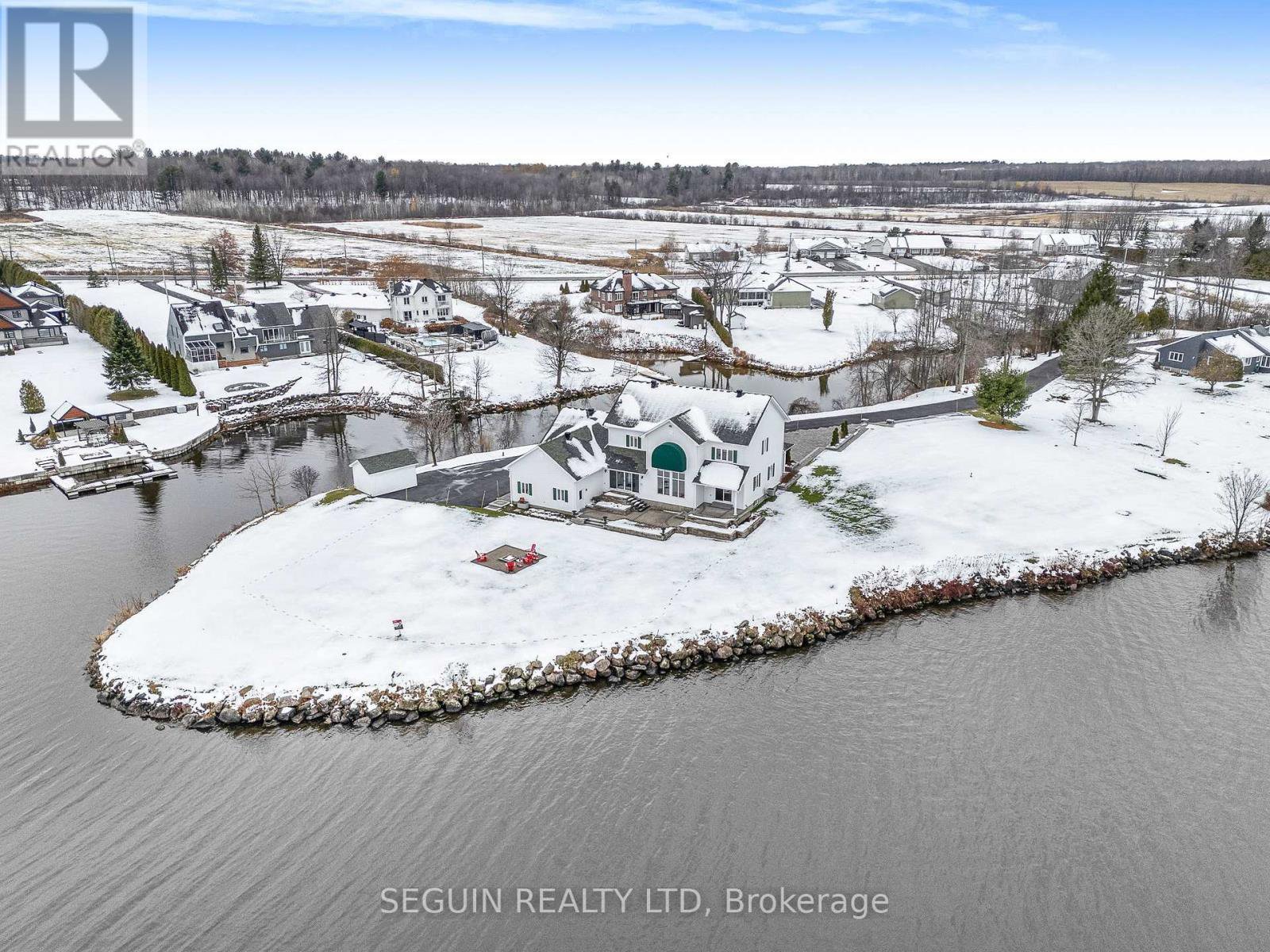 A ONCE IN A LIFETIME OPPORTUNITY TO OWN A WATERFRONT PROPERTY LIKE THIS IN THE AREA!I Introducing a truly rare and prestigious waterfront estate, set on a breathtaking 1.93-acre private peninsula with over 360 feet of pristine shoreline. Perfectly positioned to capture uninterrupted panoramic views of the Ottawa River, this property offers an exclusive lifestyle of serenity, sophistication, and natural grandeur. Every element of this residence has been designed to inspire, with elegant architectural details, 9-foot ceilings throughout, and a show-stopping 19-foot cathedral ceiling in the grand family room. Floor-to-ceiling windows frame the water like fine art. while a double-sided fireplace adds warmth and refinement to the space. The heart of the home is a stunning open-concept kitchen featuring an oversized island and top-of-the-line appliances, perfectly suited for everyday living. Enjoy two spacious living rooms, ideal for both formal entertaining and relaxed family gatherings, as well as a dedicated home office featuring breathtaking views of the river. The ultimate work-from-home sanctuary. The main floor also includes a 2-piece powder room, a separate laundry room, and direct access to a triple car garage, with a private entry to the fully finished basement. Upstairs, the luxurious master bedroom offers a spa-inspired ensuite with radiant flooring, a fireplace and an expansive walk-in closet that will exceed expectations. Two additional well-appointed bedrooms and a stylish bathroom complete the upper level. Outside, the property is a private oasis, with professionally landscaped grounds and a full sprinkler system to keep the lush surroundings pristine with ease. For boating enthusiasts, a secluded private bay offers protected docking and effortless access to the water a rare and coveted feature on this stretch of the river. This is more than a home; it's a legacy property, a private sanctuary, and a showcase of refined riverside living.