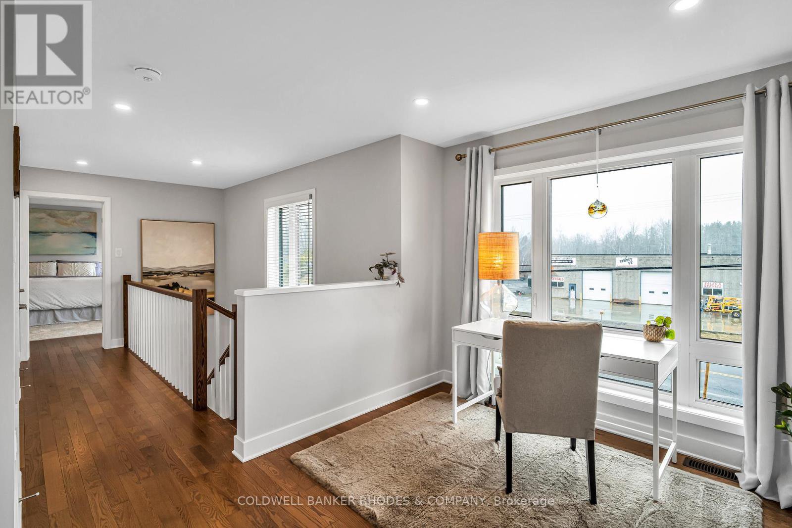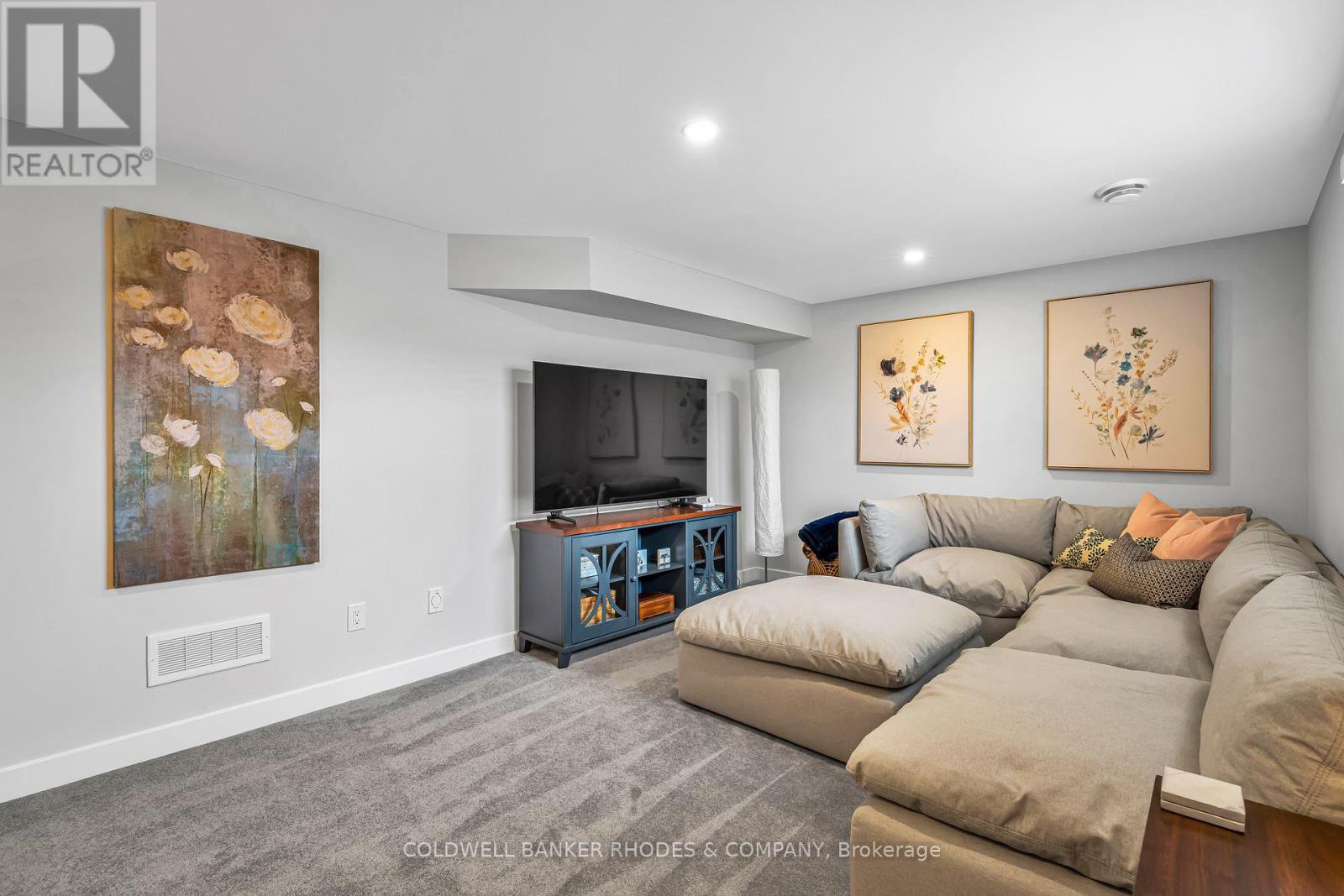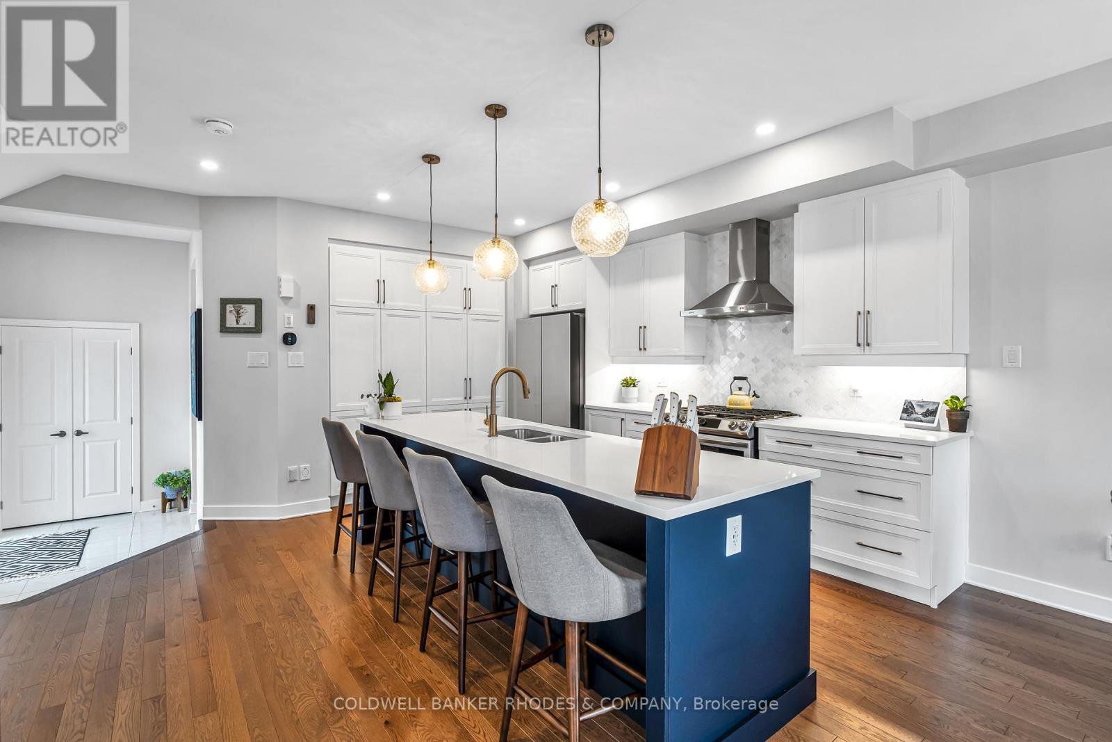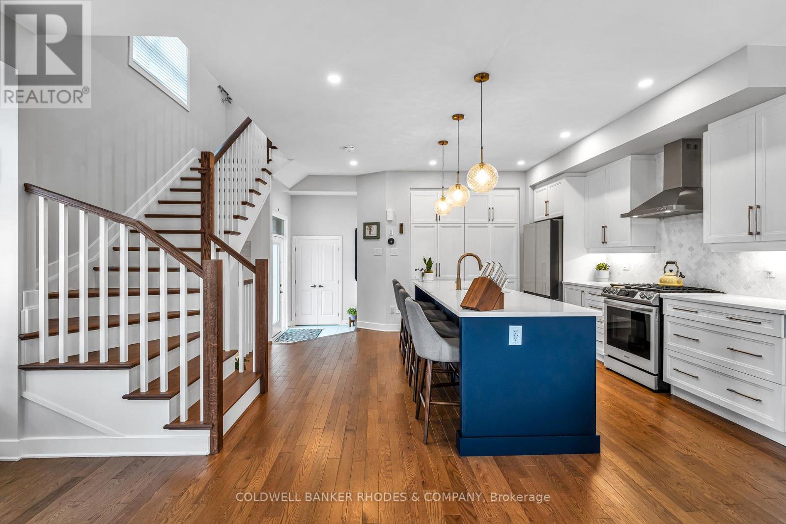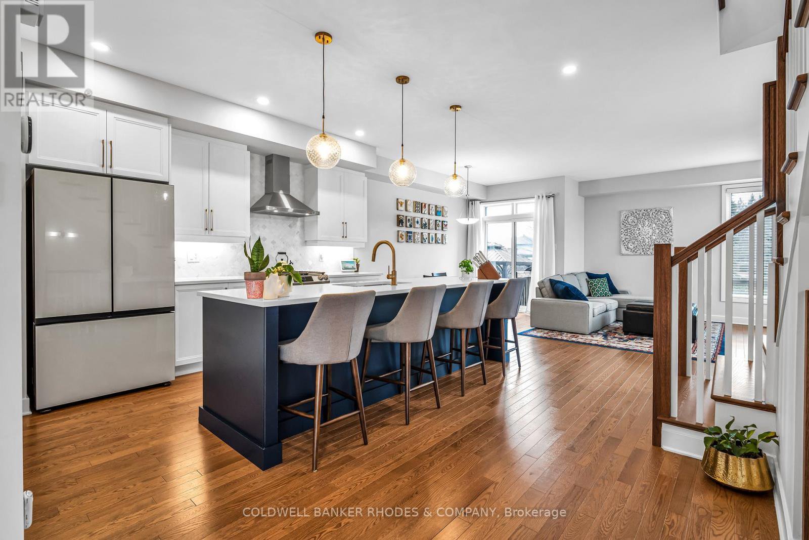 Stunningly upgraded move-in ready townhome in Kemptville's "the Creek" Development by Urbandale! 3 bedroom 2.5 bathroom Da Vinci END UNIT features a double garage and a huge corner lot. This home is highly finished with a chic, modern aesthetic and perfect for a family or professional. The main level features an open concept living/dining/kitchen with soaring ceilings. Engineering hardwood flooring with tile entryway. Showstopping kitchen perfect for entertaining with quartz countertops, huge centre island with counter seating and tile backsplash. Cozy living room with gas fireplace. Main floor dining area and access to the backyard via patio doors. The 2nd floor features engineered hardwood flooring throughout with loft area perfect for a home gym or office. Primary bedroom features walk in closet and luxurious 5 piece ensuite with quartz countertops, double sinks, soaker tub and separate tile shower. Two good sized additional bedrooms with 2nd bedroom featuring walk in closet. 2nd full bathroom with custom tile floor and quartz countertops. Laundry closet conveniently located on the 2nd level. Finished basement with high ceilings and large additional unfinished storage area. Double garage and double driveway! Great location in Kemptville with quick access to shopping, amenities and restaurants. Great access to nature close to Rideau River trails and the Kemptville Creek.