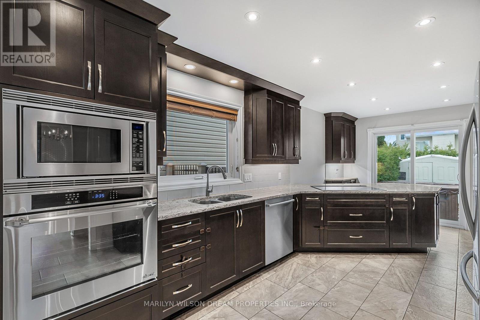 Beautifully maintained and thoughtfully updated throughout the years, this 3-bed, 3-bath family home combines quality finishes, functional design, and an unbeatable location. This corner lot is nestled across from Barrington Park with its soccer field, playground, skating rink, and splash pad-this home offers the perfect blend of recreation and convenience. Walk to groceries, Starbucks, nearby schools, parks, and transit plus quick access to Highway 174 makes commuting effortless. A picturesque, walkable neighbourhood ideal for families and professionals alike. Inside this spacious, carpet-free 5-level backsplit filled is flowing with natural light, high ceilings, and large windows. A formal dining area-perfect for hosting-sits just off the chef's gourmet kitchen, featuring ebony stained wood cabinetry, stone countertops, oversized breakfast bar (4 stools) & exceptional storage. The convenient mudroom/laundry room with inside entry to the double garage & powder room off the front foyer. Step up to a bright living room open to the dining area, highlighted by vaulted ceilings, large windows, and an electric fireplace with built-in speakers. The Upper Level is where you'll unwind from the day in the primary suite with walk-in closet & updated 3-pc ensuite. Two additional generously sized bedrooms and main bath with modern vanity & full tub/shower combo complete the upper level. A few steps down from the main floor, you'll find the cozy family room with gas fireplace, plus a finished basement with den/office, recreation room, closet, crawl-space access, and large storage/utility room. Step outside into your private, southeast-facing backyard oasis, surrounded by mature cedar hedges and designed to enjoy every season. Highlights include a stamped concrete patio, front patio, hot tub, storage shed, and natural gas BBQ hookup (BBQ included)-all with plenty of room to play, garden, and entertain. Reach out today for a complete list of updates!