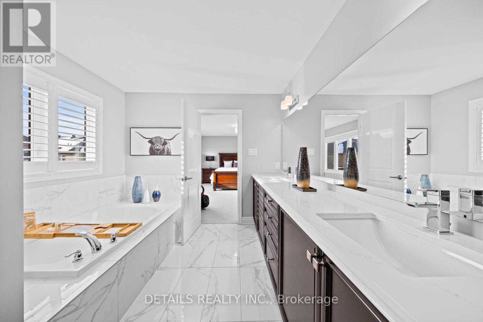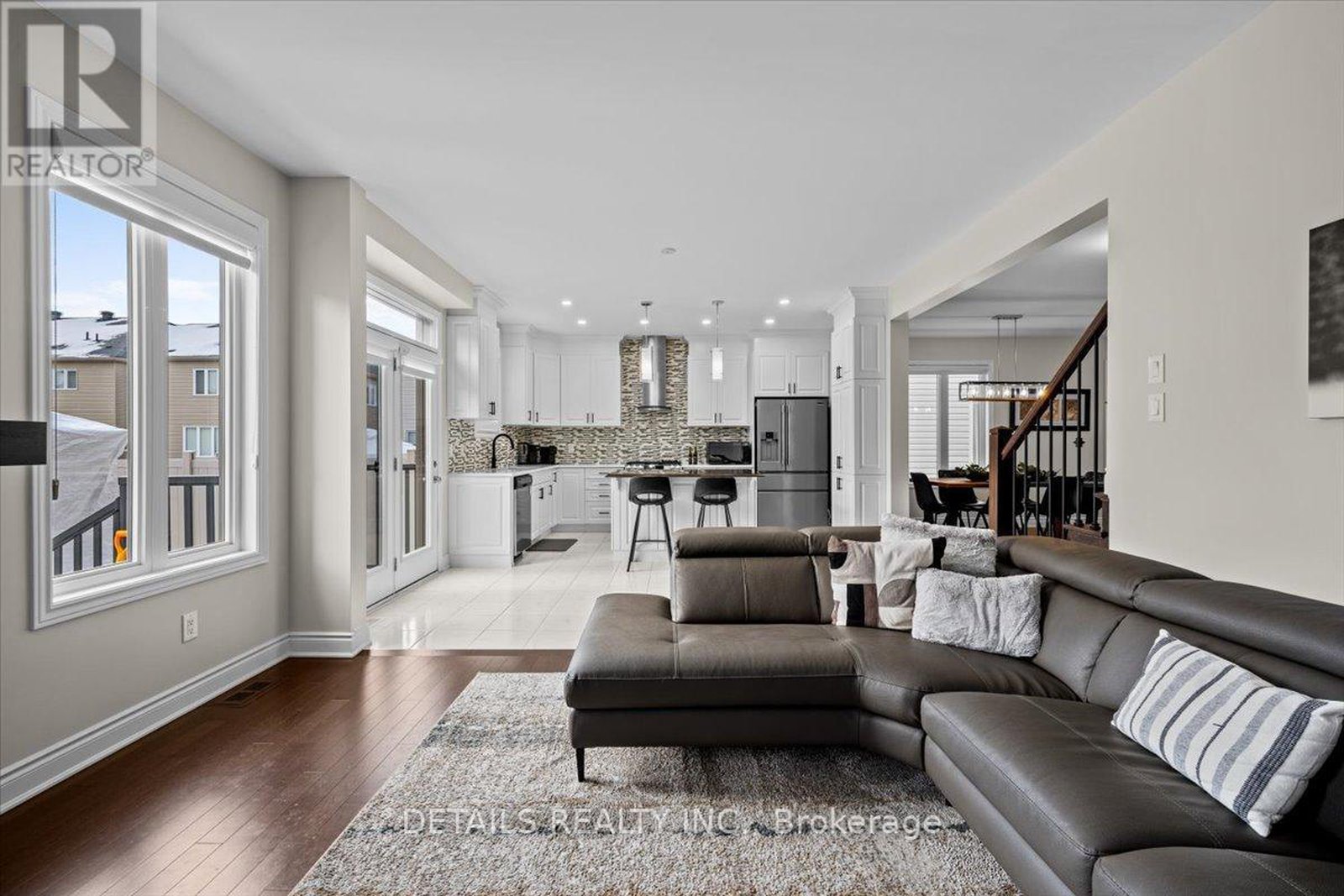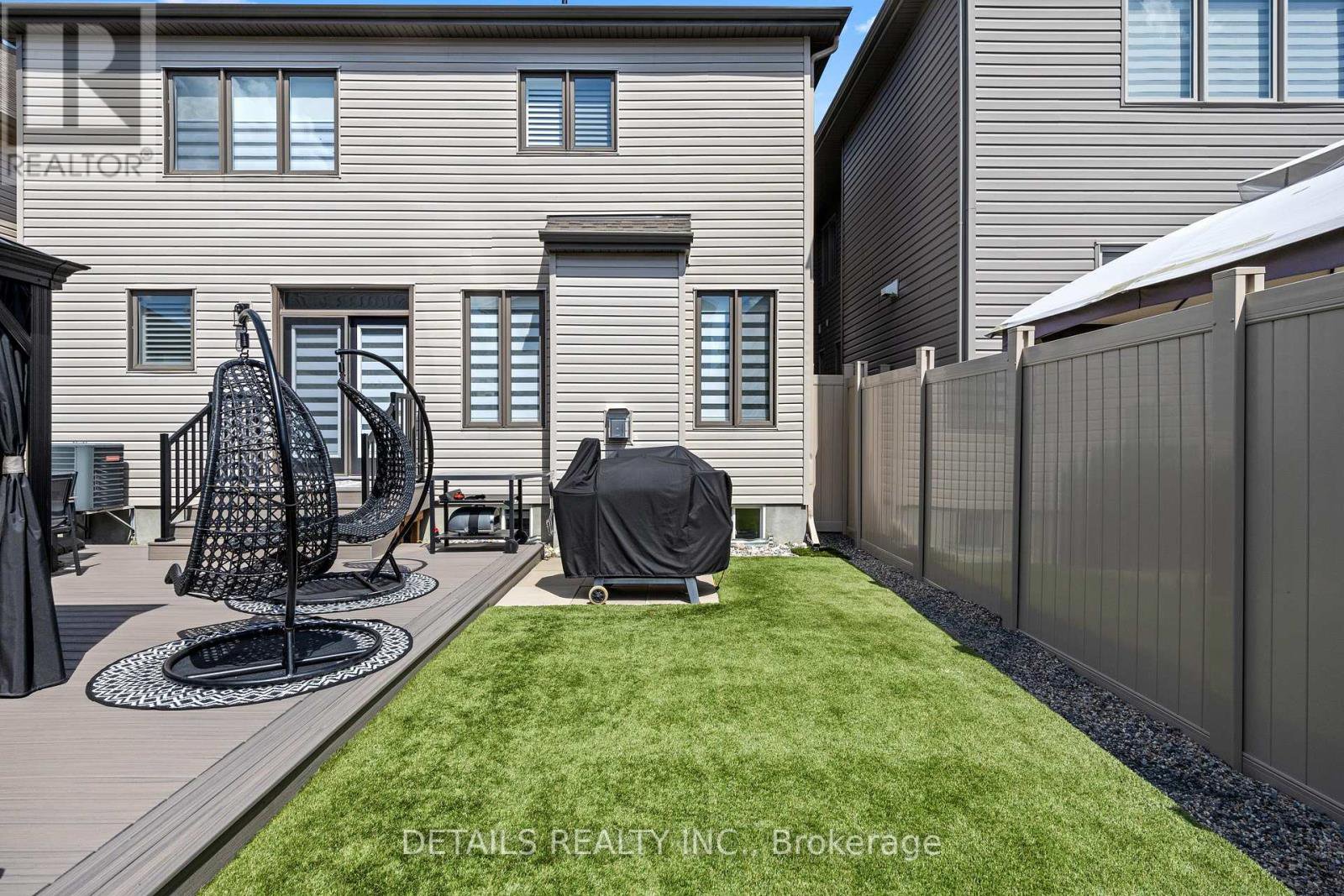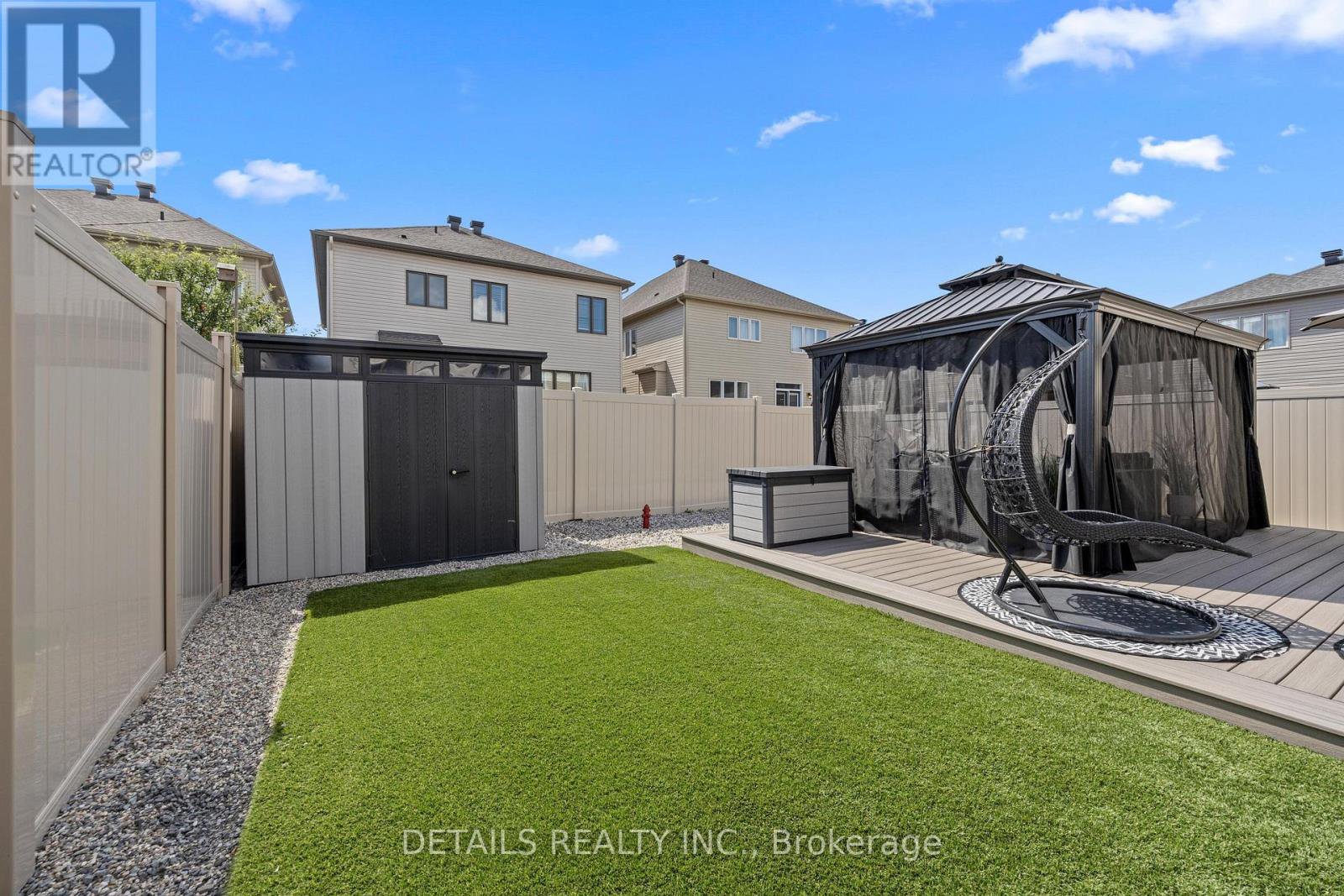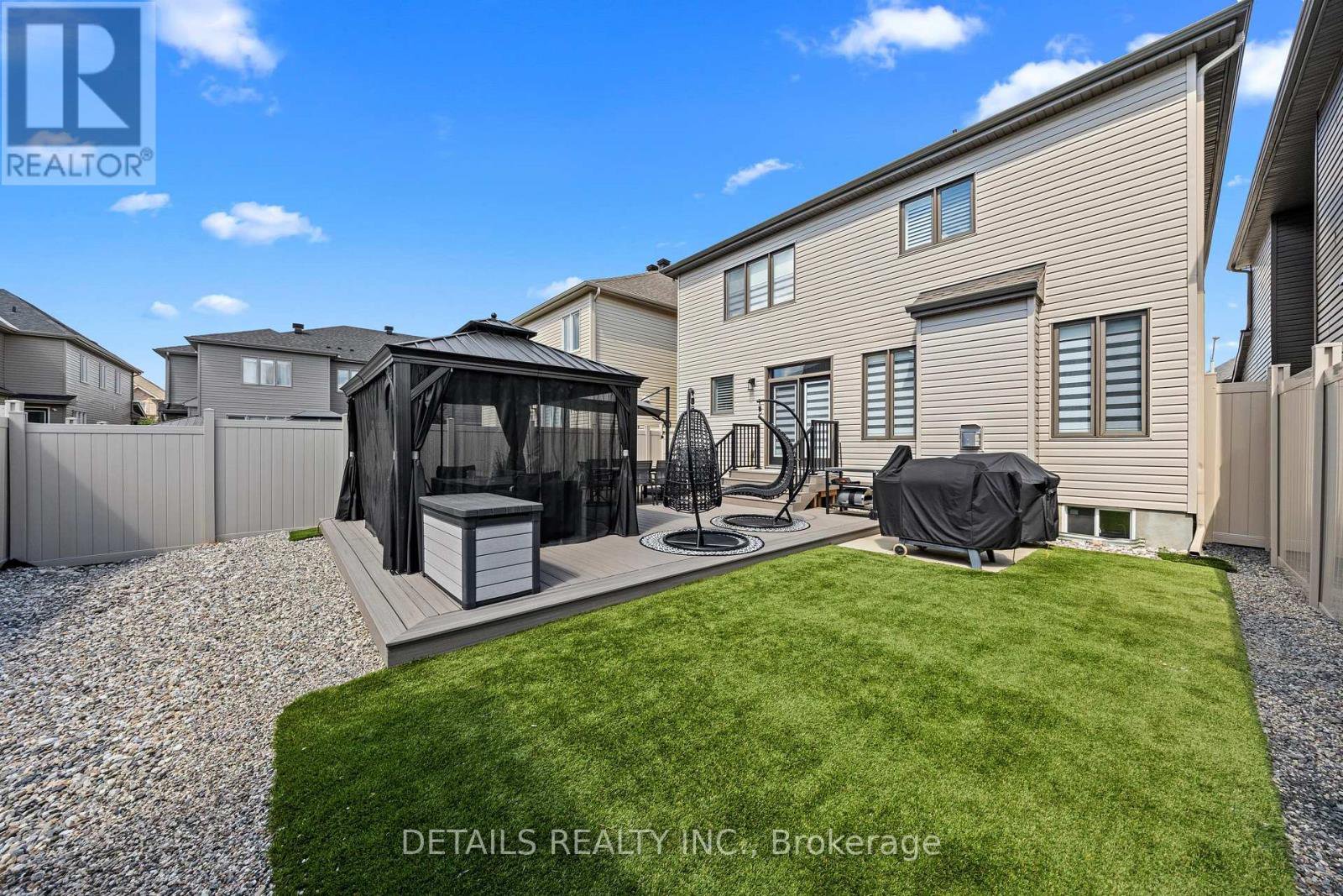 Welcome to 1008 Manege Street, a beautifully maintained home nestled in a quiet and sought-after corner of Stittsville, just minutes away from excellent schools, parks, and shopping. Upon entering this home you will discover superb style and designer decor throughout. The kitchen features quartz countertops, a spacious open -concept layout, top of the line stainless steel appliances; refrigerator and gas stove. The rich dark hardwood floors and ceramic tile span the main level, creating an elegant, cohesive flow. The bright and inviting family room offers plenty of space to relax, enhanced by a sleek modern gas fireplace. Convenient main-floor laundry and direct access to the double car garage are added bonuses, From the dining area, garden patio doors lead to your maintenance free backyard oasis. Enjoy a 24' x 20' composite deck, and a 14' x 12' gazebo with mesh and curtains, and high end artificial grass that stays green year round, no more weekend mowing. there is also a dedicated BBQ area (gas) installed.and to store all your items there is a 9' x 7' shed for that. Upstairs, the spacious primary bedroom includes a large ensuite with a separate shower and a soaker tub. Three additional generously sized bedrooms provide comfort and privacy for the whole family. The fully finished lower level adds even more living space, featuring a cozy seating area, an additional bedroom and a full bathroom with heated floor and a heated towel rack. In addition ample storage. This home is truly a must see, offering style, comfort, and low maintenance living in a fantastic location.