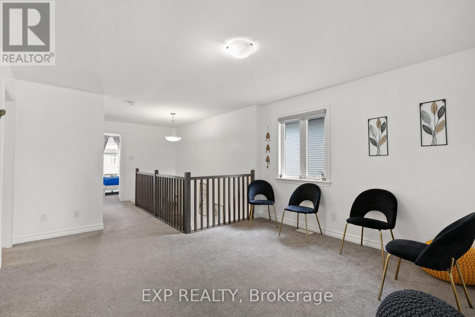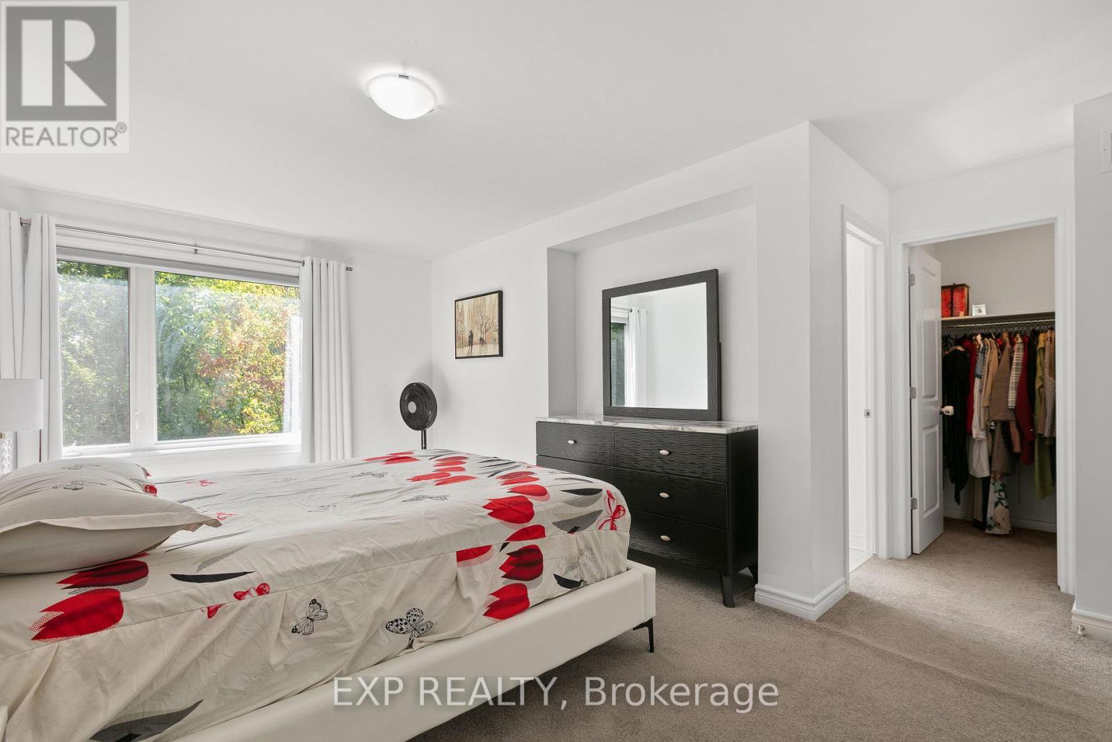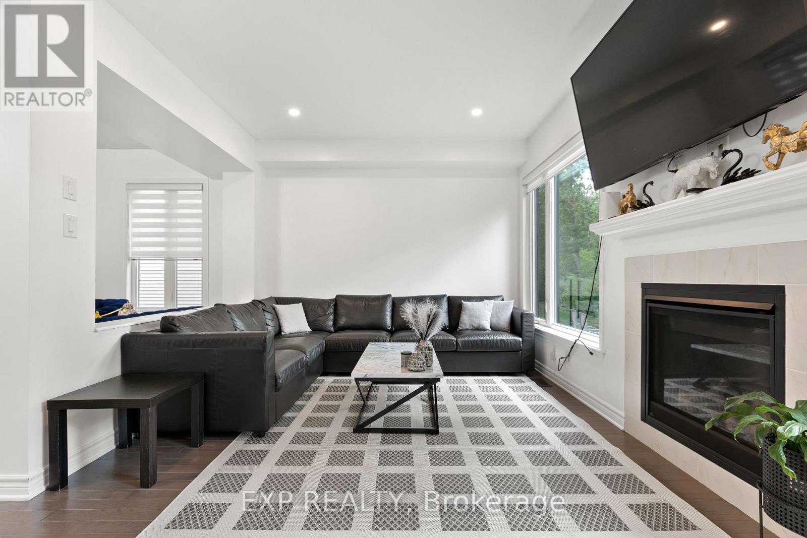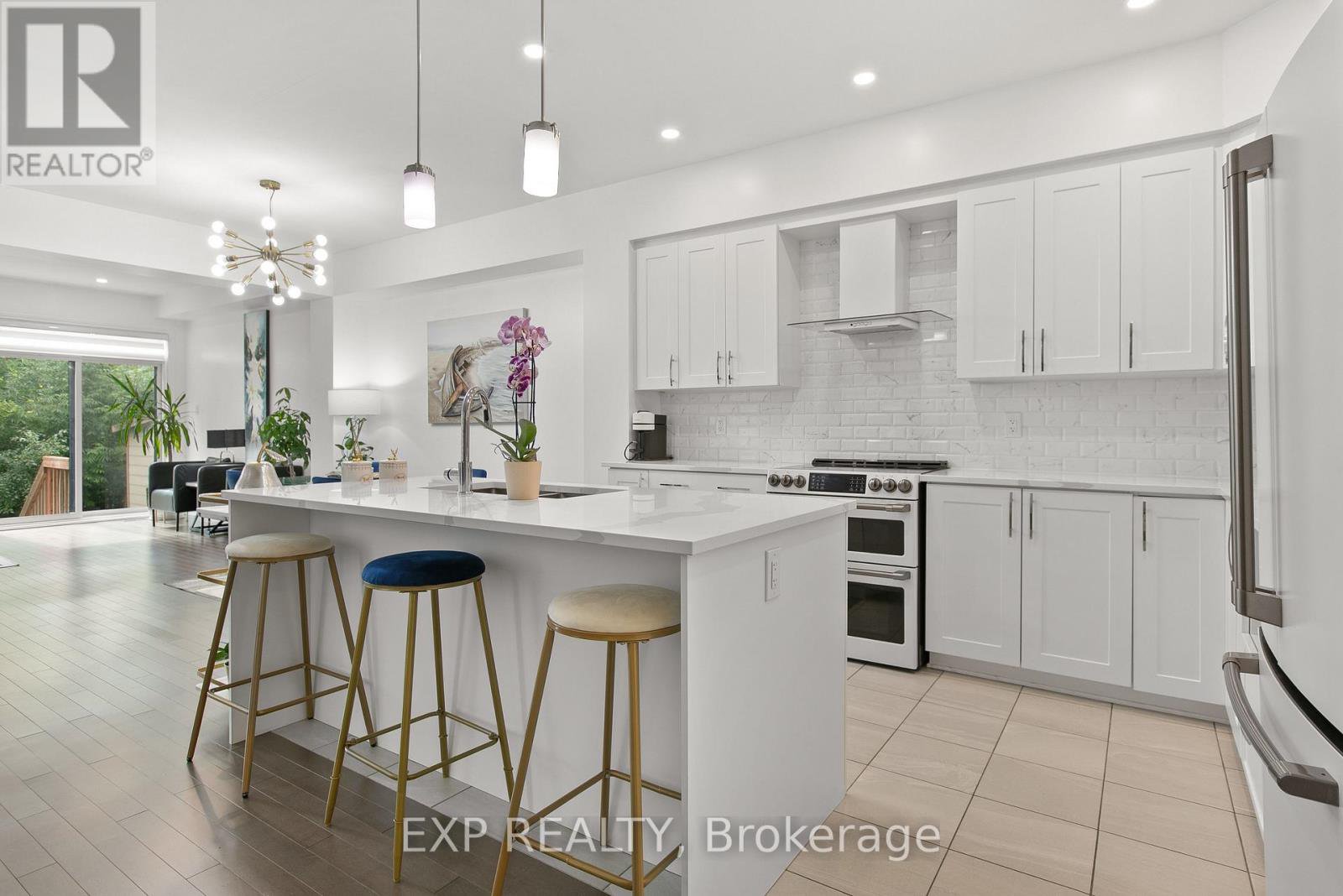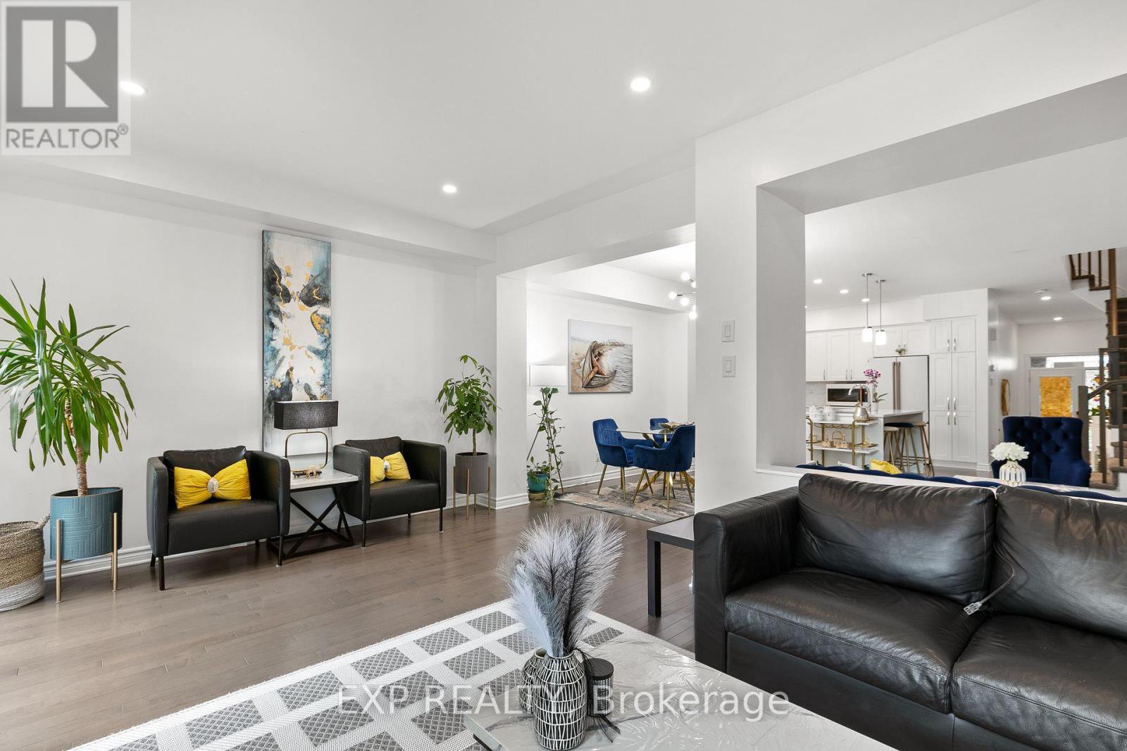 Welcome to 1010 Eider Street, stunning Fairhaven-End model by Richcraft Homes in highly sought-after Riverside South. Built in 2022, this meticulously maintained 3-bed + den, 3-bath END-UNIT townhome offers over 2,200 sq. ft. of living space, backing onto a serene treed area with NO REAR NEIGHBOURS. Step inside to find elegant hardwood floors throughout the main level, a bright open-concept layout, and a gas fireplace that adds warmth to the family room. The chef-inspired kitchen features quartz countertops, sleek cabinetry, and a full suite of luxury White Café appliances. Enjoy casual dining at the breakfast bar or entertain in the adjacent dining area overlooking the private backyard. Upstairs, a generous loft/den provides the perfect workspace or reading nook. The primary bedroom is a true retreat with a large walk-in closet and a spa-style ensuite featuring a soaker tub, walk-in glass shower, and quartz counters. Two additional bedrooms, a full bath, and second-floor laundry complete this level. The fully finished basement offers a spacious rec room with endless possibilities. With 3 parking spaces, a single garage, and prime proximity to schools, parks, and shopping, this move-in ready home checks every box!