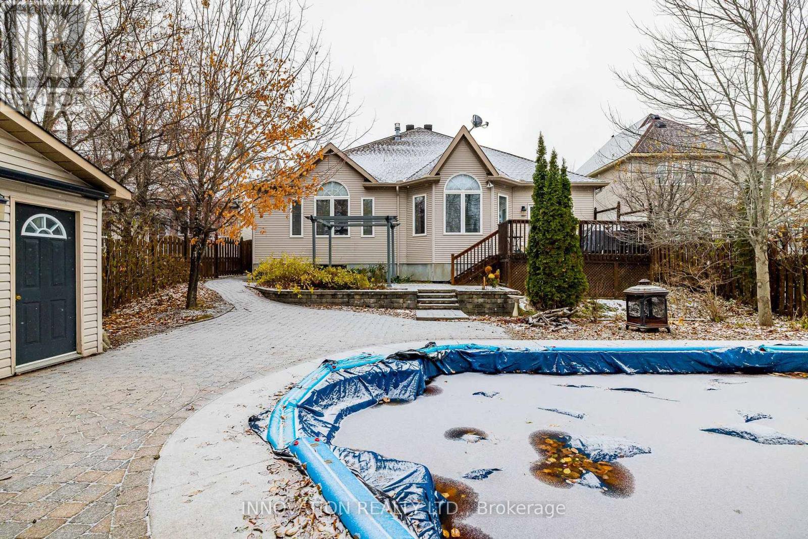 A Rare Find in Crossing Bridge - Premier Bungalow Living! Step into a well-built custom bungalow blending main-floor ease, smart accessibility features, and a highly desirable Crossing Bridge address. Wide hallways, 36" doorways, and exterior ramps support living at every life stage, framed by an oversized, beautifully landscaped lot. Inside, the grand open layout suits modern living and entertaining. The bright family room-with cathedral ceiling and cozy gas fireplace-flows into a generous eat-in kitchen. Granite counters, deep pot drawers, extensive pantry cabinetry, and high-end stainless steel appliances (including a Monogram gas stove with commercial-grade hood) make cooking a joy. A separate dining room welcomes family meals, shared laughter, and celebrations.The front bedroom serves as a home office, while the private primary suite boasts a walk-in closet and spa-like 4-piece ensuite with corner tub and separate shower. The second bedroom has cheater access to the second full bathroom; both feature durable granite countertops. A practical mudroom with direct ramp access from the garage ensures daily convenience. Summers shine here in the fully fenced backyard: interlock patios, heated saltwater pool (consistent 4'6" depth), pool house with retractable awning, and pergola-perfect for quiet mornings, family play, or warm summer evenings with friends. The lower level, with bathroom rough-in, offers potential for a gym, home theatre, games area, and generous storage. Bungalows of this size, quality, and condition rarely come available in Crossing Bridge. Enjoy spacious main-floor living steps from parks, pathways, restaurants, schools, and amenities in this friendly, community-focused neighbourhood. (A/C 2020, pool liner 2024, GAF roof 2016, Monogram stove 2022, front lawn irrigation )