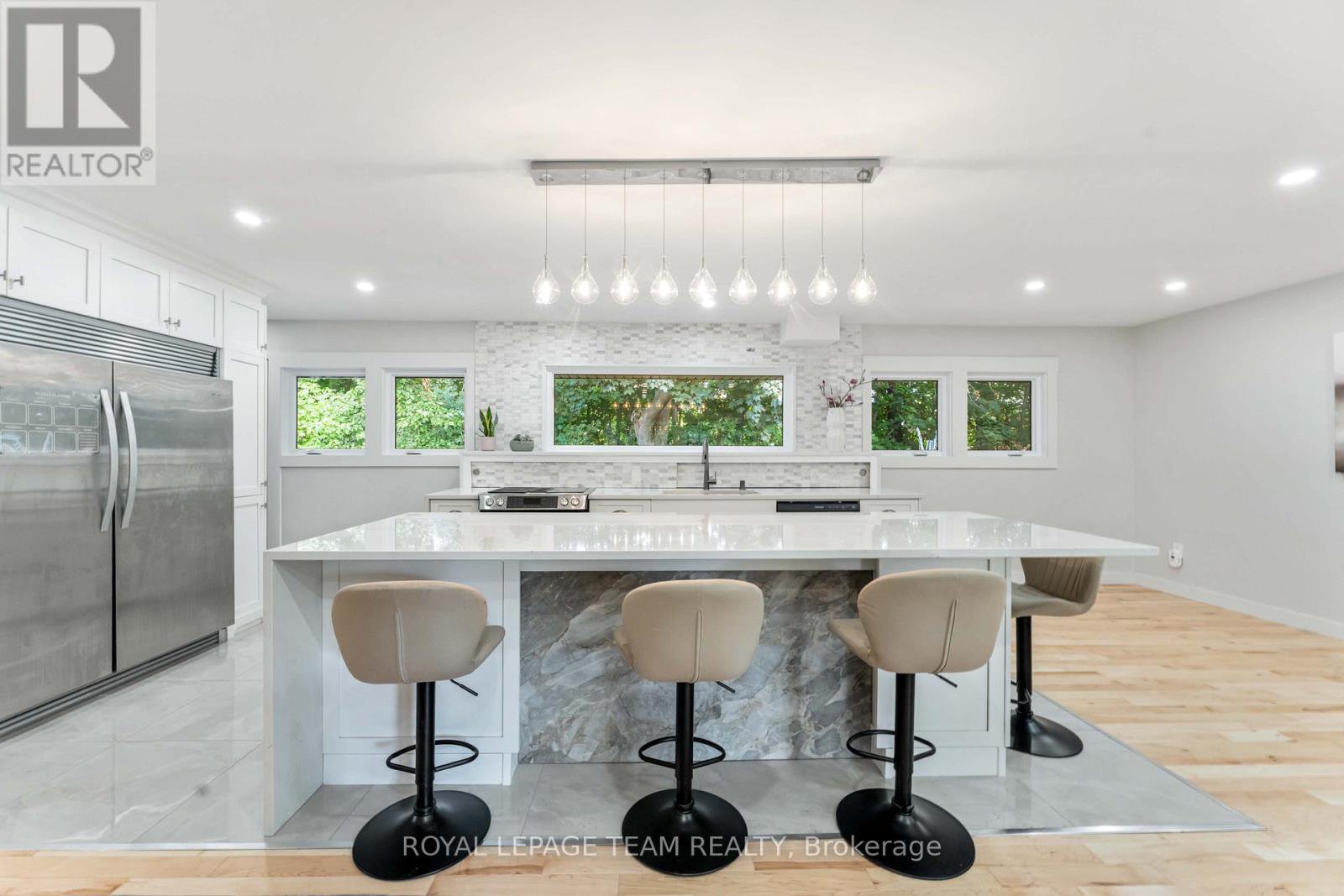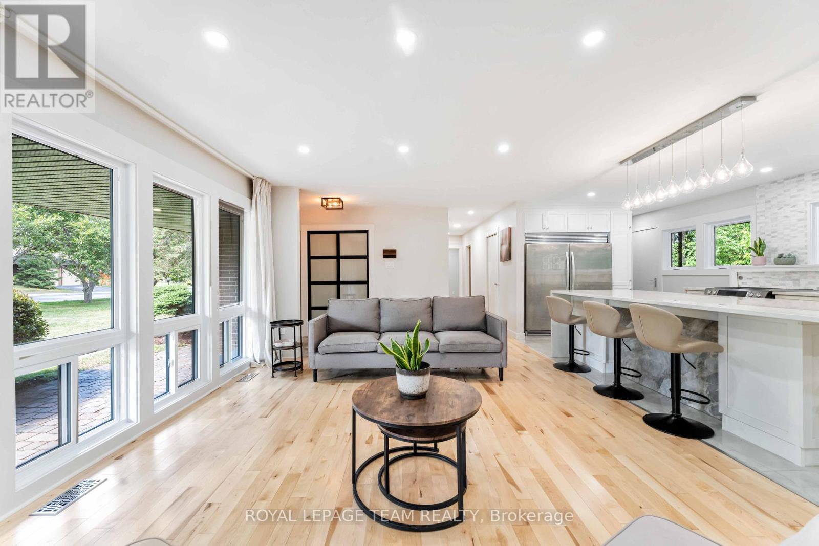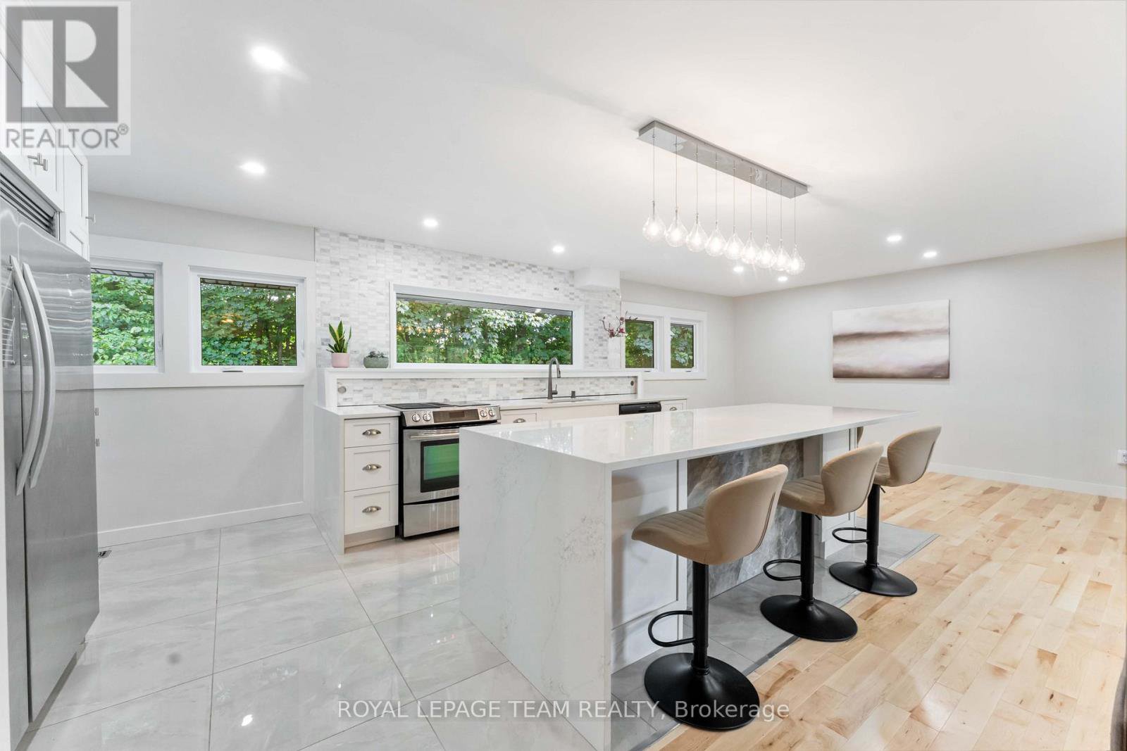Renovated, refined, and perfectly placed on a private treed lot w/no rear neighbors! This exceptional bungalow backs onto peaceful parkland in the heart of Beaverbrook-one of Kanata's most sought-after enclaves known for its treed streets, top schools, and unbeatable walkability. Offering over 2,300 sq ft of beautifully finished living space, this home has been completely transformed with modern style and thoughtful design throughout. The warm open-concept main floor features new maple hardwood, designer tile, fresh paint, new windows, and an easy natural flow. At the centre of the home sits a showpiece kitchen with a breathtaking picture window framing the stunning treed backdrop, complemented by quartz waterfall counters and sleek new cabinetry. The main level also includes convenient laundry, a bright living room with a LED feature electric fireplace, chic updated bathrooms, ensuite bath, and three comfortable bedrooms with generous closets. The lower level offers exceptional flexibility with in-law suite or rental potential. Complete with a kitchenette, 3pc bathroom, a massive 23' bedroom with double closets, rough-in for laundry, new luxury vinyl plank flooring, a large storage room, and direct access to the private backyard-ideal for multi-generational living or guests. Outside, enjoy a peaceful yard with no rear neighbours, backing directly onto mature trees with access to Gow Park and Stephen Leacock School. Perfect for summer BBQs, playtime, or quiet evenings surrounded by nature. All of this in Beaverbrook- home to top-rated schools, scenic walking paths, community pools, tennis courts, the Kanata Leisure Centre, lush parks, nearby transit, and quick access to the Kanata high-tech hub, Kanata Centrum, and the future LRT. Immediate possession available. Renovated bungalows in settings like this are rarely offered. A must-see.
